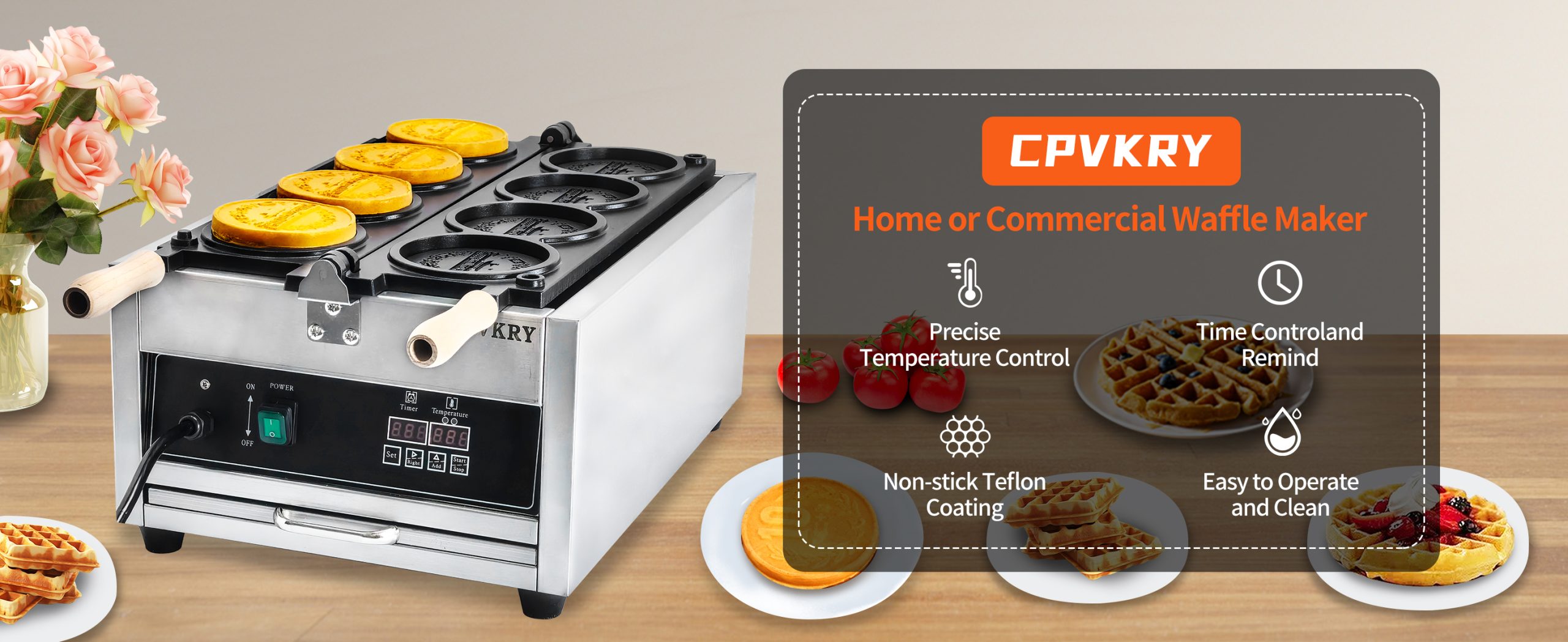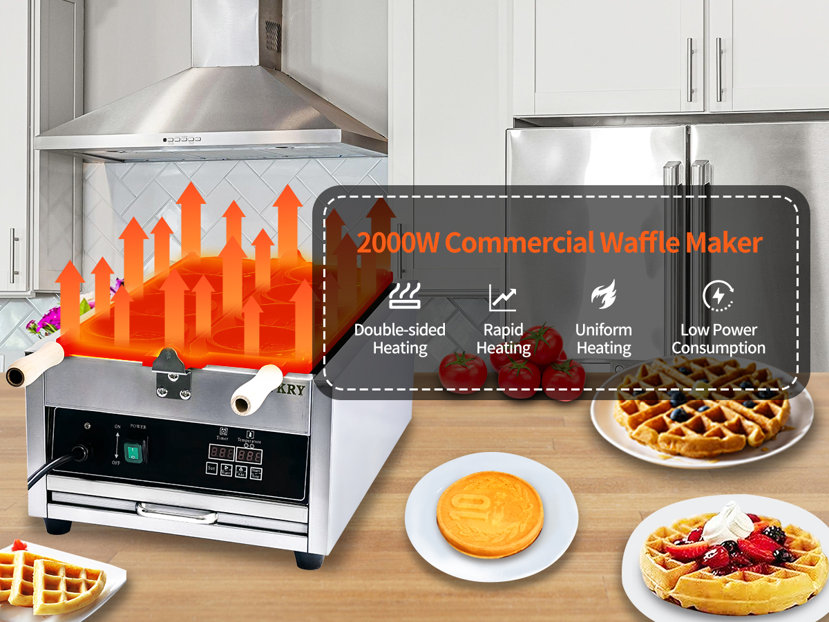 Our waffle maker adopts dual baking pans, with which 6 waffles can be cooked simultaneously. Double pans ensure even heating. Teflon coated surface facilitates non-stick cooking and keeps your place neat.