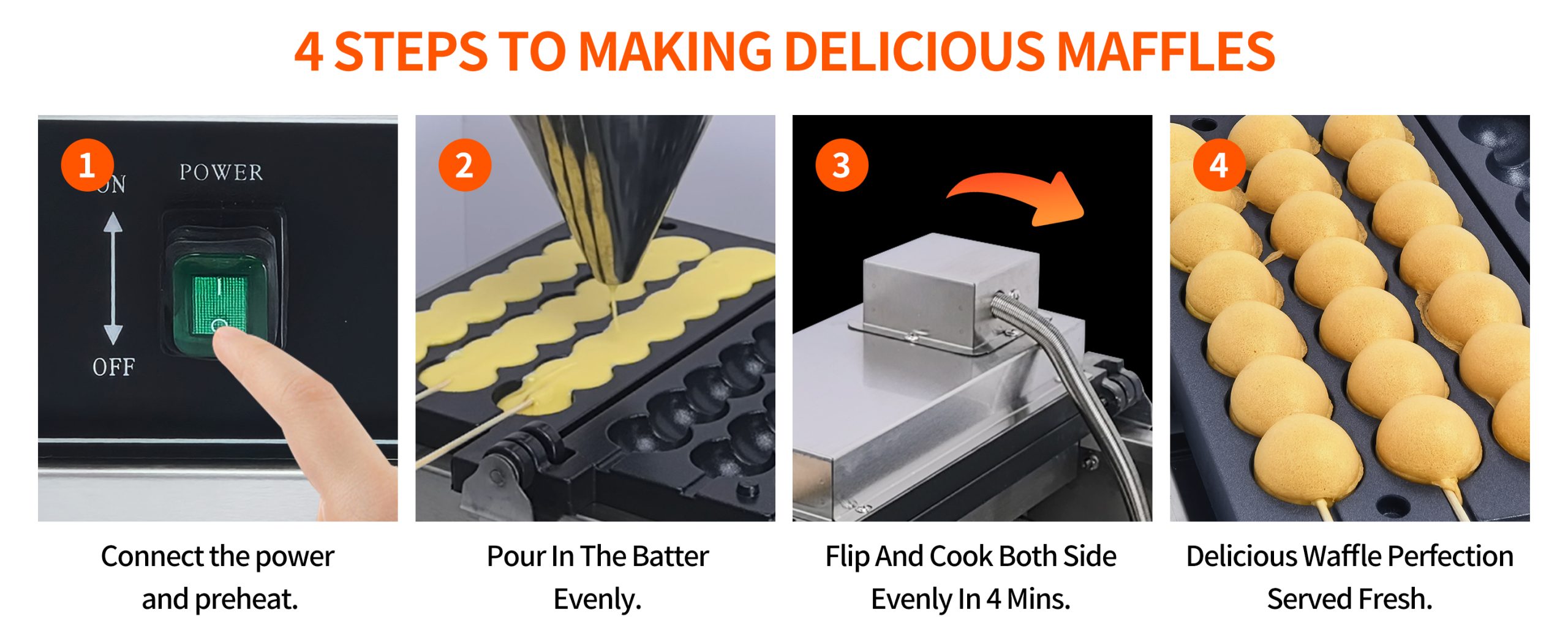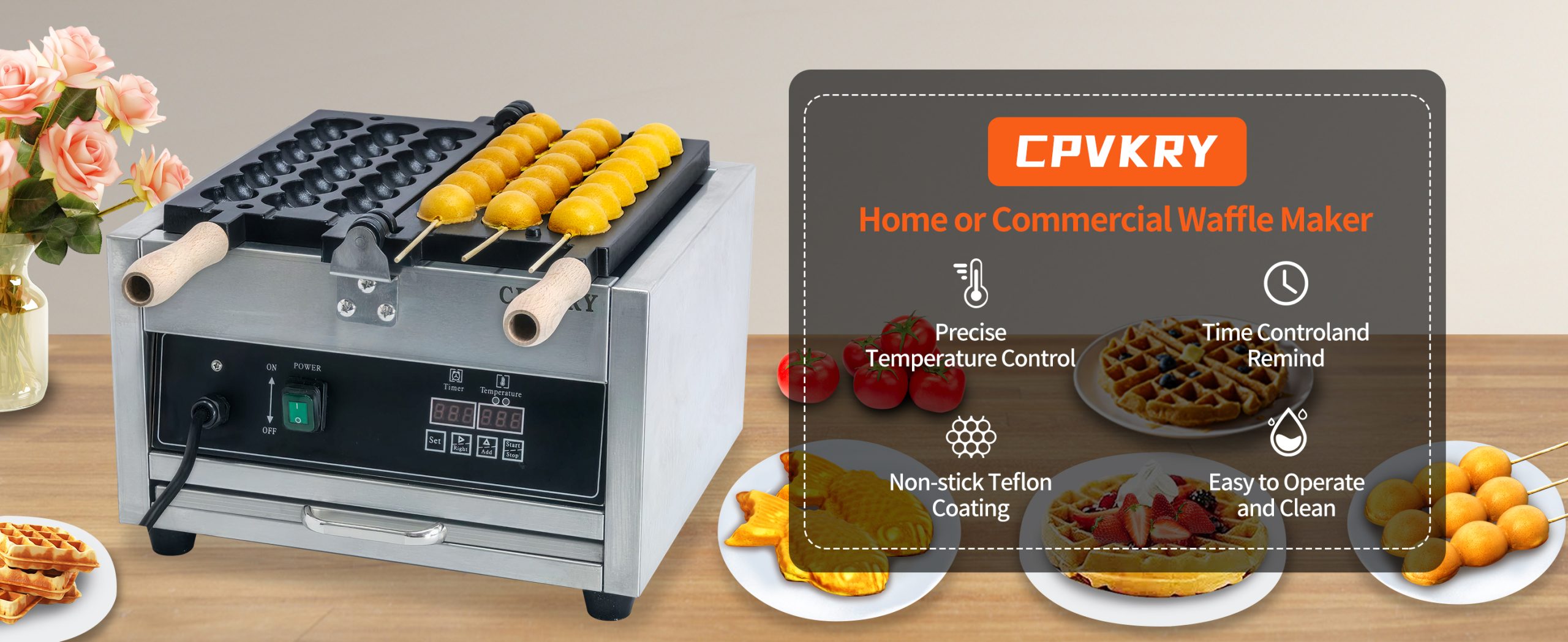 Smooth knobs for easy control of waffle maker. Temperature ranges from 50~300℃ with LED light showing heating status. Precise timer for up to 5 minutes’ period. Clear and melodious alarm when waffle is ready.