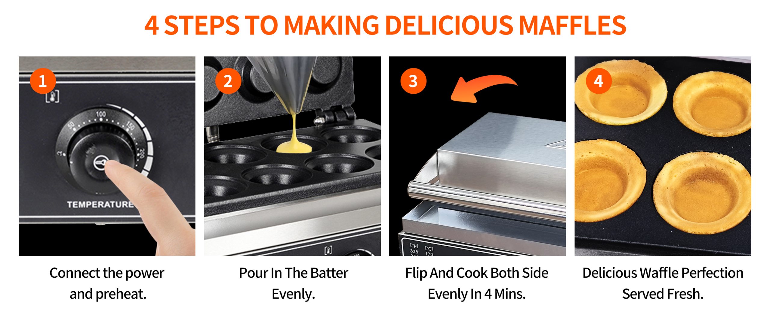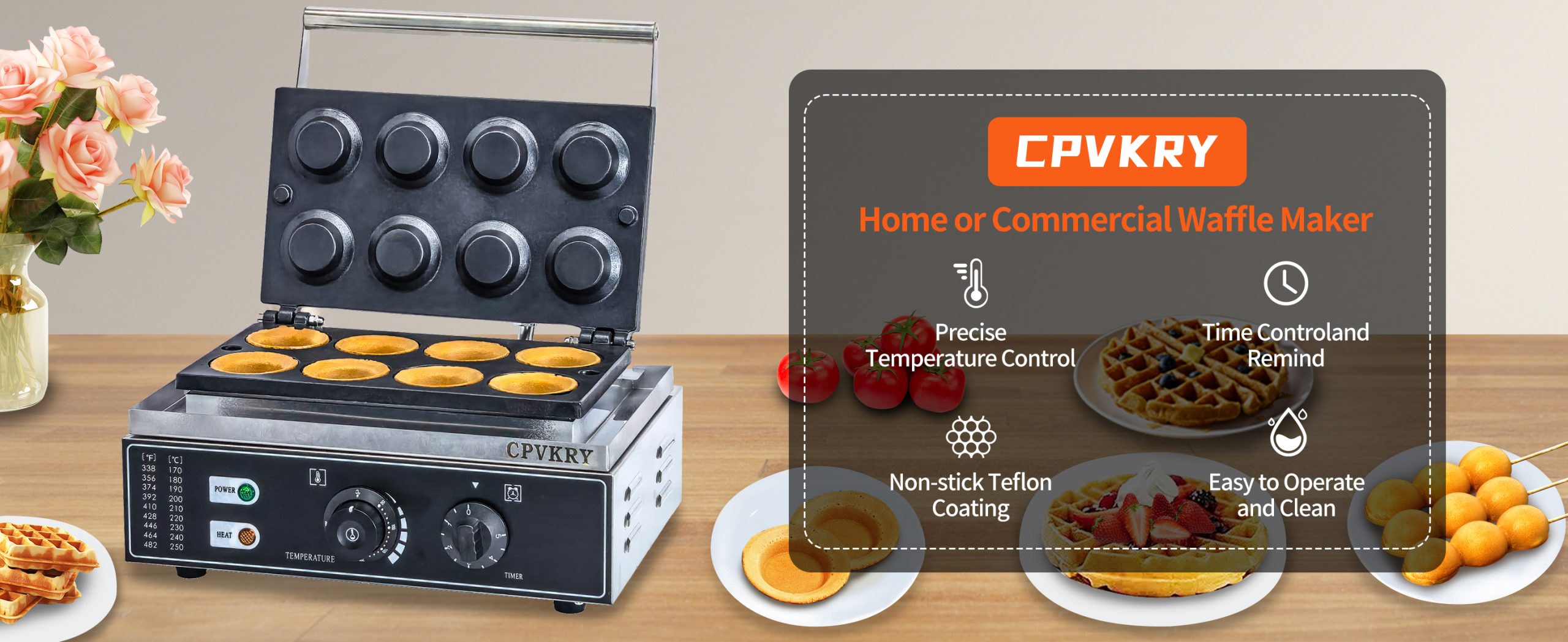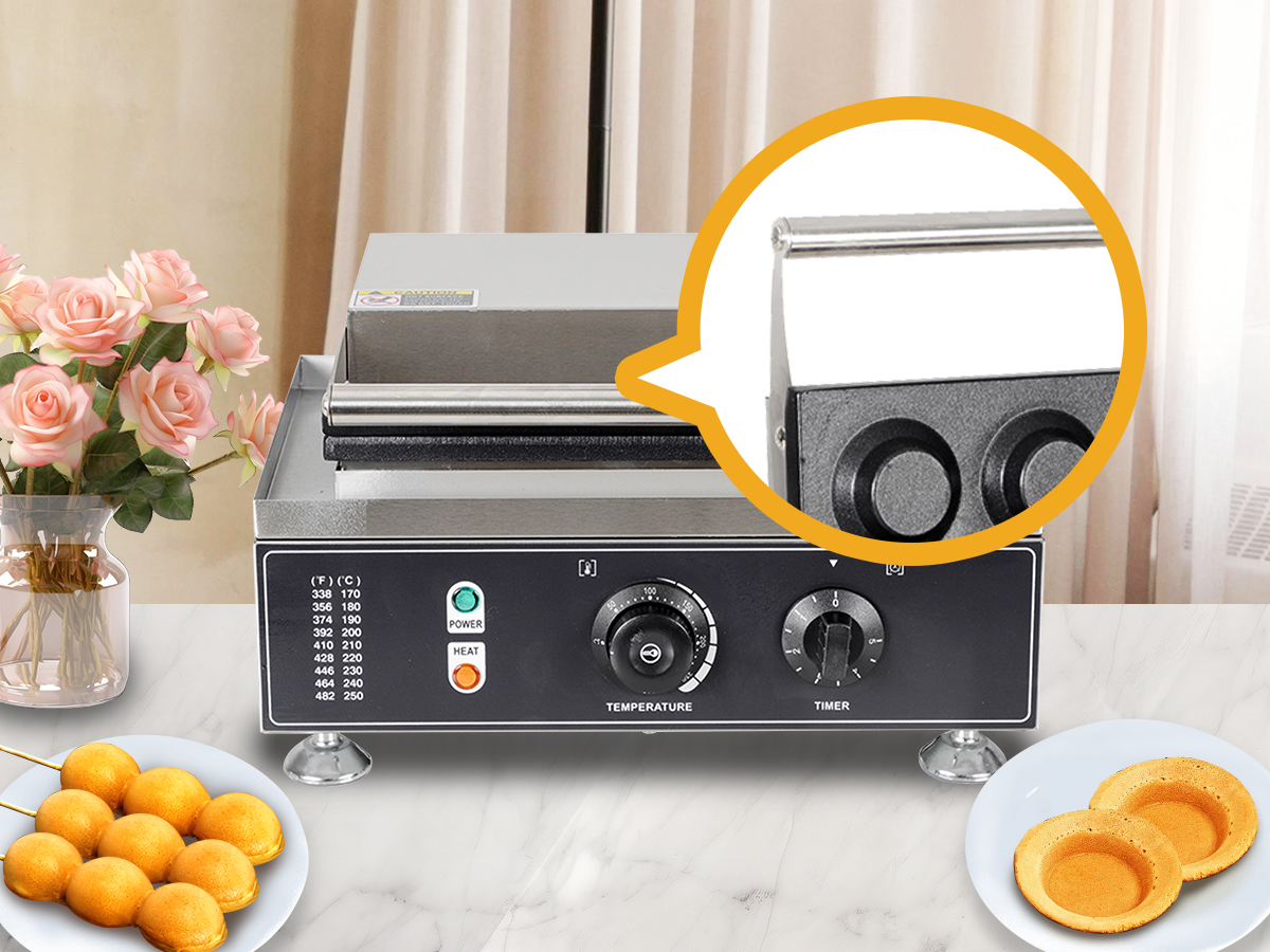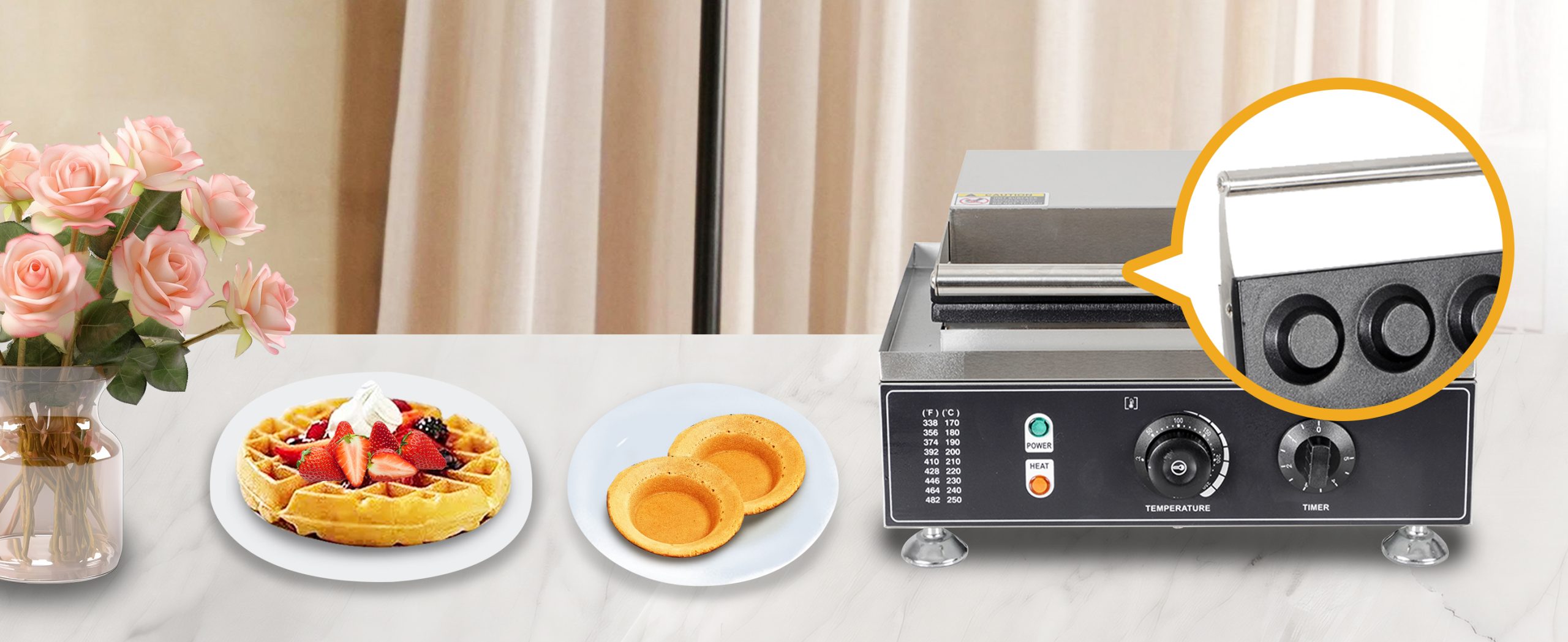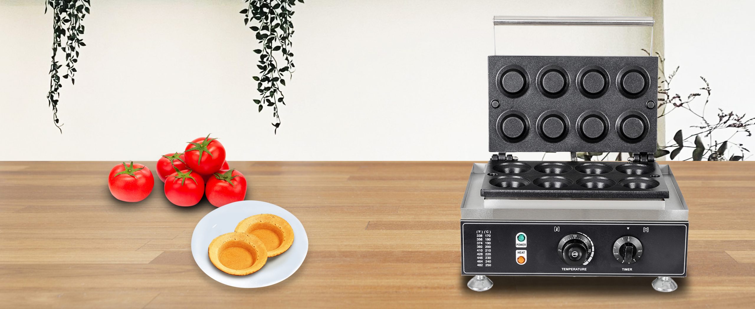 This unique industrial Egg Tart Crust Making waffle maker professional produces rotundity waffles with unique textures. It is equipped with a manually controlled thermostat and timer for more precise control, comfortable handles, You can use it at home with your family, or in cafe bars, restaurants, canteens, snack stations, etc.