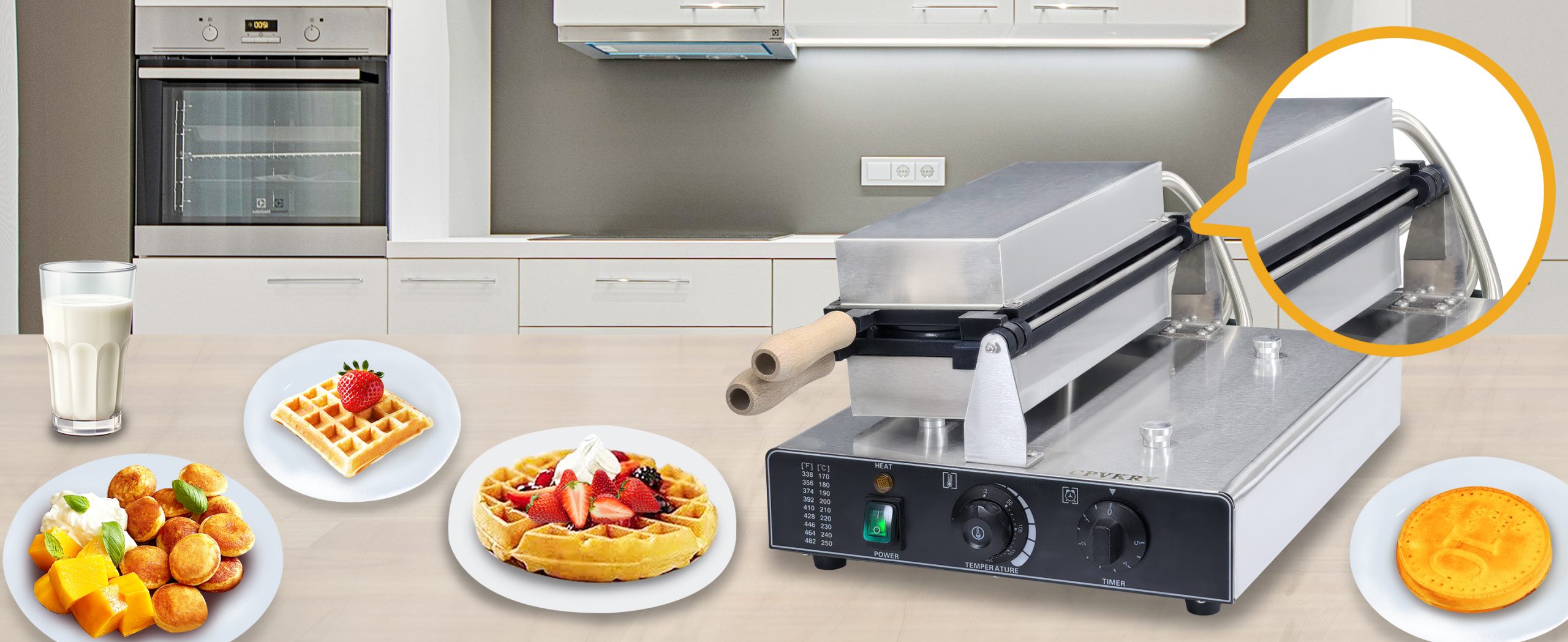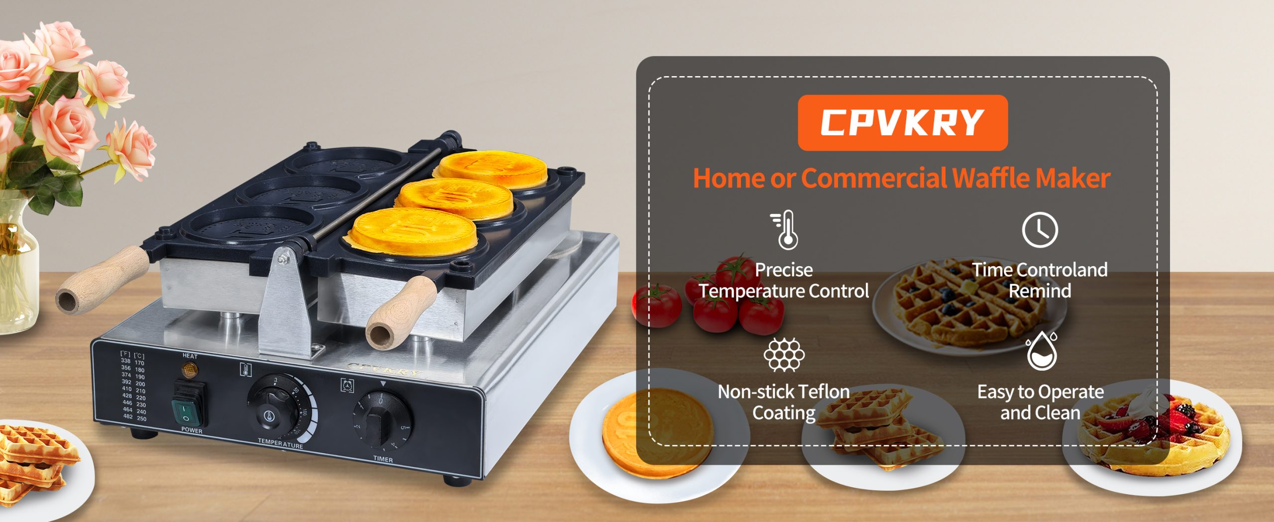 Smooth knobs for easy control of waffle maker. Temperature ranges from 50~300℃ with LED light showing heating status. Precise timer for up to 5 minutes’ period. Clear and melodious alarm when waffle is ready.
