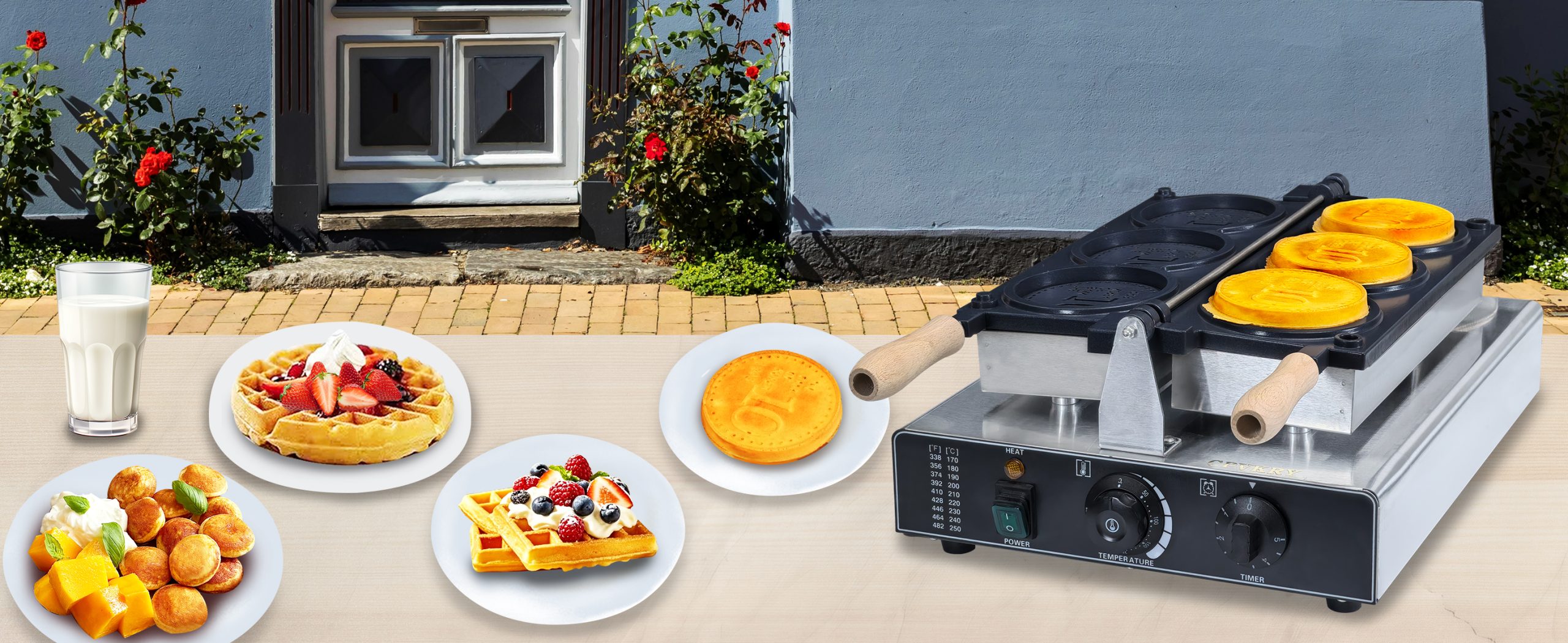 Baking delicious Korean coin shaped waffles. This commercial grade waffle machine is getting extremely popular all over the world because of its high efficiency and excellent results. Baking tasty jam or ice cream waffles with independent heat control extremely easy.