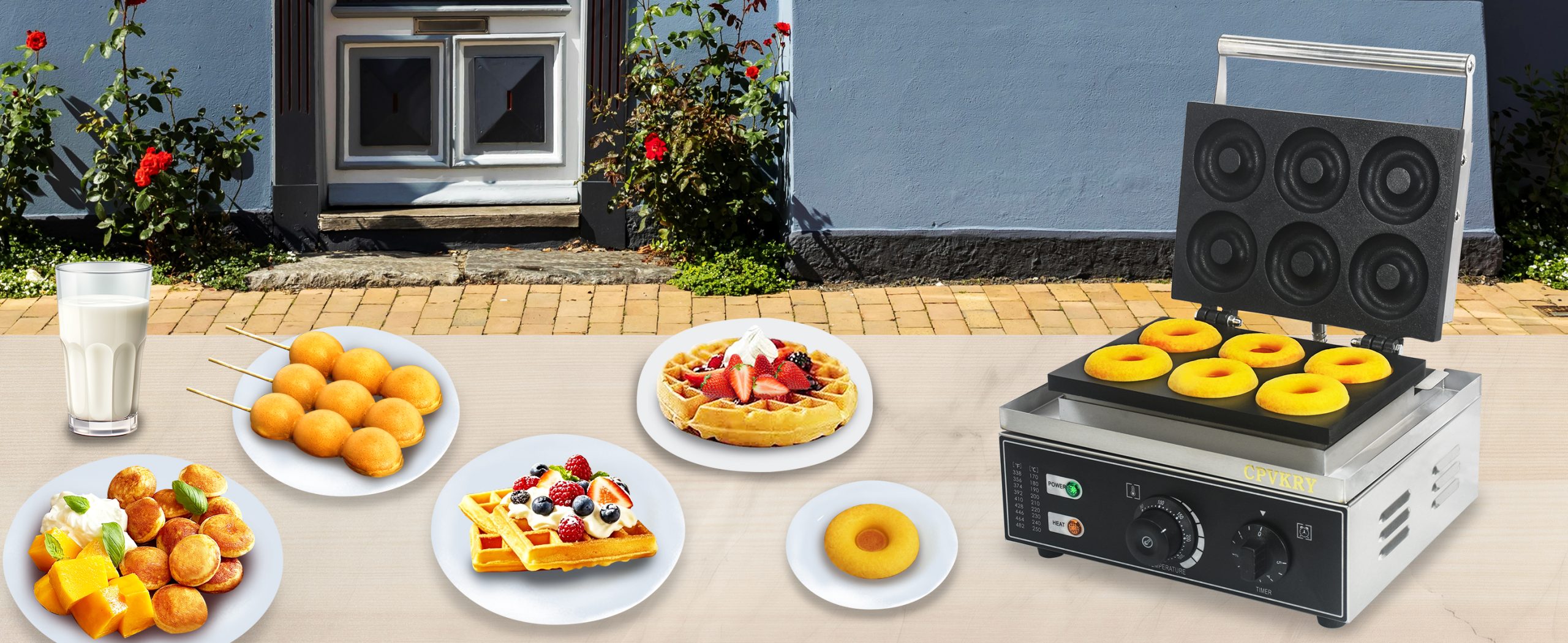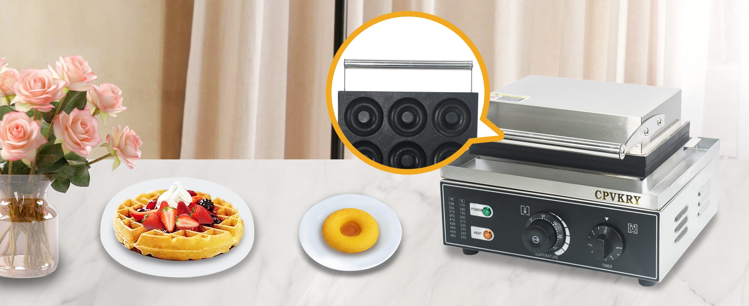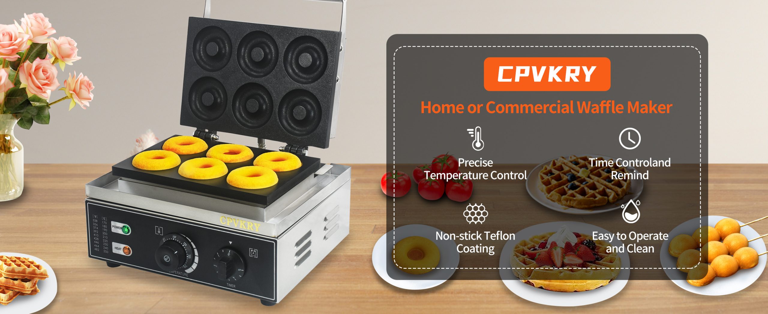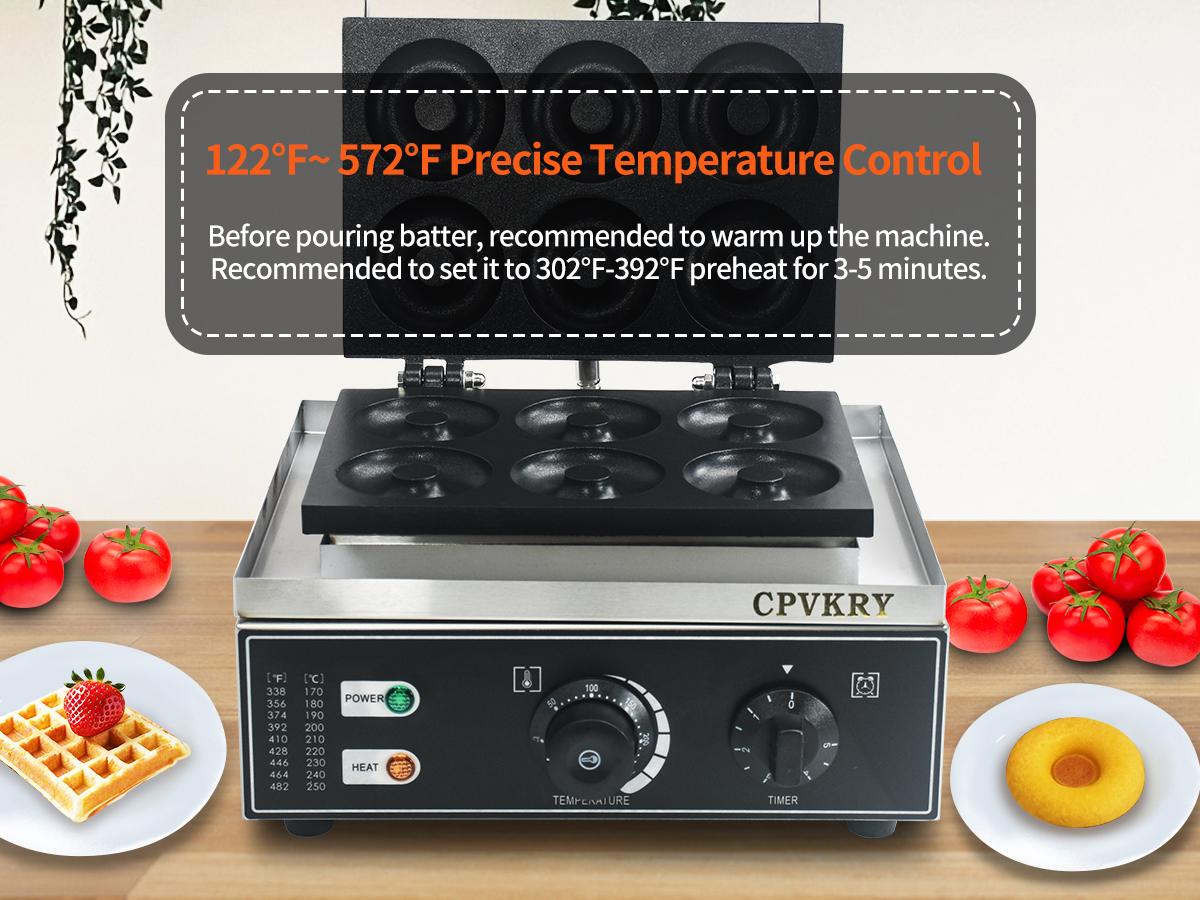 This unique industrial doughnut waffle maker professional produces rotundity waffles with unique textures. It is equipped with a manually controlled thermostat and timer for more precise control, comfortable handles, You can use it at home with your family, or in cafe bars, restaurants, canteens, snack stations, etc.