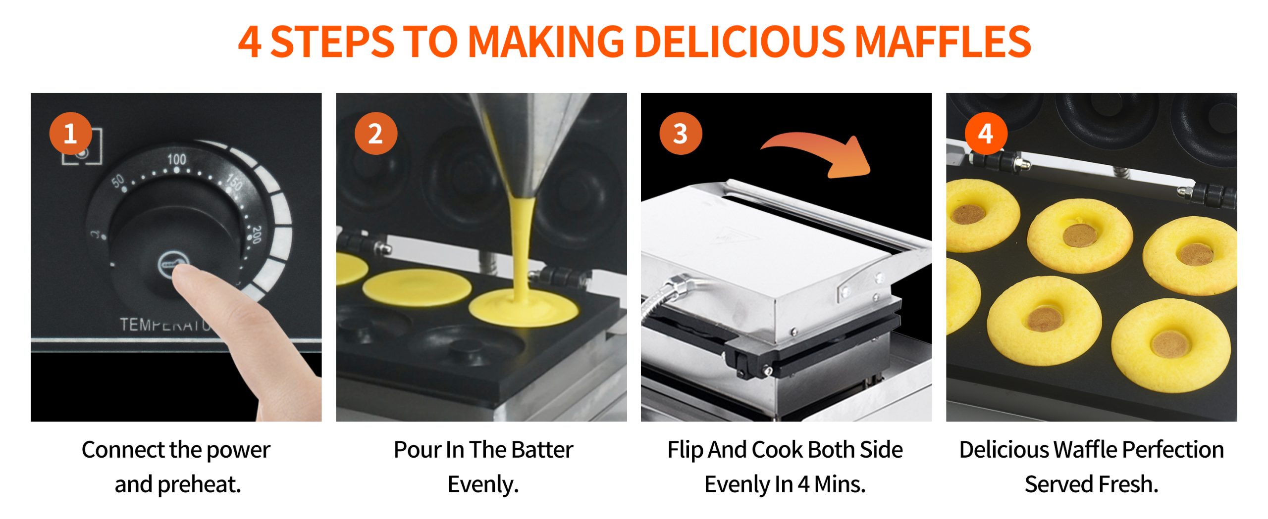 Smooth knobs for easy control of waffle maker. Temperature ranges from 50~300℃ with LED light showing heating status. Precise timer for up to 5 minutes’ period. Clear and melodious alarm when waffle is ready.