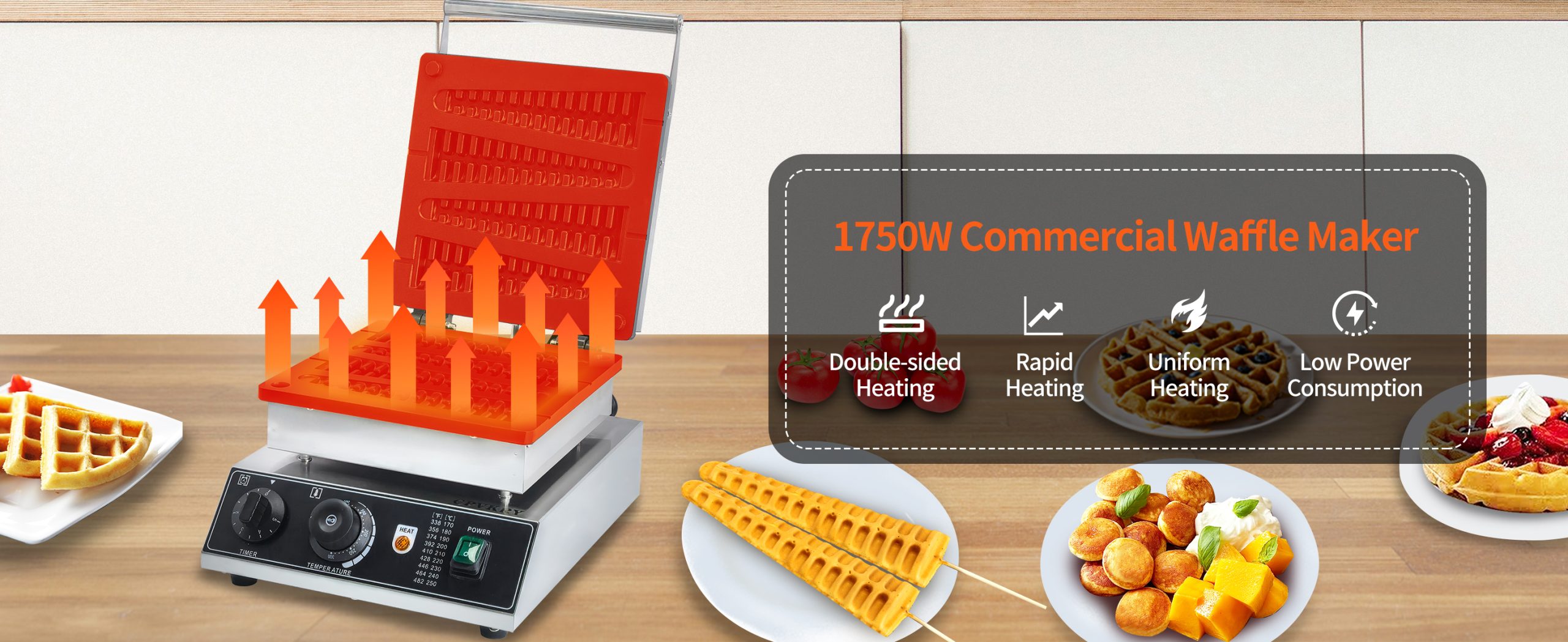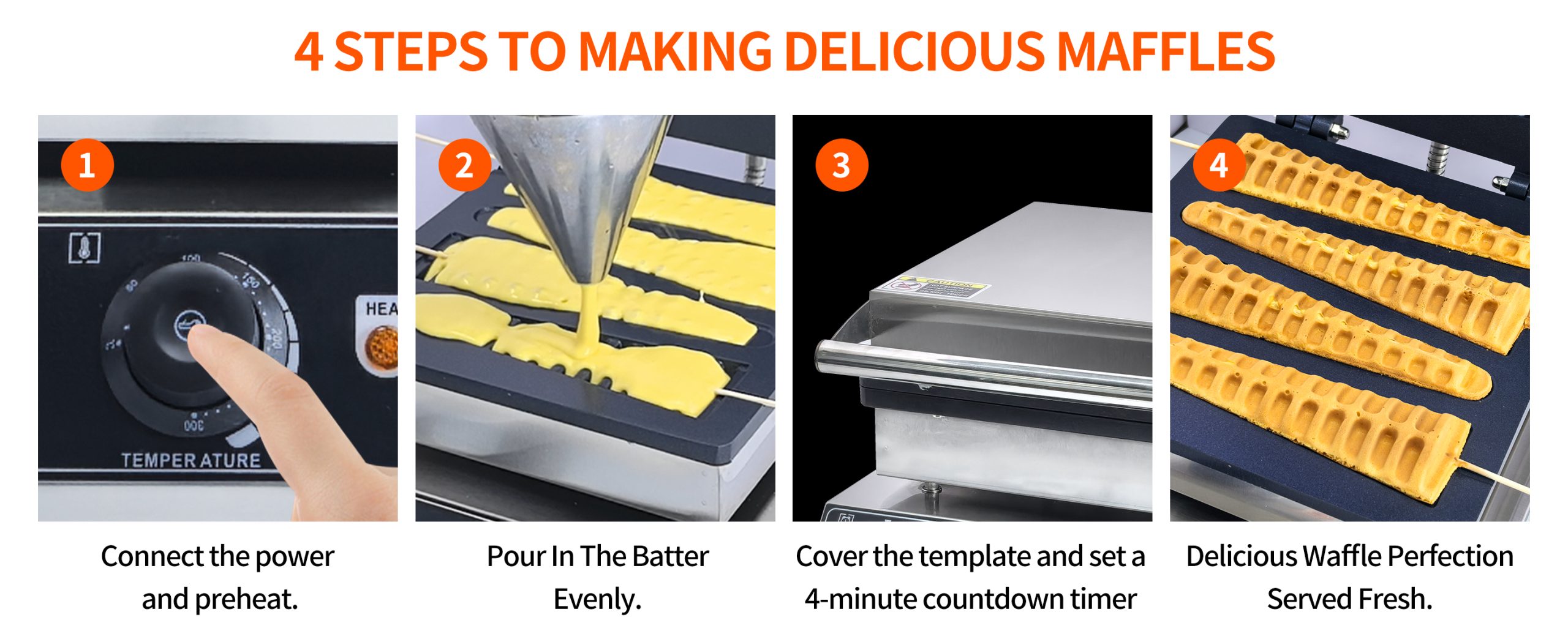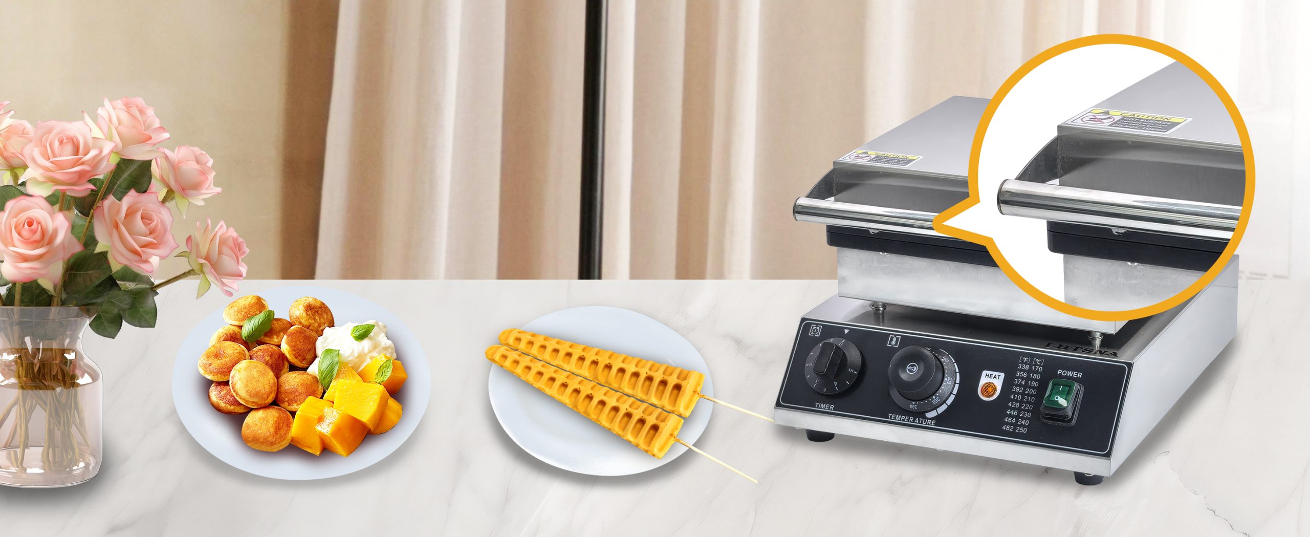 Smooth knobs for easy control of waffle maker. Temperature ranges from 50~300℃ with LED light showing heating status. Precise timer for up to 5 minutes’ period. Clear and melodious alarm when waffle is ready.