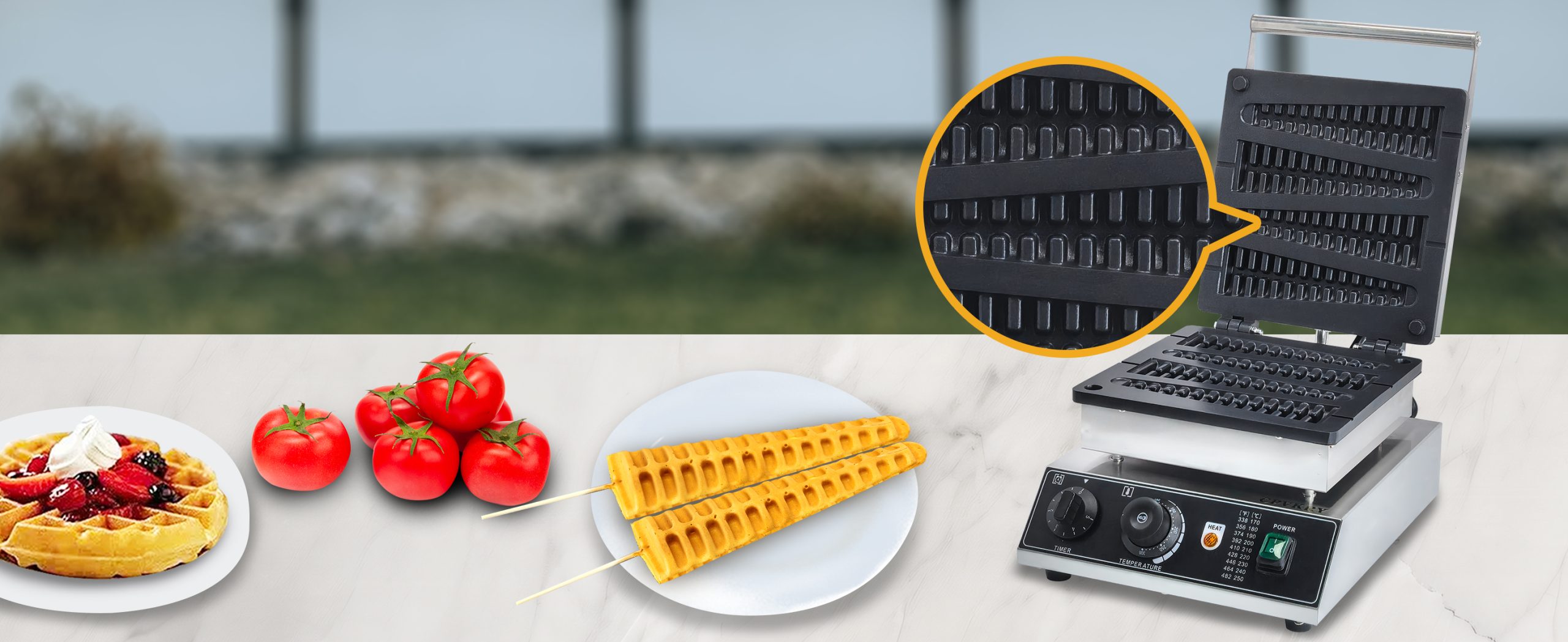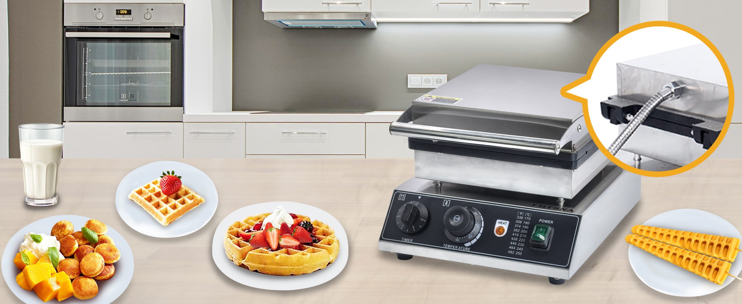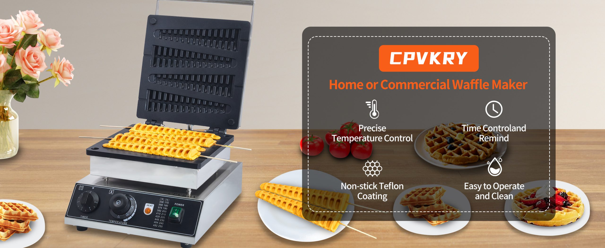 Smooth knobs for easy control of waffle maker. Temperature ranges from 50~300℃ with LED light showing heating status. Precise timer for up to 5 minutes’ period. Clear and melodious alarm when waffle is ready.