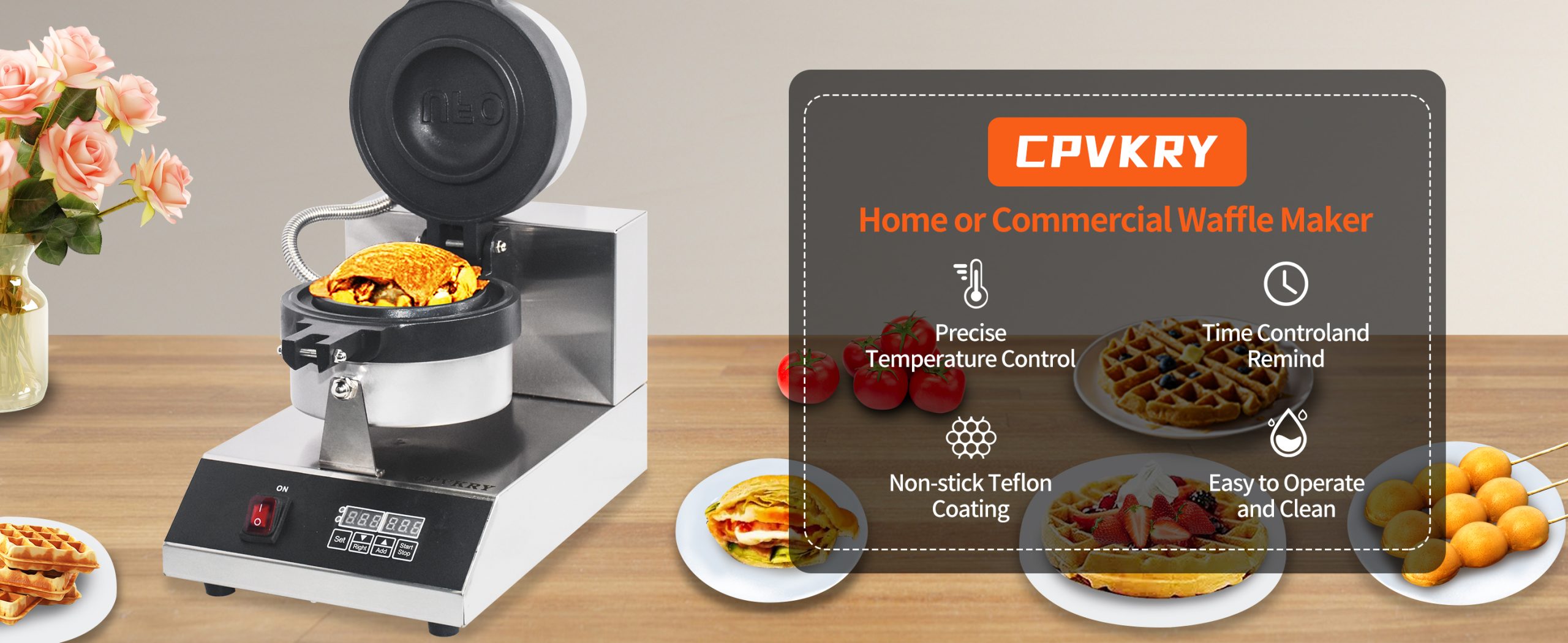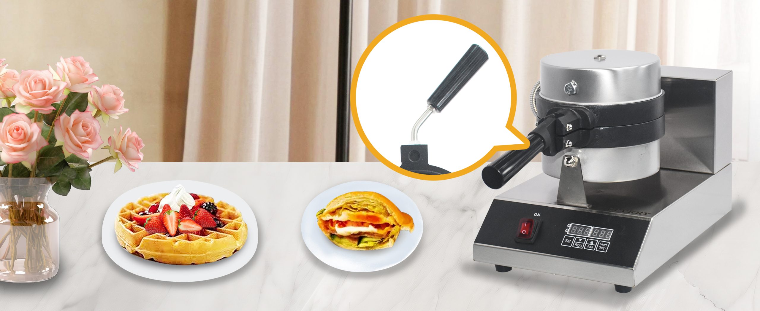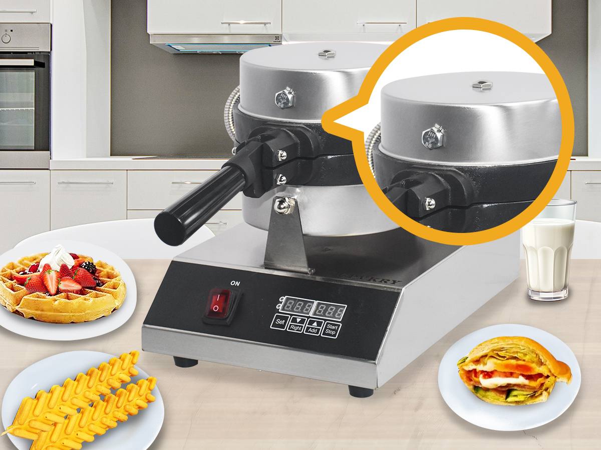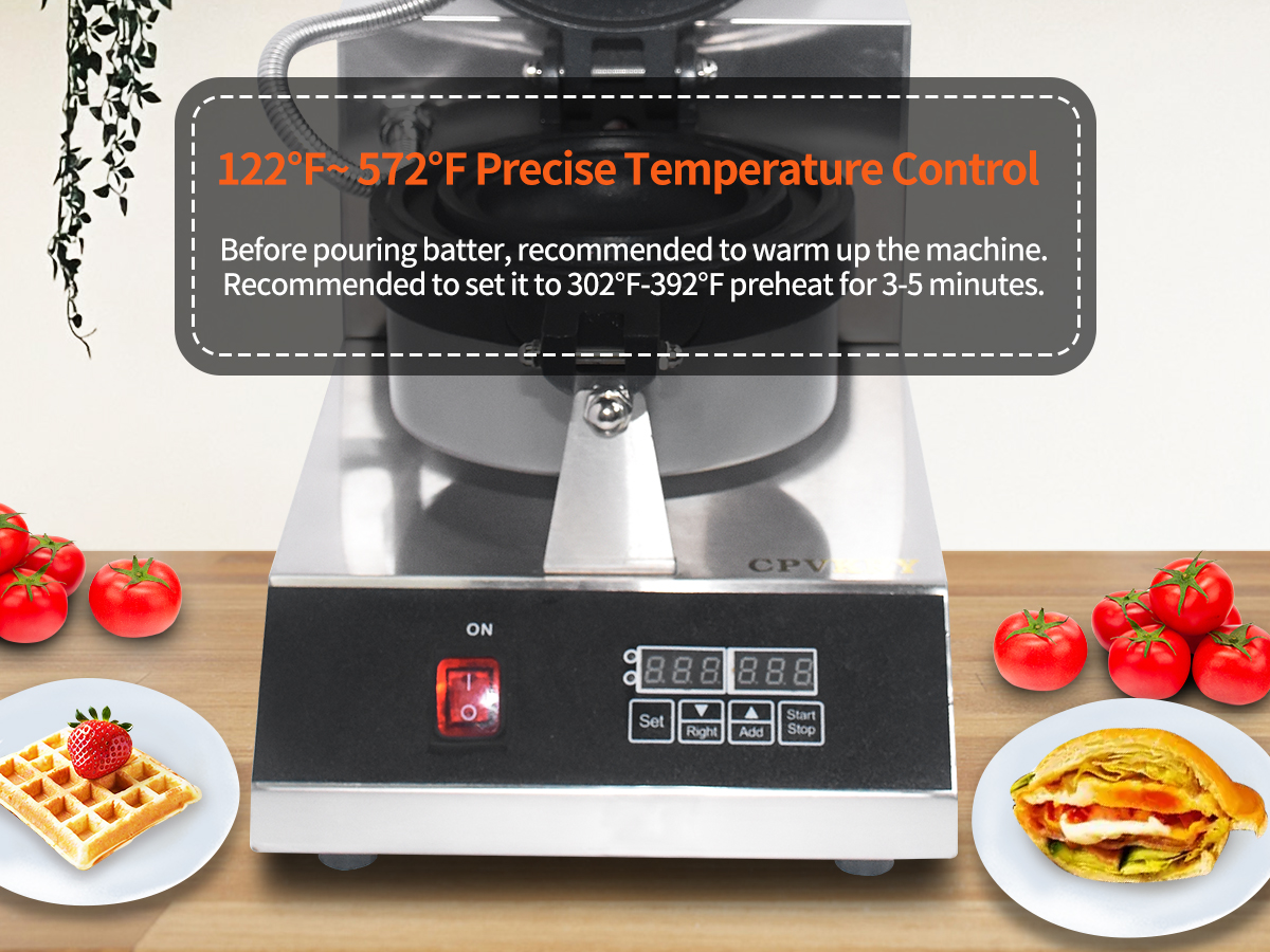 Smooth knobs for easy control of waffle maker. Temperature ranges from 50~300℃ with LED light showing heating status. Precise timer for up to 5 minutes’ period. Clear and melodious alarm when waffle is ready.