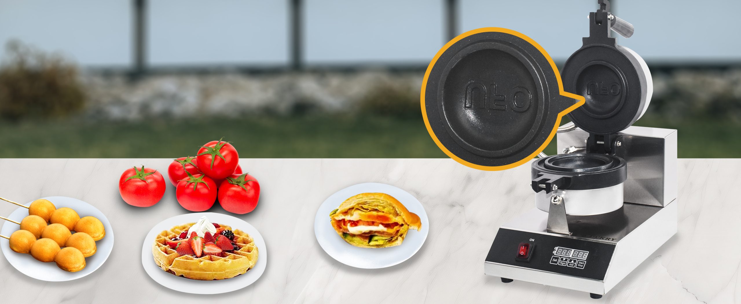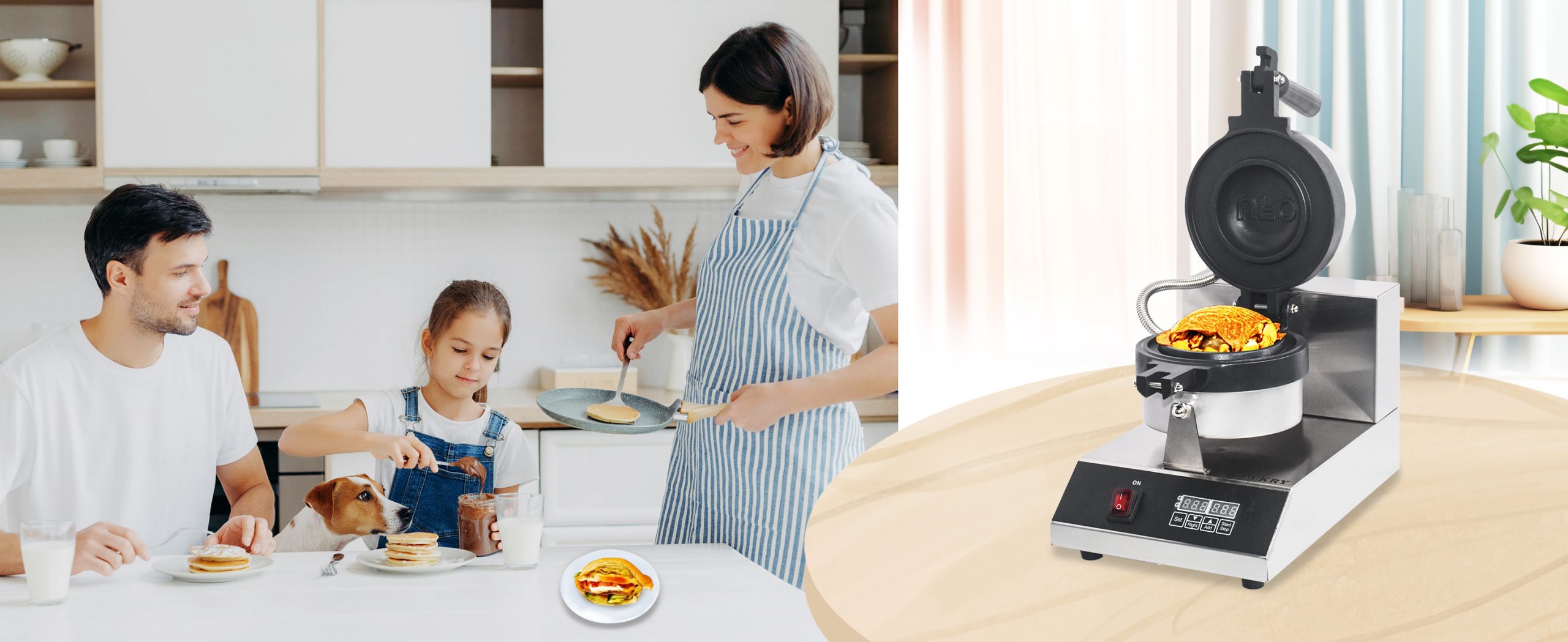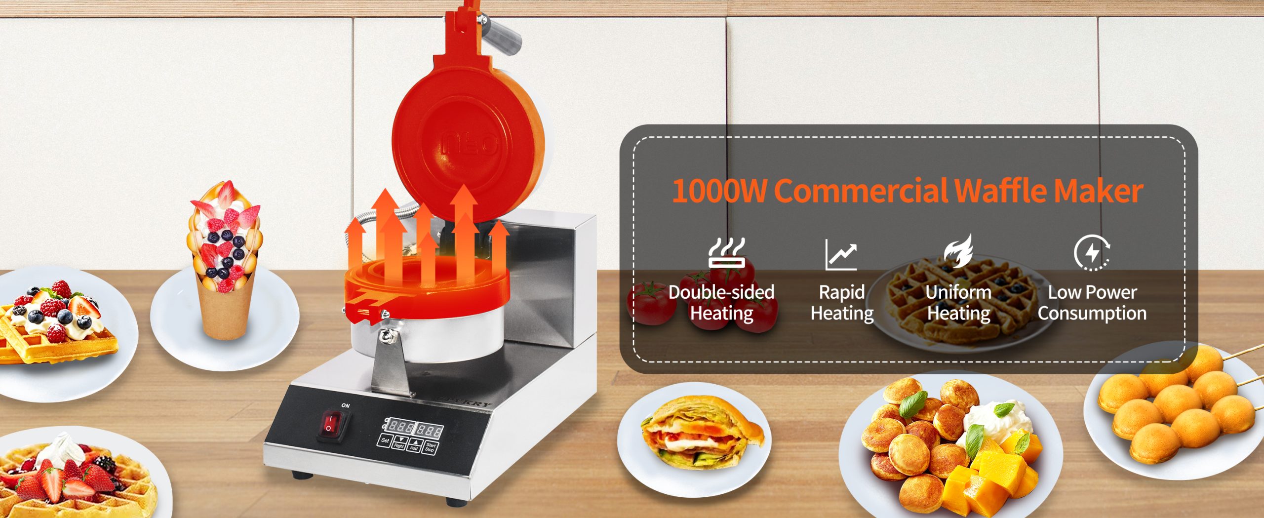 Smooth knobs for easy control of waffle maker. Temperature ranges from 50~300℃ with LED light showing heating status. Precise timer for up to 5 minutes’ period. Clear and melodious alarm when waffle is ready.