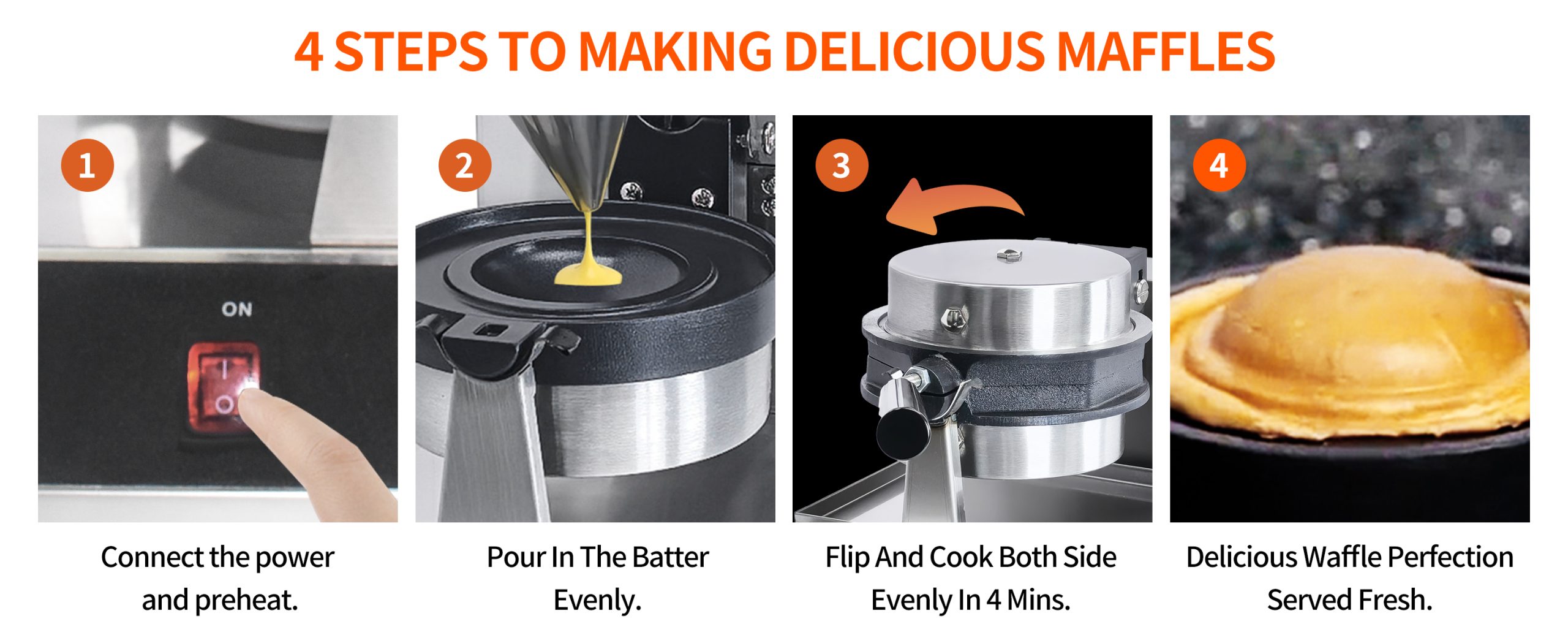Lockable Design – Fix the pan during baking.Raised Edges -Keep all the batter in.180°Rotatable Pans -Bake waffles uniformly.