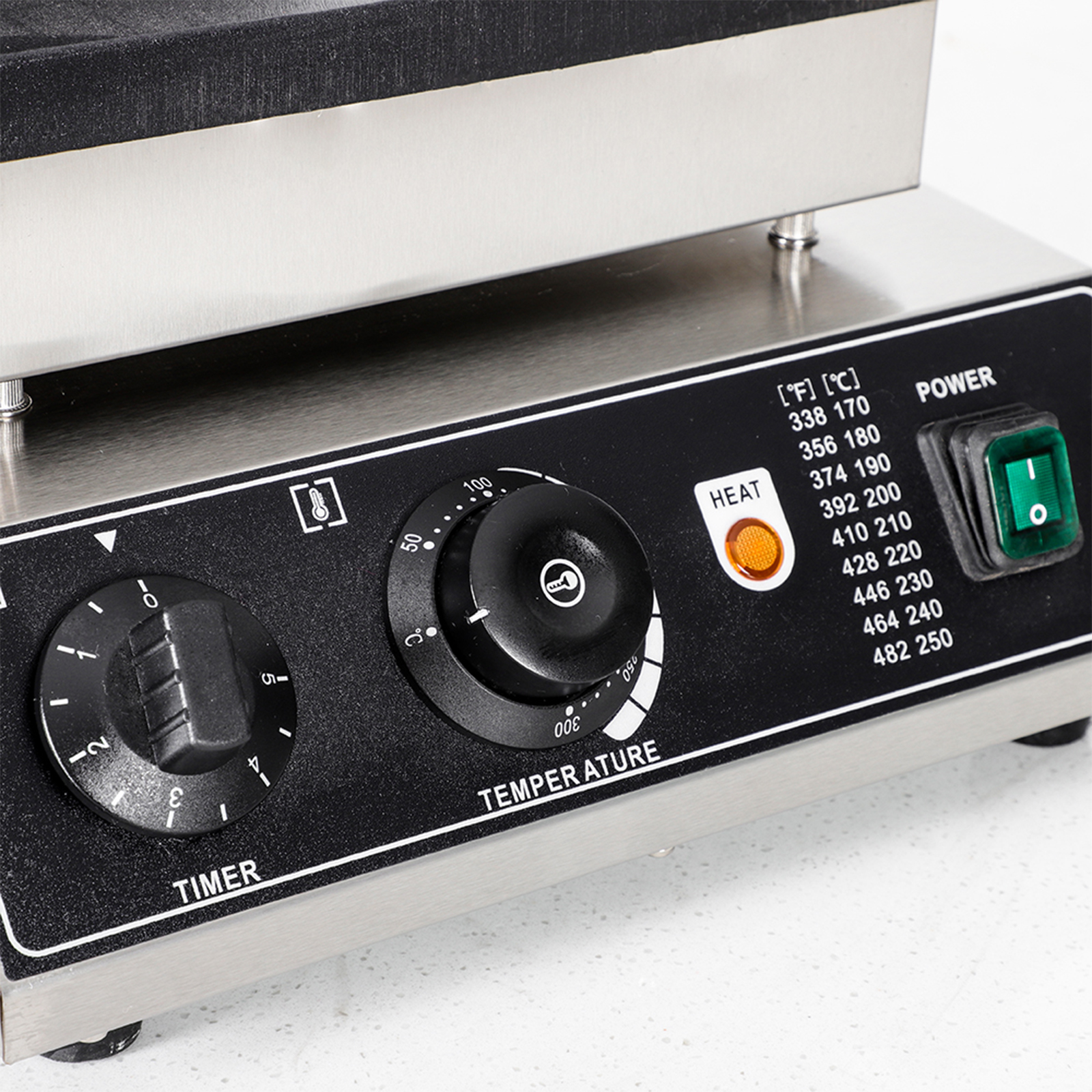 Smooth knobs for easy control of waffle maker. Temperature ranges from 50~300℃ with LED light showing heating status. Precise timer for up to 5 minutes’ period. Clear and melodious alarm when waffle is ready.