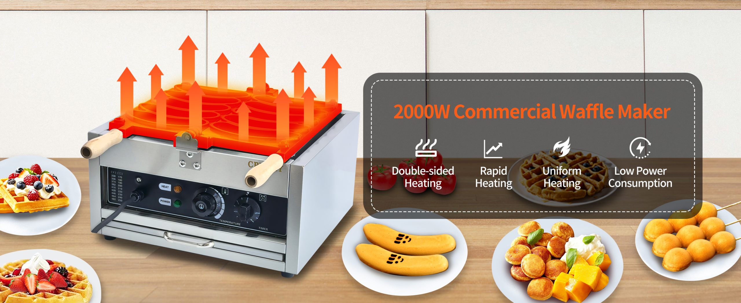 Smooth knobs for easy control of waffle maker. Temperature ranges from 50~300℃ with LED light showing heating status. Precise timer for up to 5 minutes’ period. Clear and melodious alarm when waffle is ready.