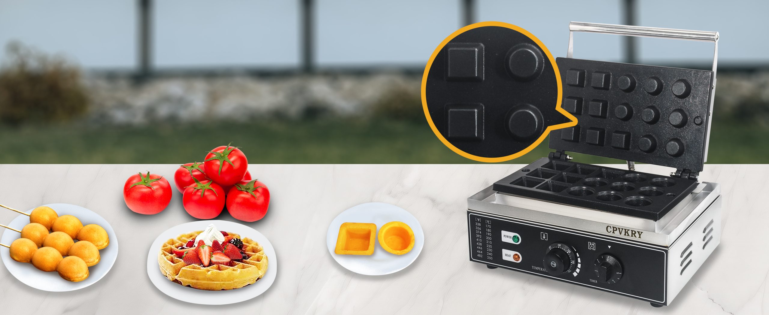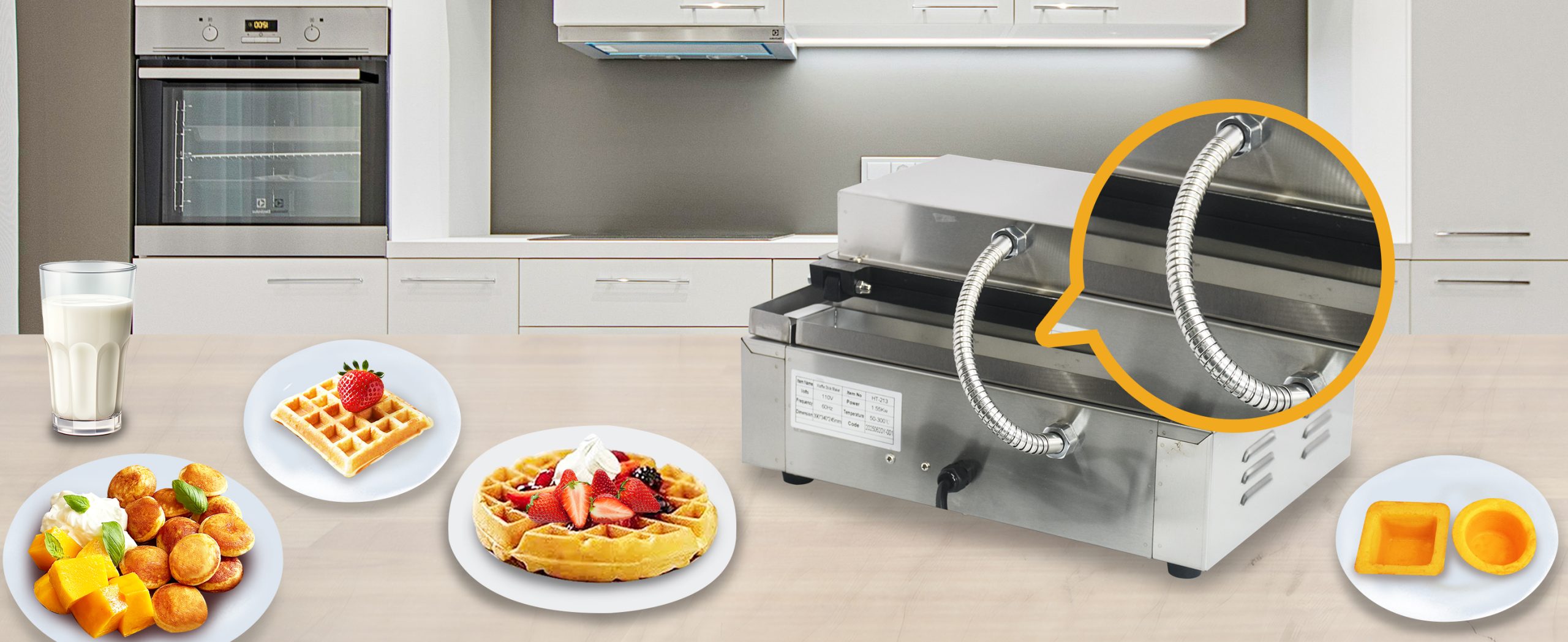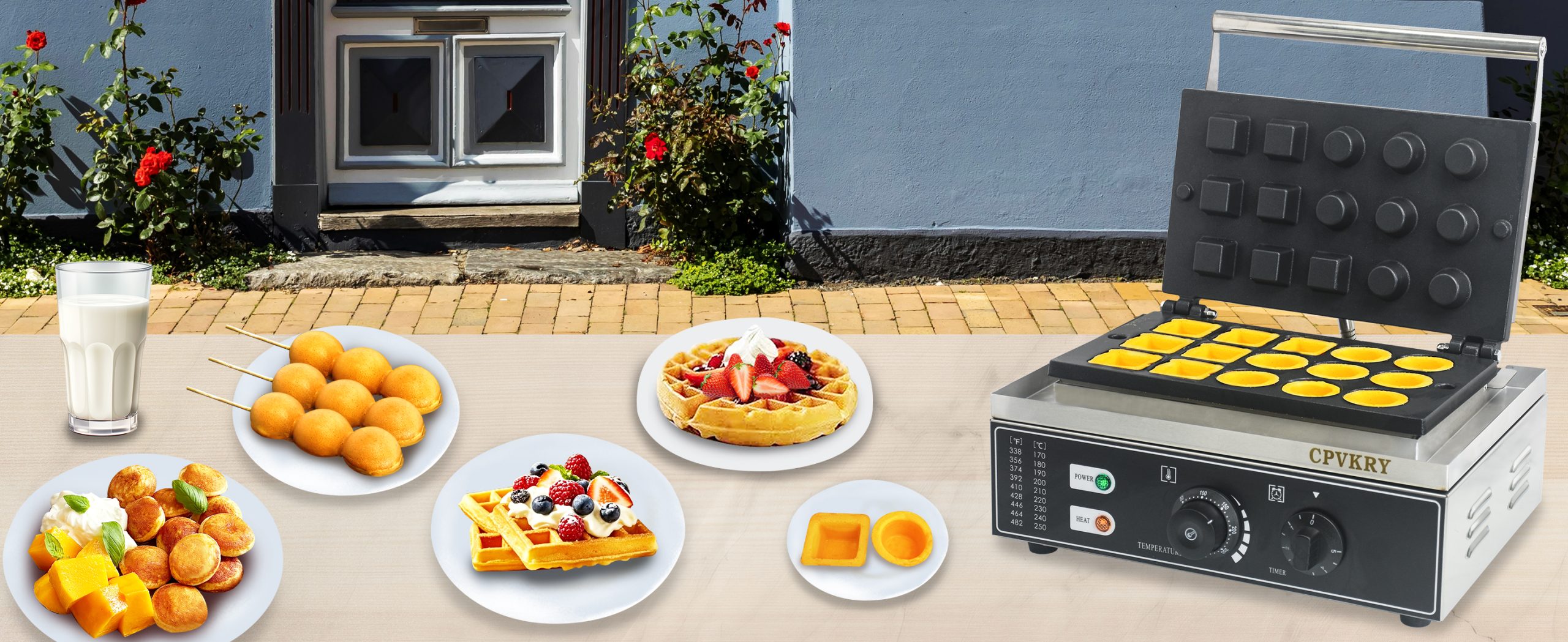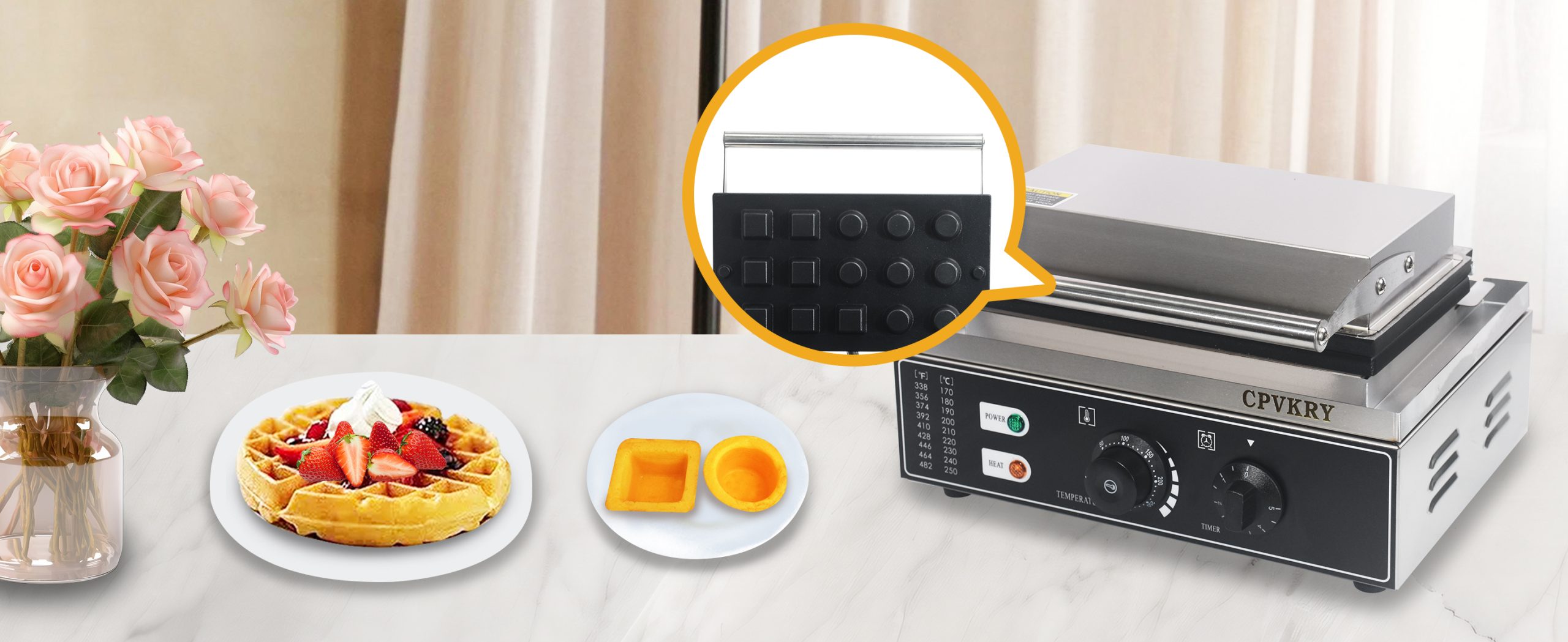 This unique industrial Mini Grid waffle maker professional produces rotundity waffles with unique textures. It is equipped with a manually controlled thermostat and timer for more precise control, comfortable handles, You can use it at home with your family, or in cafe bars, restaurants, canteens, snack stations, etc.