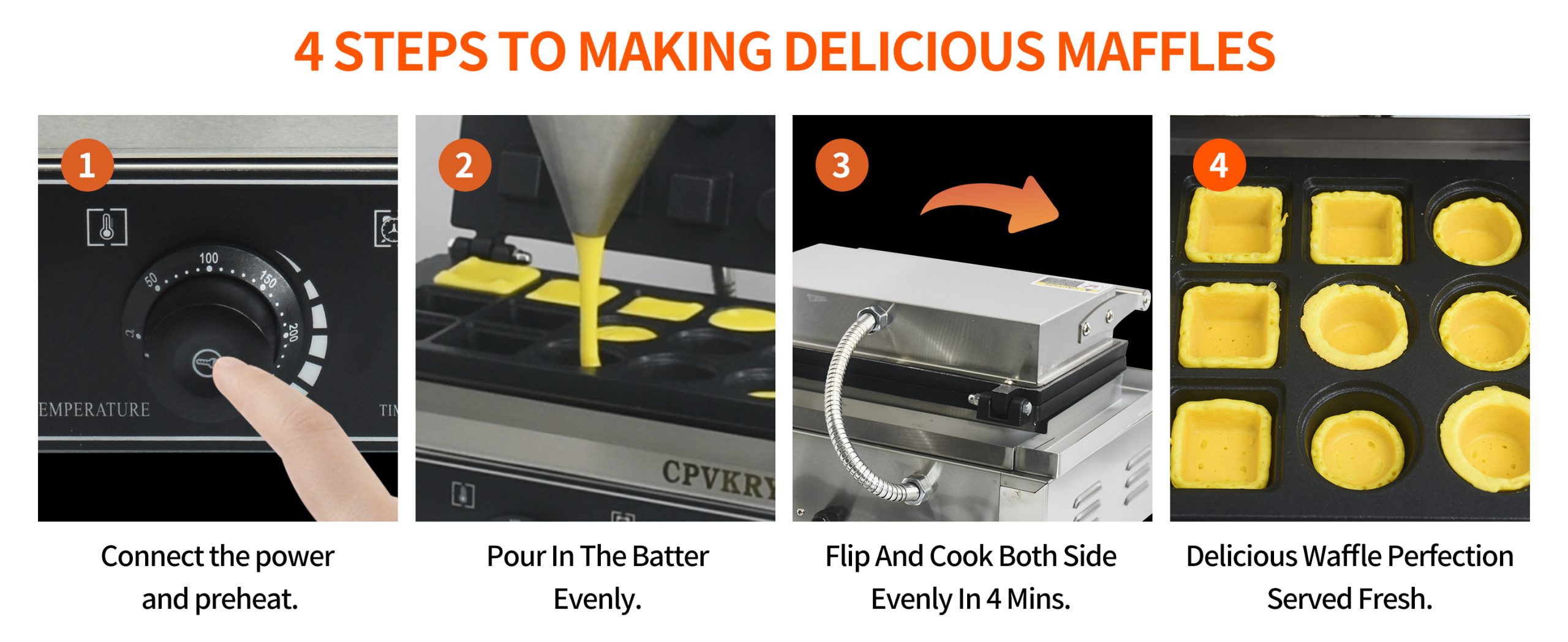 Smooth knobs for easy control of waffle maker. Temperature ranges from 50~300℃ with LED light showing heating status. Precise timer for up to 5 minutes’ period. Clear and melodious alarm when waffle is ready.