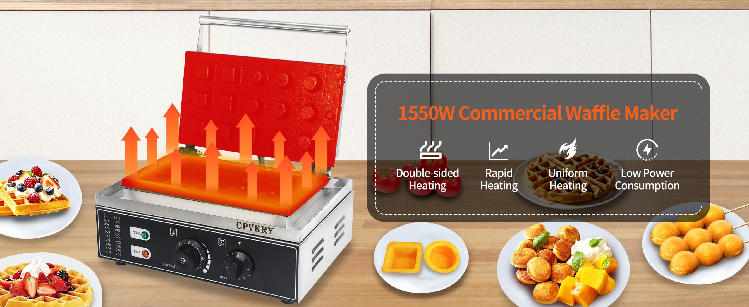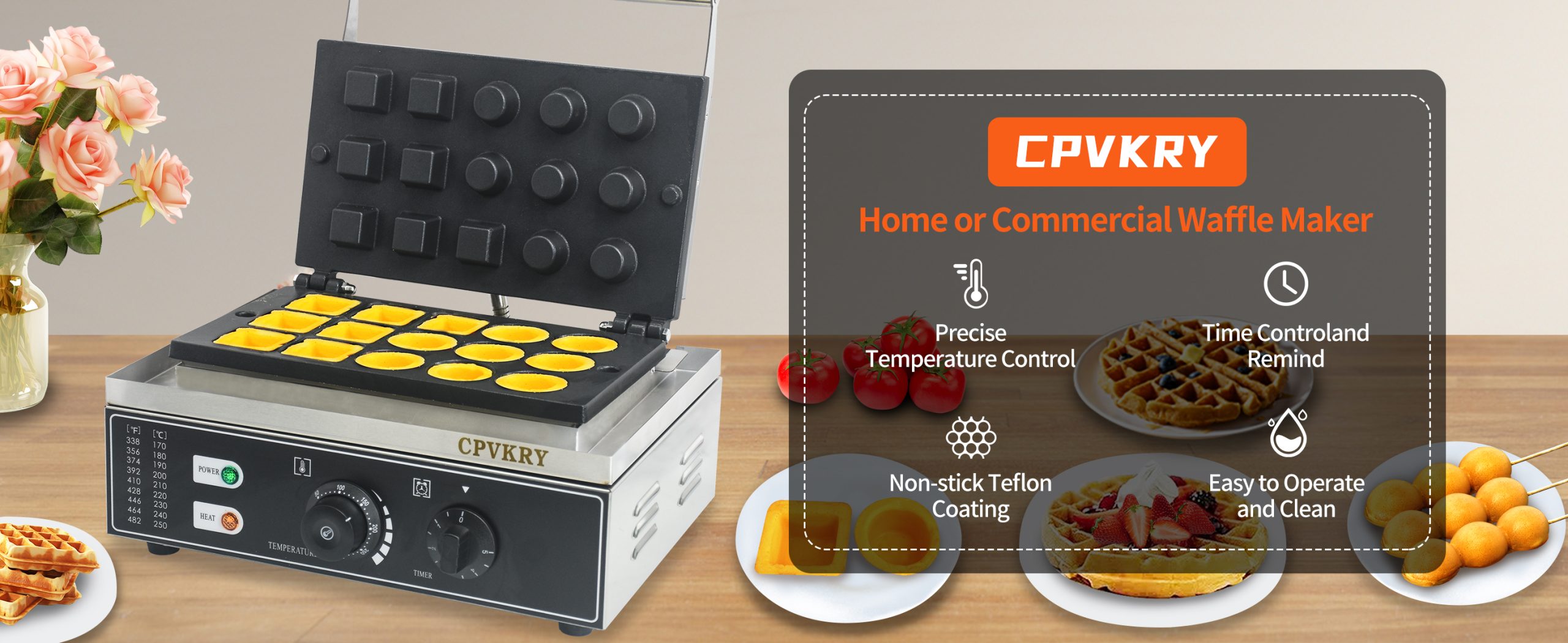 Our waffle maker adopts dual baking pans, with which 15 waffles can be cooked simultaneously. Double pans ensure even heating. Teflon coated surface facilitates non-stick cooking and keeps your place neat.