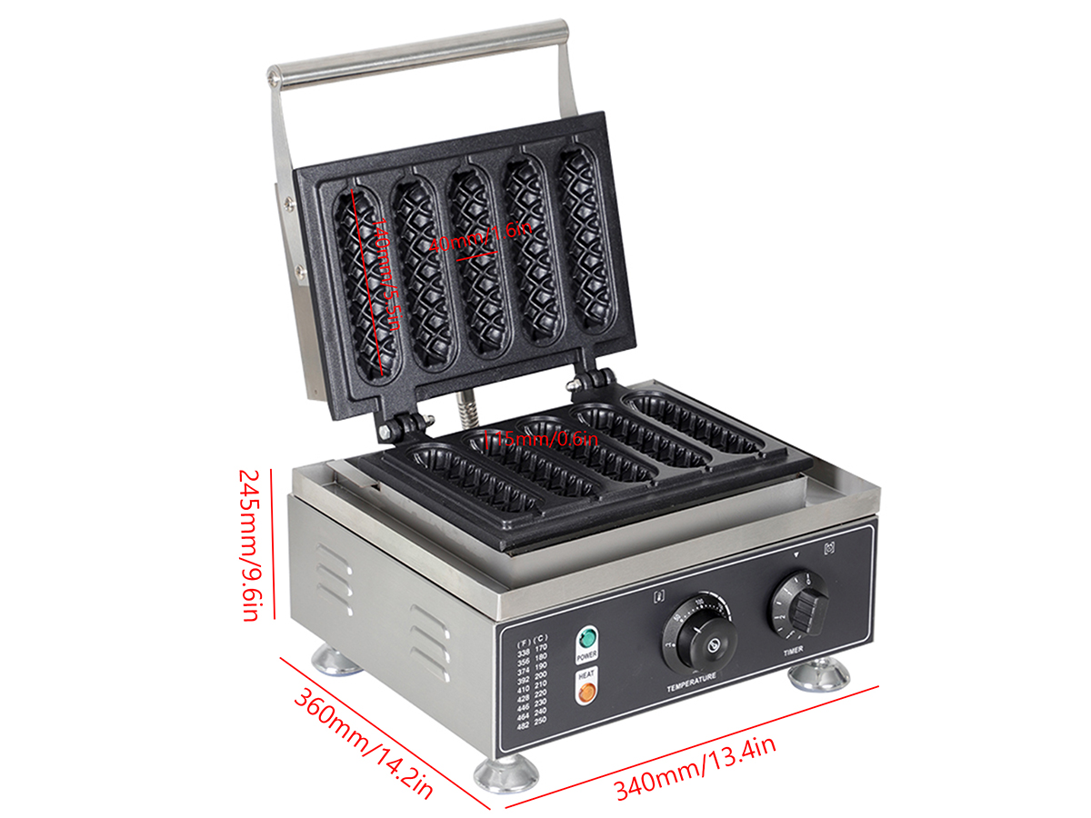 This unique industrial Corn Dog waffle maker professional produces Corn waffles with unique textures. It is equipped with a manually controlled thermostat and timer for more precise control, comfortable handles, and Up and down flip mechanism for efficient processing. You can use it at home with your family, or in cafe bars, restaurants, canteens, snack stations, etc.