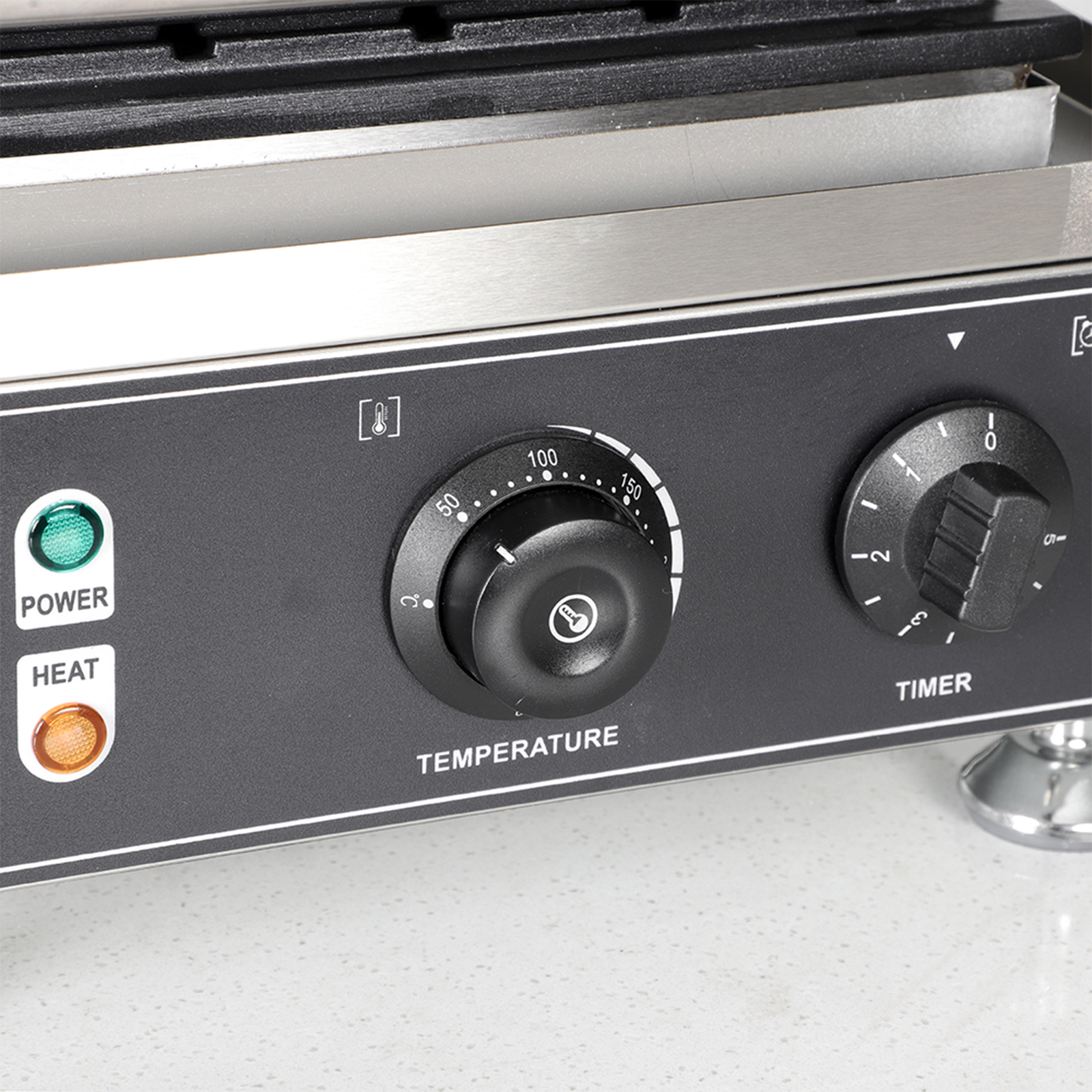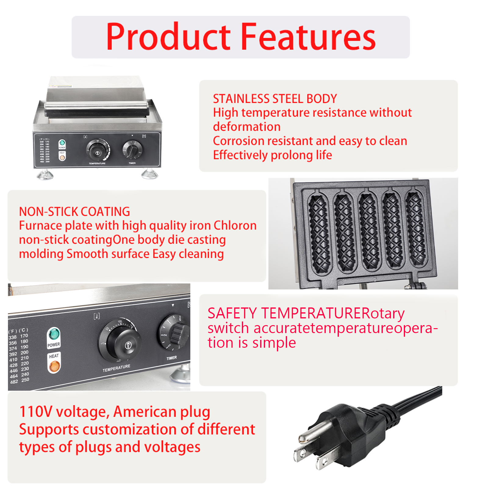 Smooth knobs for easy control of waffle maker. Temperature ranges from 50~300℃ with LED light showing heating status. Precise timer for up to 5 minutes’ period. Clear and melodious alarm when waffle is ready.