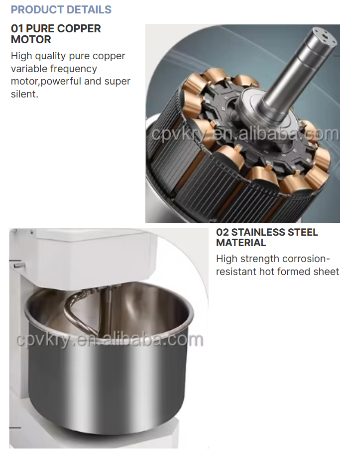 Multifunctional dough mixer:Food grade stainless steel ; High strength corrosion-resistant hot formed sheet ; Multifunctional ; Large capacity ; Enorny savinoand noise reduction ; strong torque.