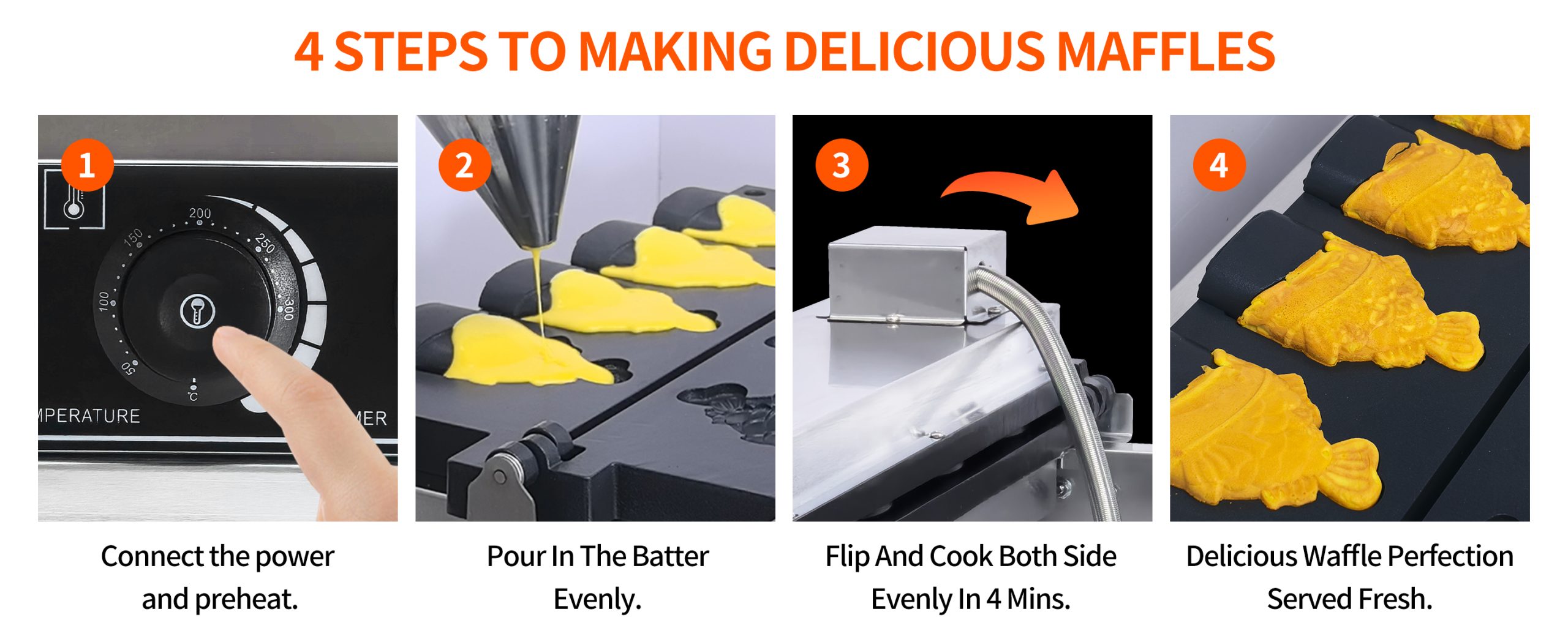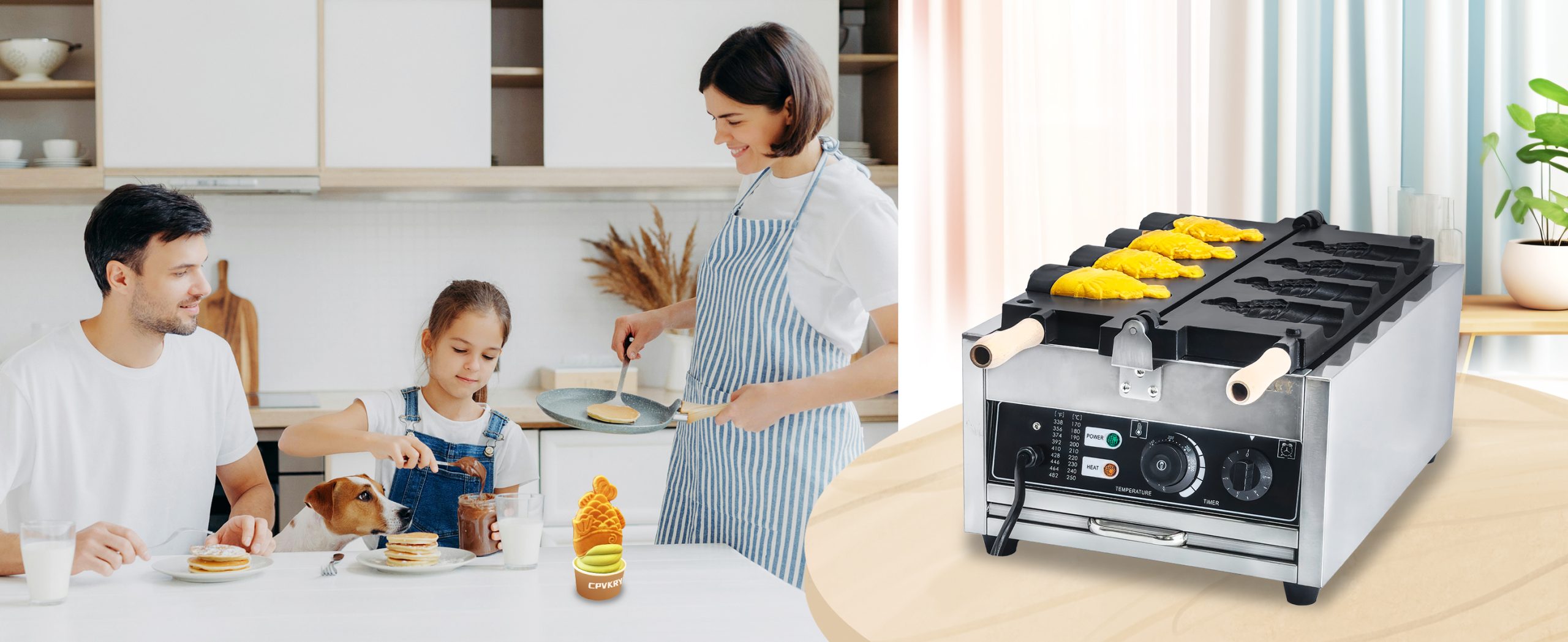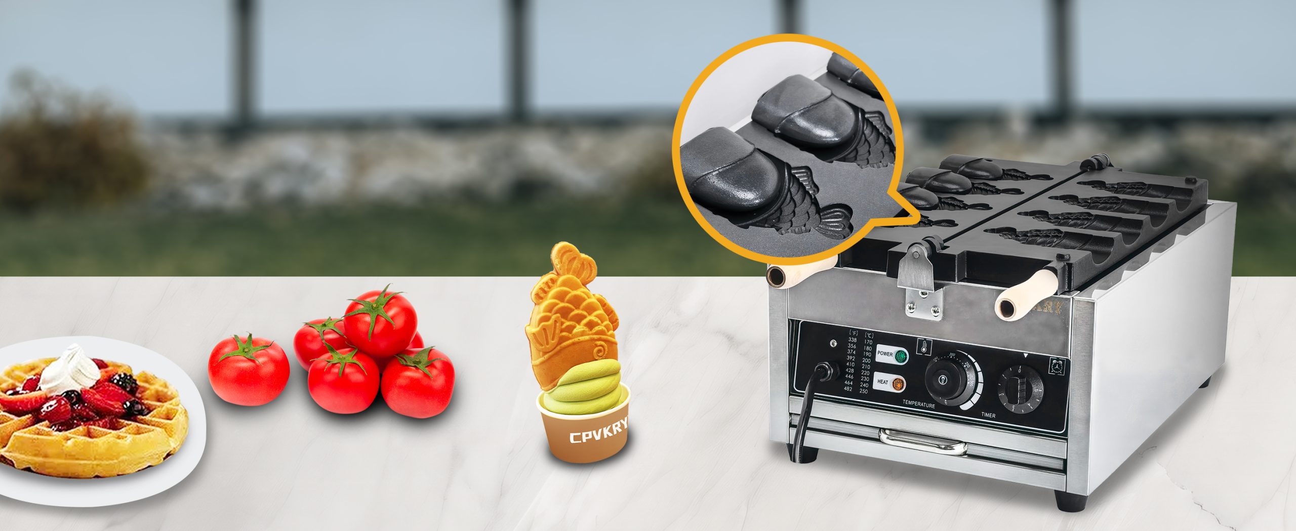 Baking delicious Fish-Shaped Waffle Iron Ice Cream Waffle waffles. This commercial grade waffle machine is getting extremely popular all over the world because of its high efficiency and excellent results. Baking tasty jam or ice cream waffles with independent heat control extremely easy.