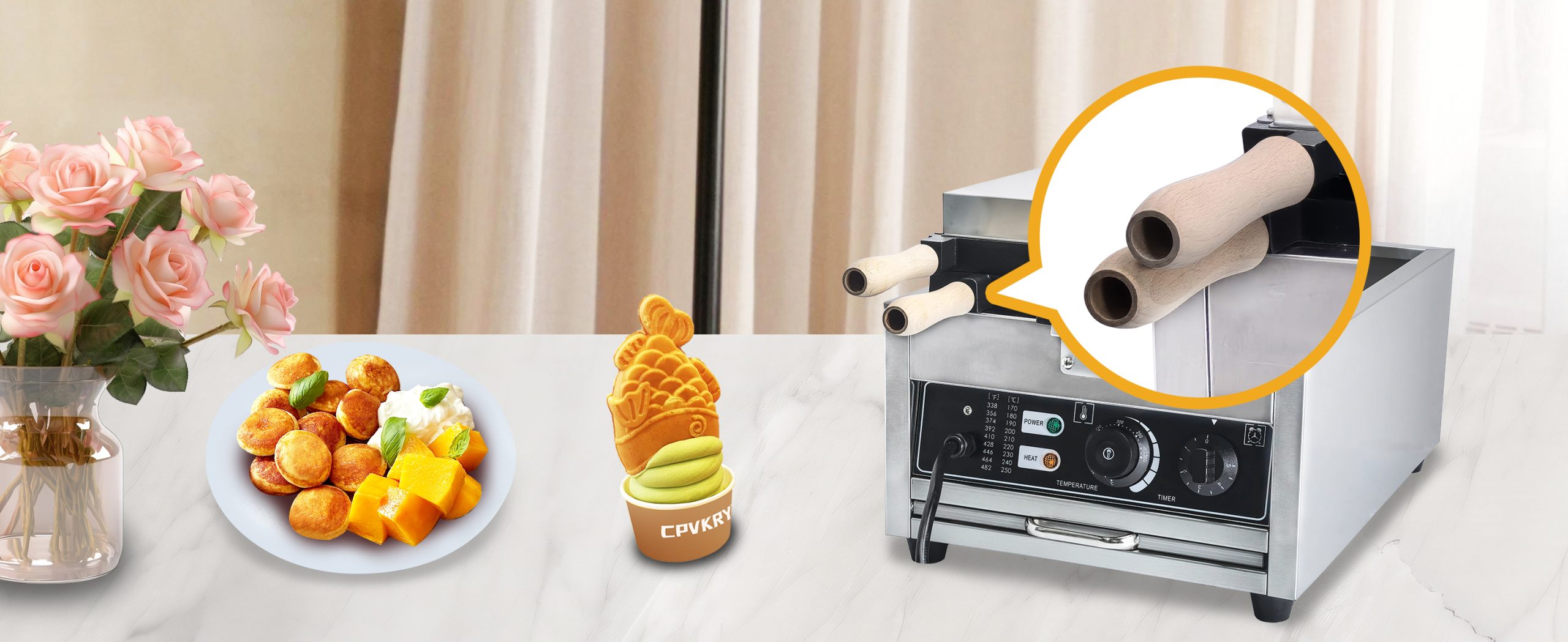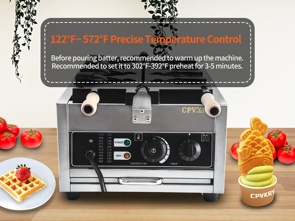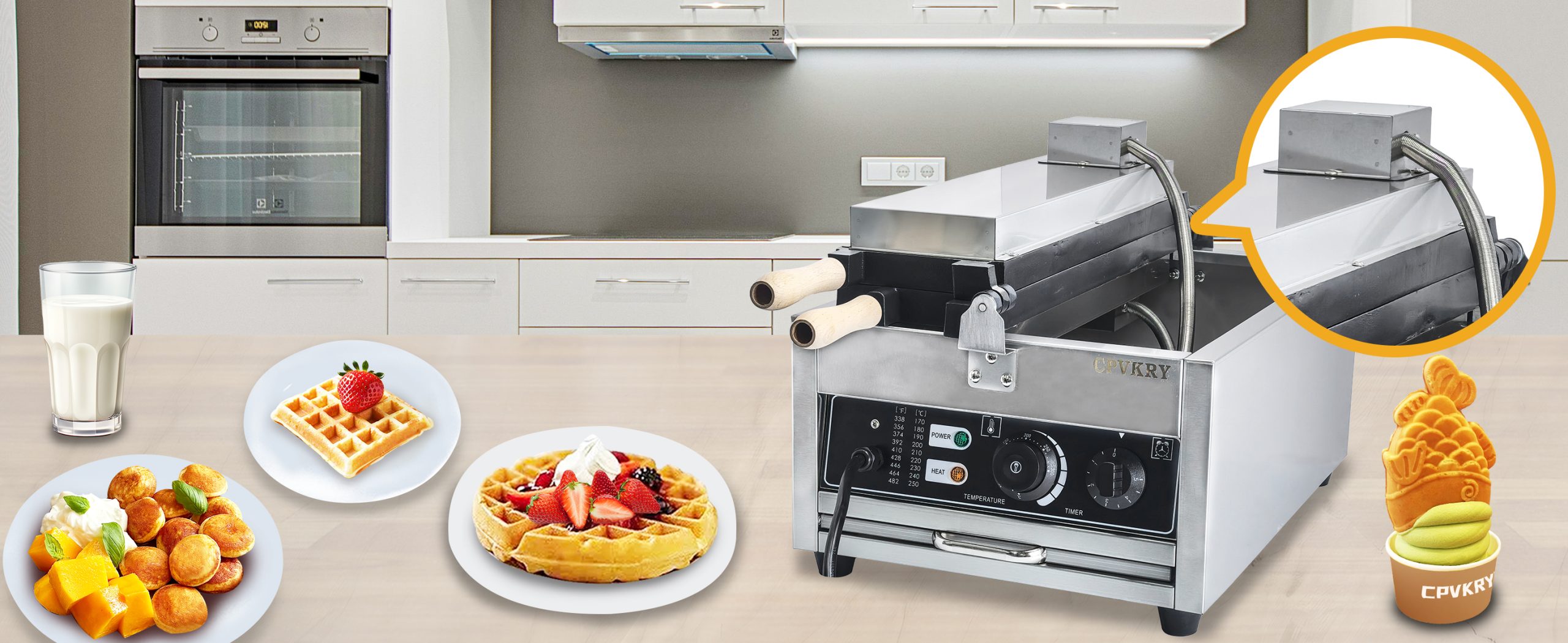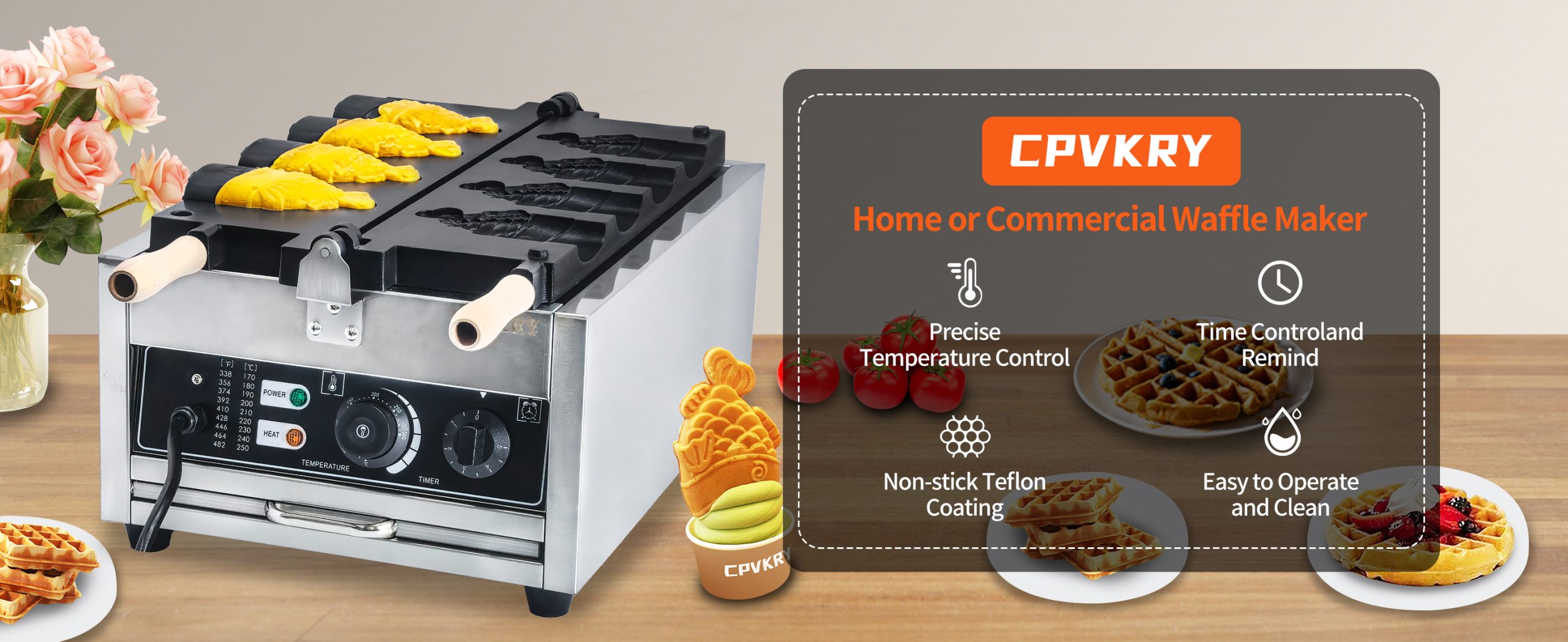 Baking delicious Fish-Shaped Waffle Iron Ice Cream Waffle waffles. This commercial grade waffle machine is getting extremely popular all over the world because of its high efficiency and excellent results. Baking tasty jam or ice cream waffles with independent heat control extremely easy.