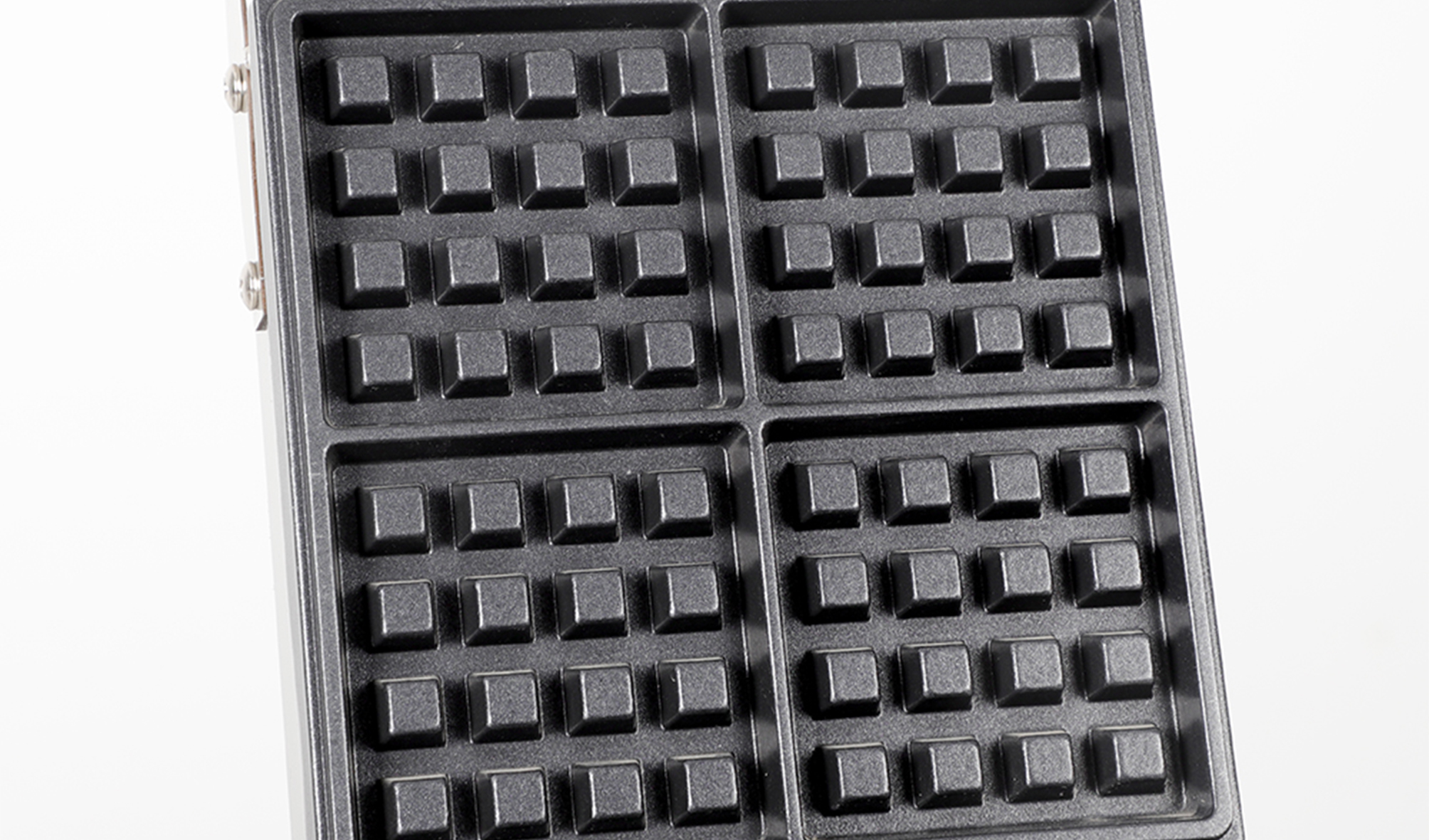 Our waffle maker adopts dual baking pans, with which 4 waffles can be cooked simultaneously. Double pans ensure even heating. Teflon coated surface facilitates non-stick cooking and keeps your place neat.