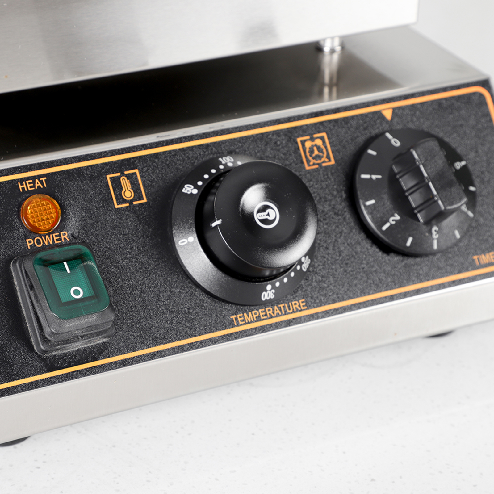 Smooth knobs for easy control of waffle maker. Temperature ranges from 50~300℃ with LED light showing heating status. Precise timer for up to 5 minutes’ period. Clear and melodious alarm when waffle is ready.