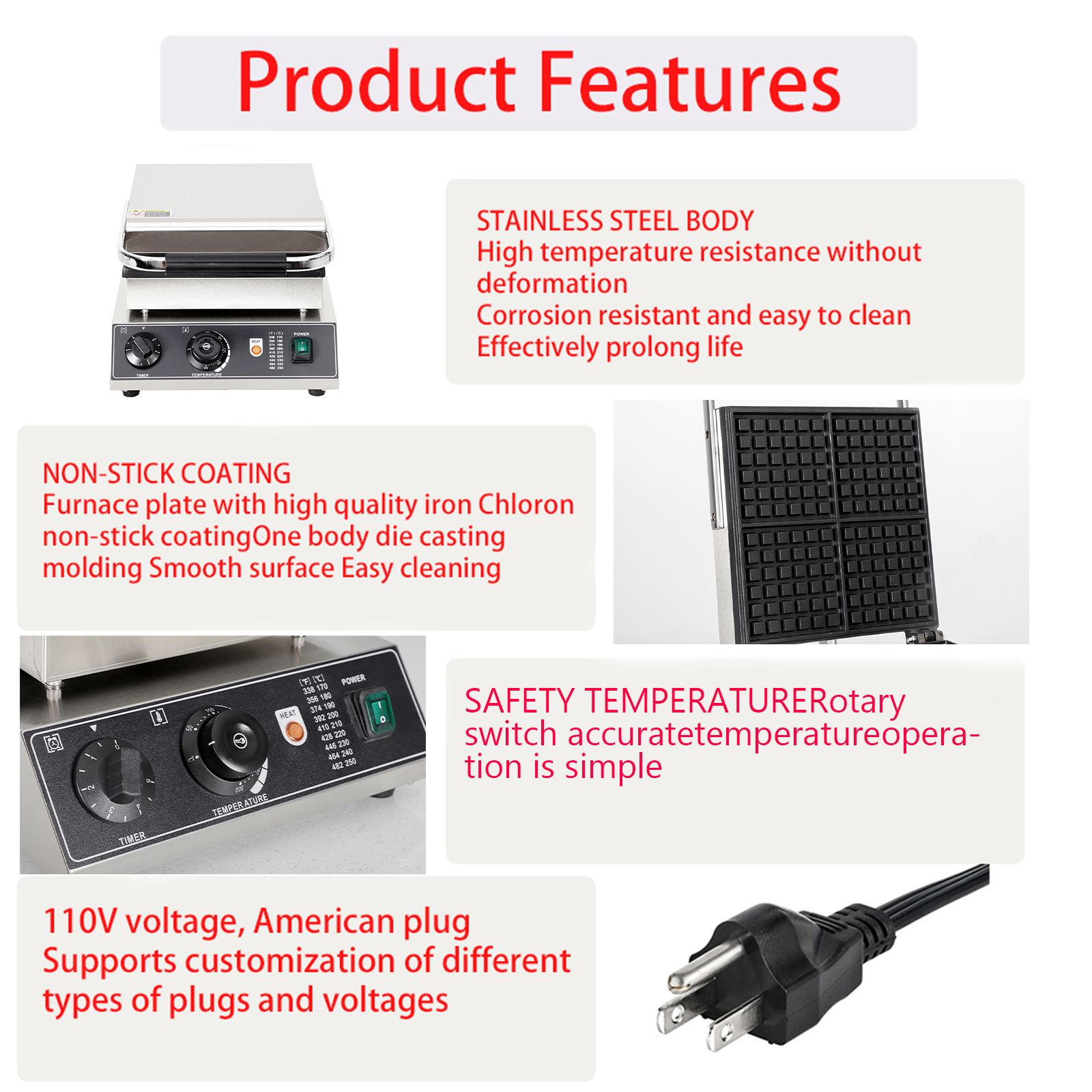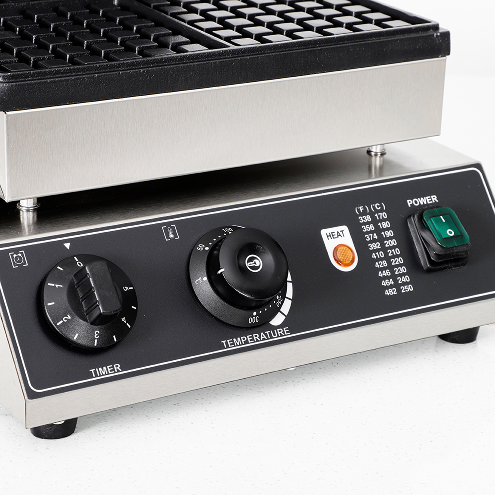 This unique industrial Square Waffle stick Maker professional produces Honeycomb waffles with unique textures. It is equipped with a manually controlled thermostat and timer for more precise control, comfortable handles, You can use it at home with your family, or in cafe bars, restaurants, canteens, snack stations, etc.