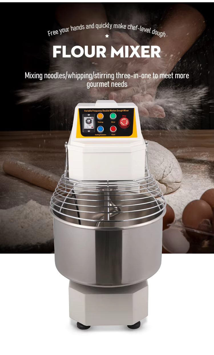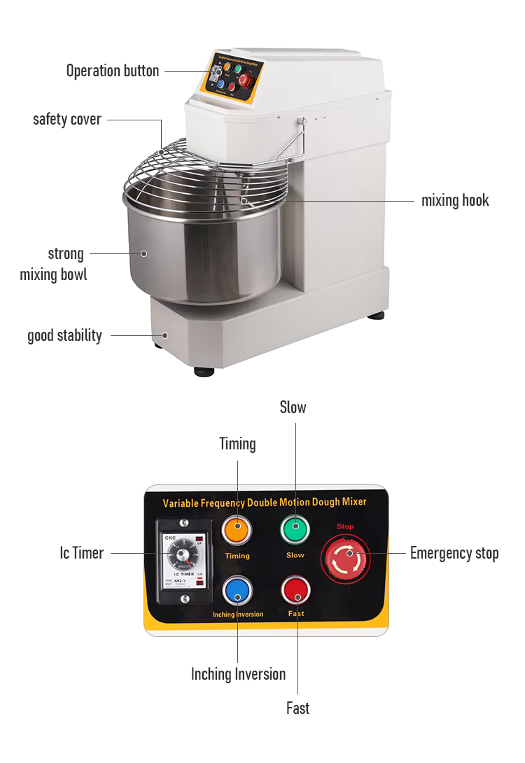 Features: 1.Variable frequency speed regulation 2.Equipped with a bowl safety protection device; 3.Suitable for all kinds of dough; 4.Easy to operate and clean; 5.Almost no maintenance is required; 6.Motor overload protection 7.Independent motors for bowls and spirals; 8.Application: Widely used in restaurants, bakeries, pizza shops, factories, etc.