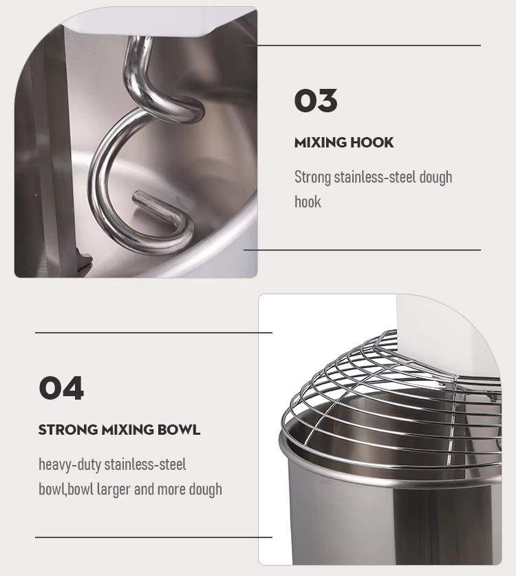 Multifunctional dough mixer:Food grade stainless steel ; High strength corrosion-resistant hot formed sheet ; Multifunctional ; Large capacity ; Enorny savinoand noise reduction ; strong torque.
