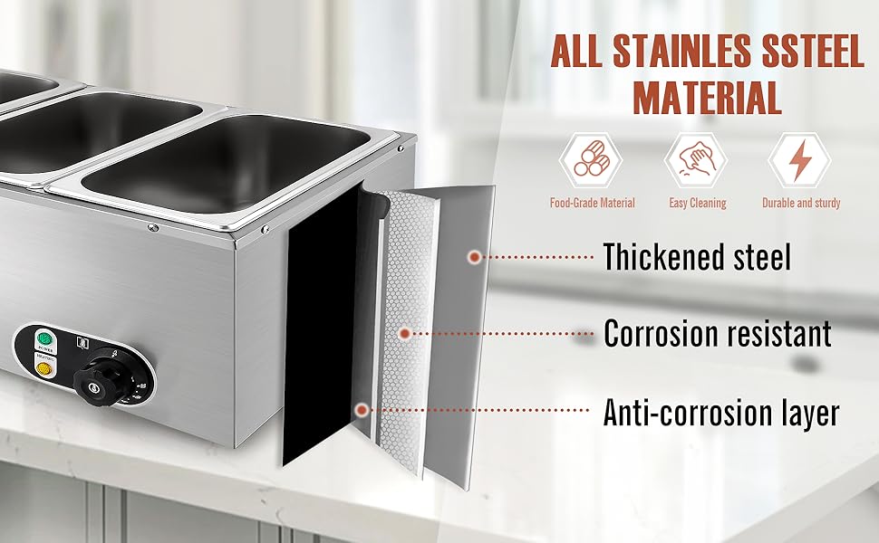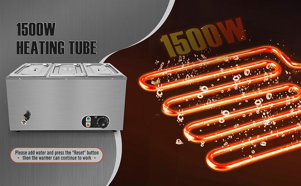 Equipped with 1500W power, 304 stainless steel U-type heating tube, even heating, the catering warmers provide a larger heating area for efficient heat transfer.