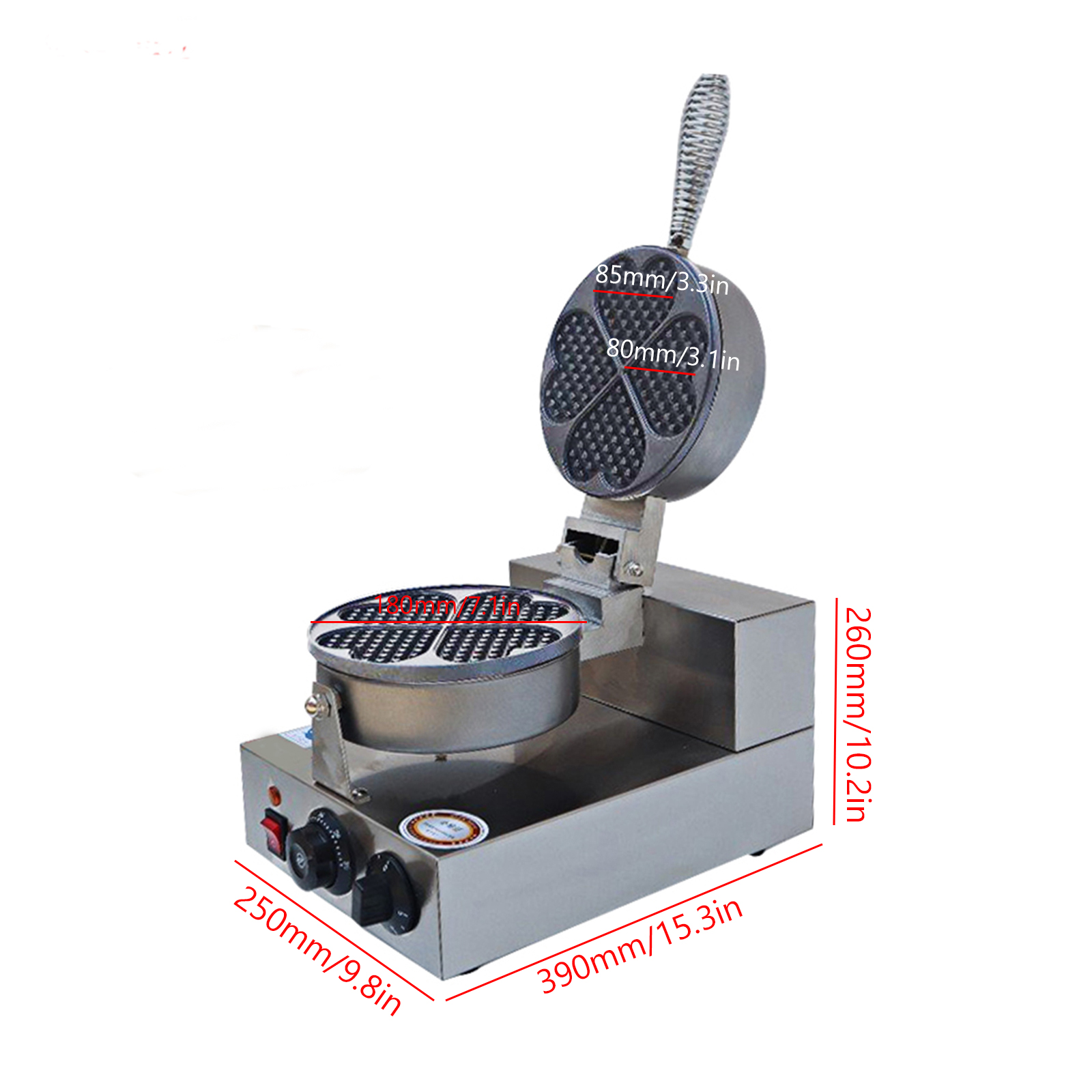 Smooth knobs for easy control of waffle maker. Temperature ranges from 50~300℃ with LED light showing heating status. Precise timer for up to 5 minutes’ period. Clear and melodious alarm when waffle is ready.