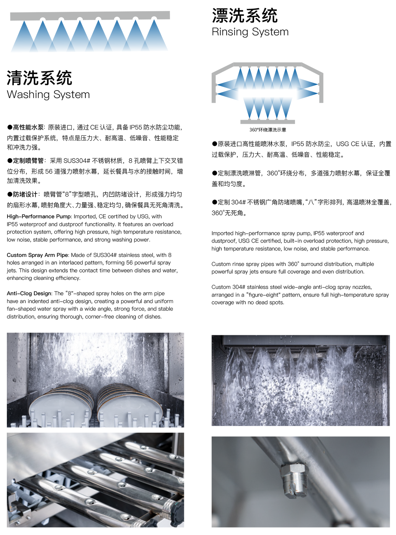 * The main washing arm has an anti-blocking nozzle, uniform water volume, and stable washing effect.