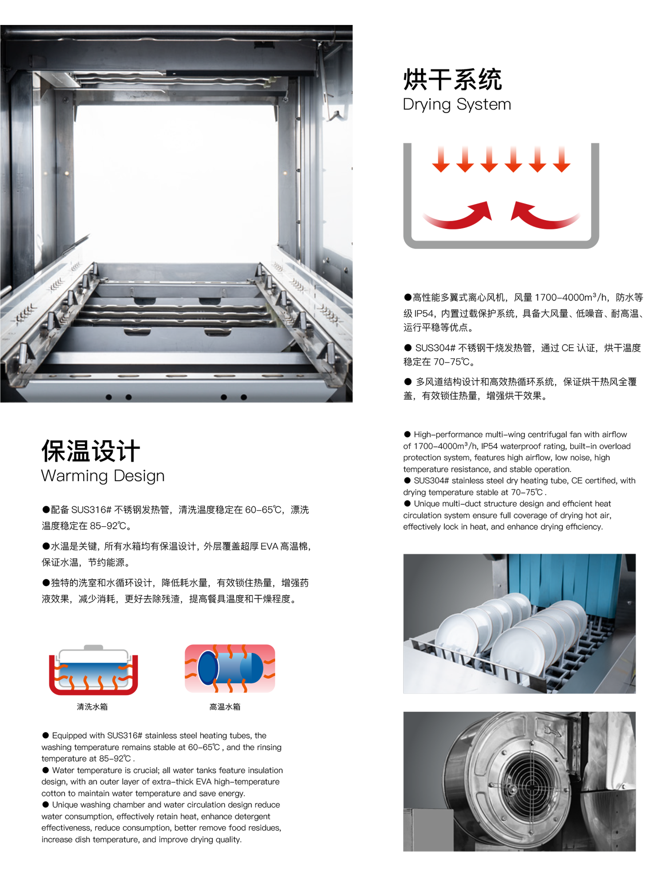 * Automatic sensing tableware washing system, automatic standby when there is no dish basket, energy saving and consumption reduction.