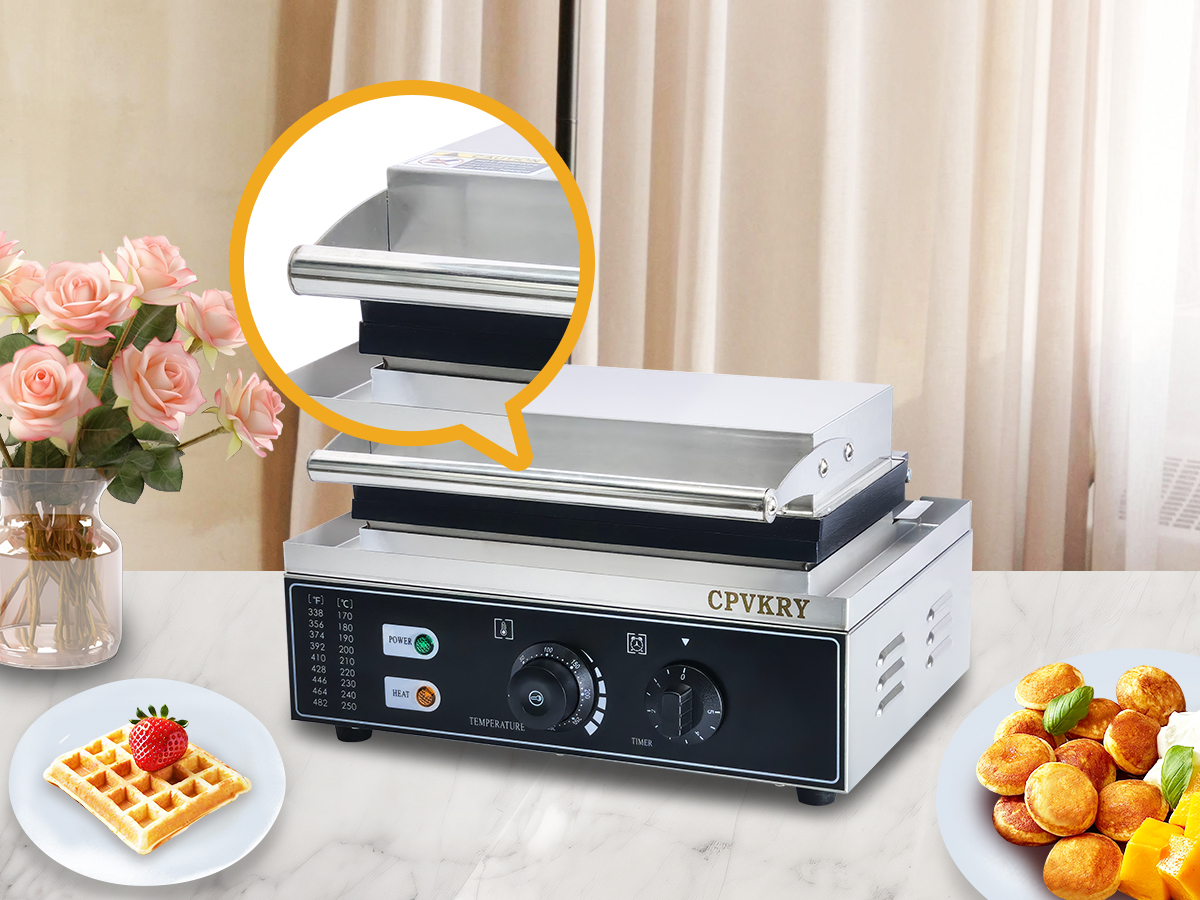 Smooth knobs for easy control of waffle maker. Temperature ranges from 50~300℃ with LED light showing heating status. Precise timer for up to 5 minutes’ period. Clear and melodious alarm when waffle is ready.