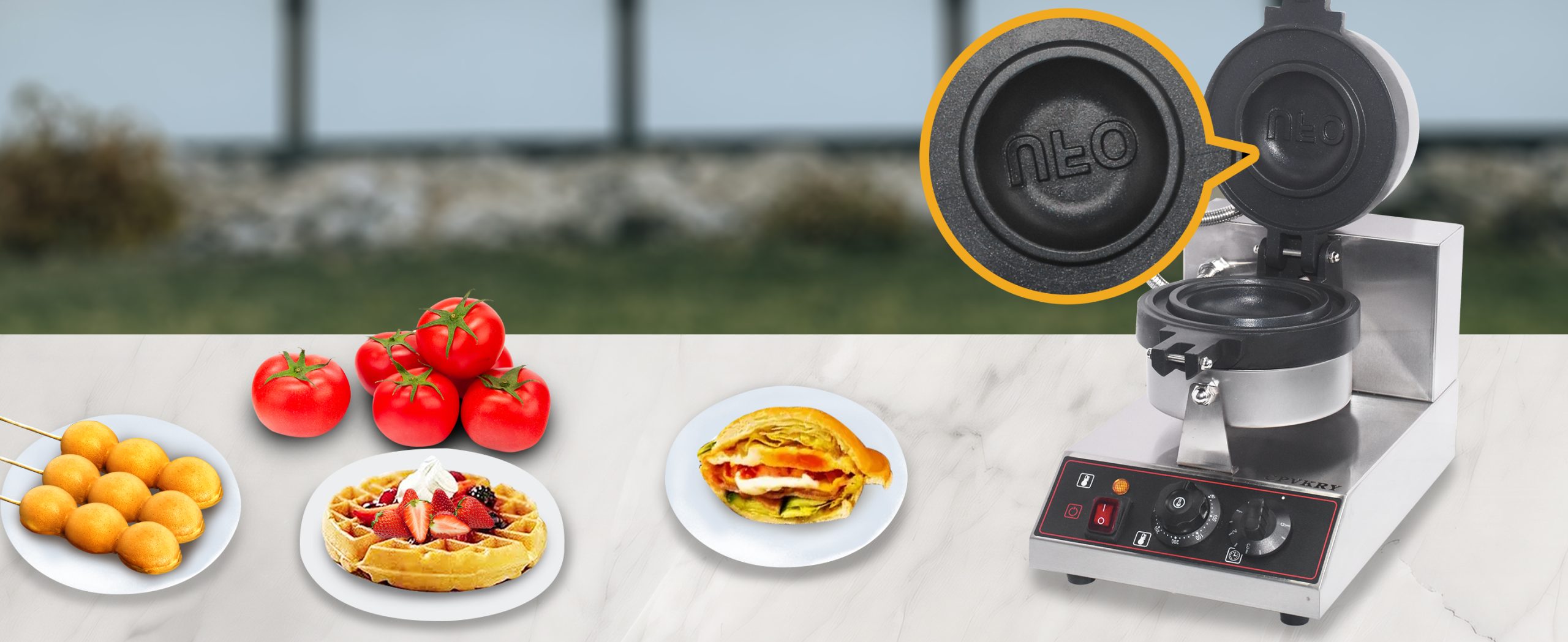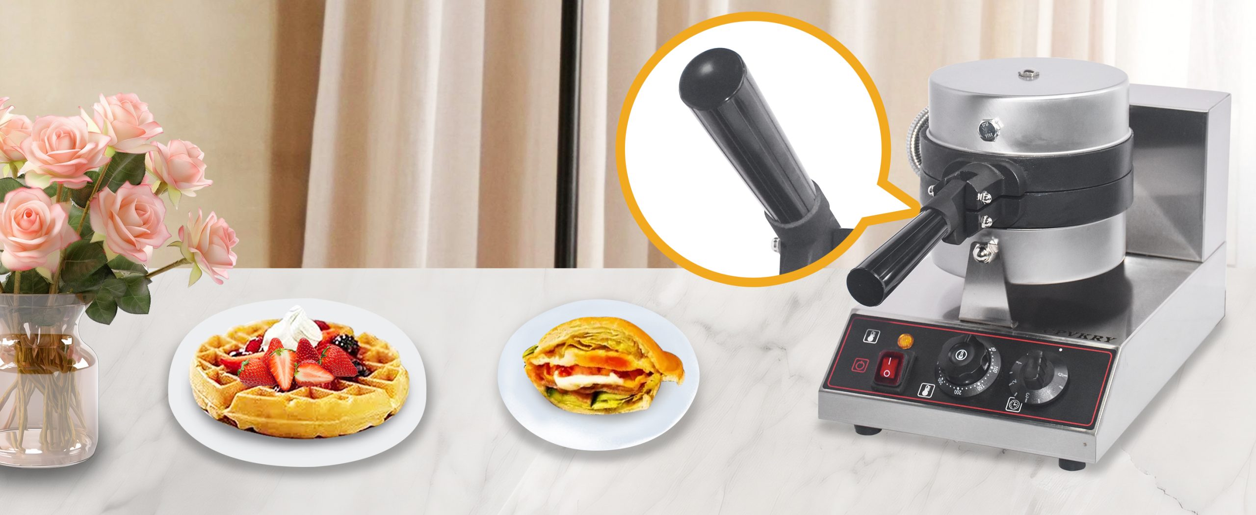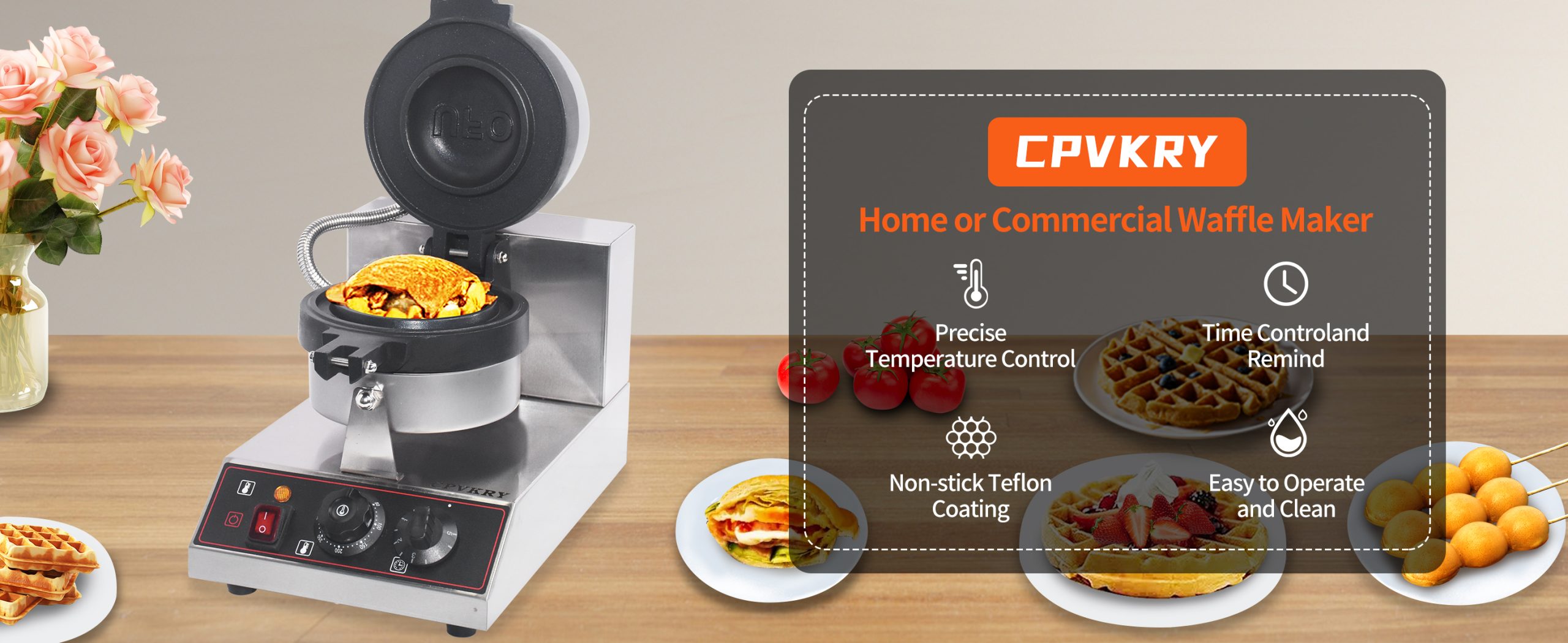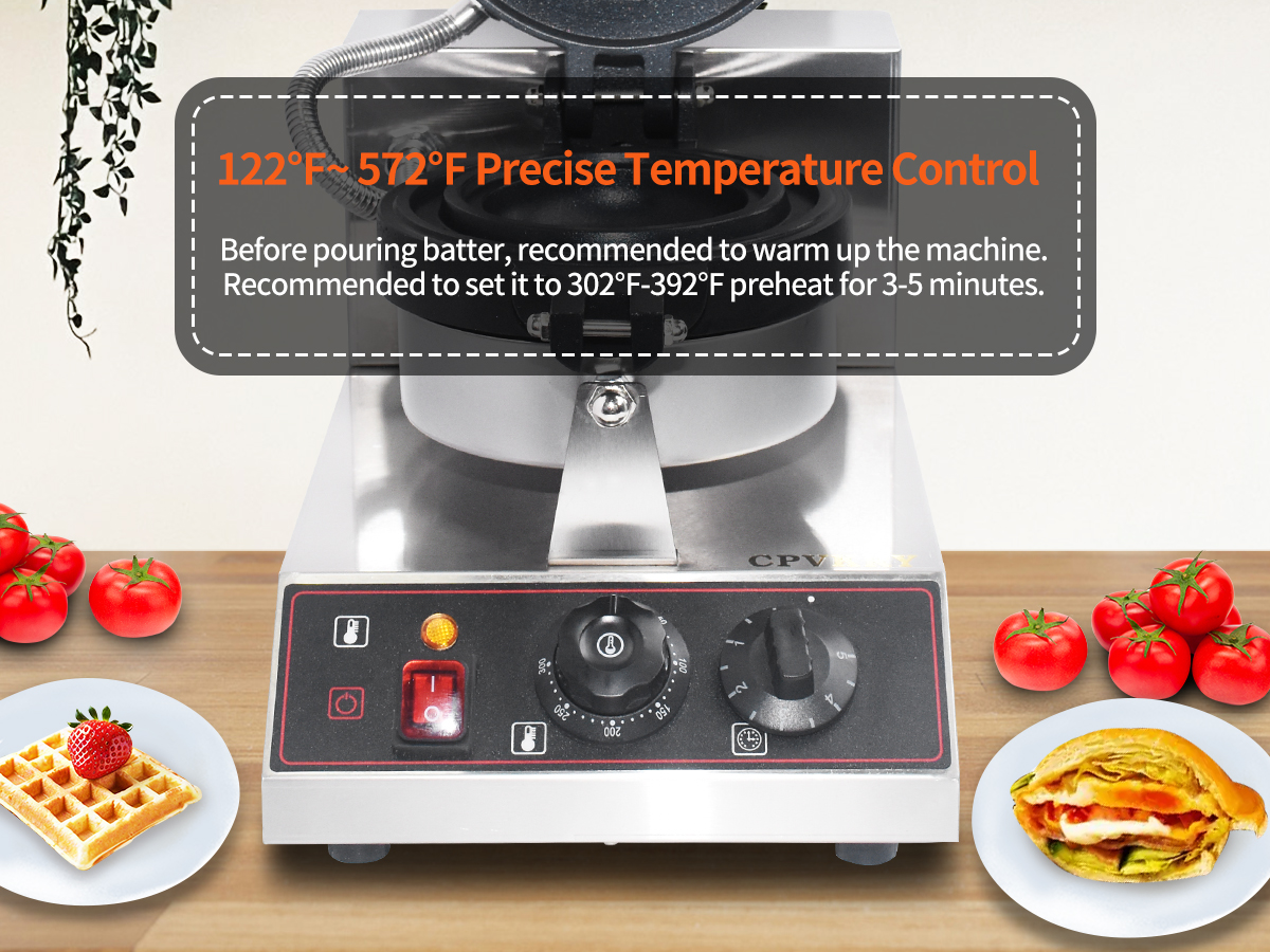 Smooth knobs for easy control of waffle maker. Temperature ranges from 50~300℃ with LED light showing heating status. Precise timer for up to 5 minutes’ period. Clear and melodious alarm when waffle is ready.
