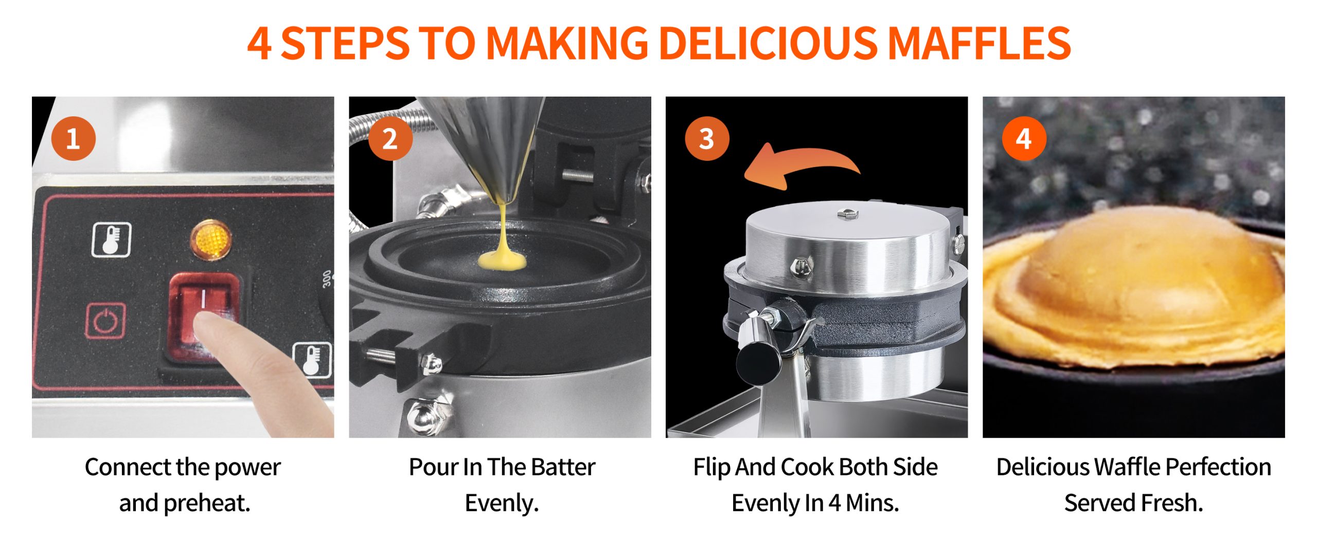 Lockable Design – Fix the pan during baking.Raised Edges -Keep all the batter in.180°Rotatable Pans -Bake waffles uniformly.