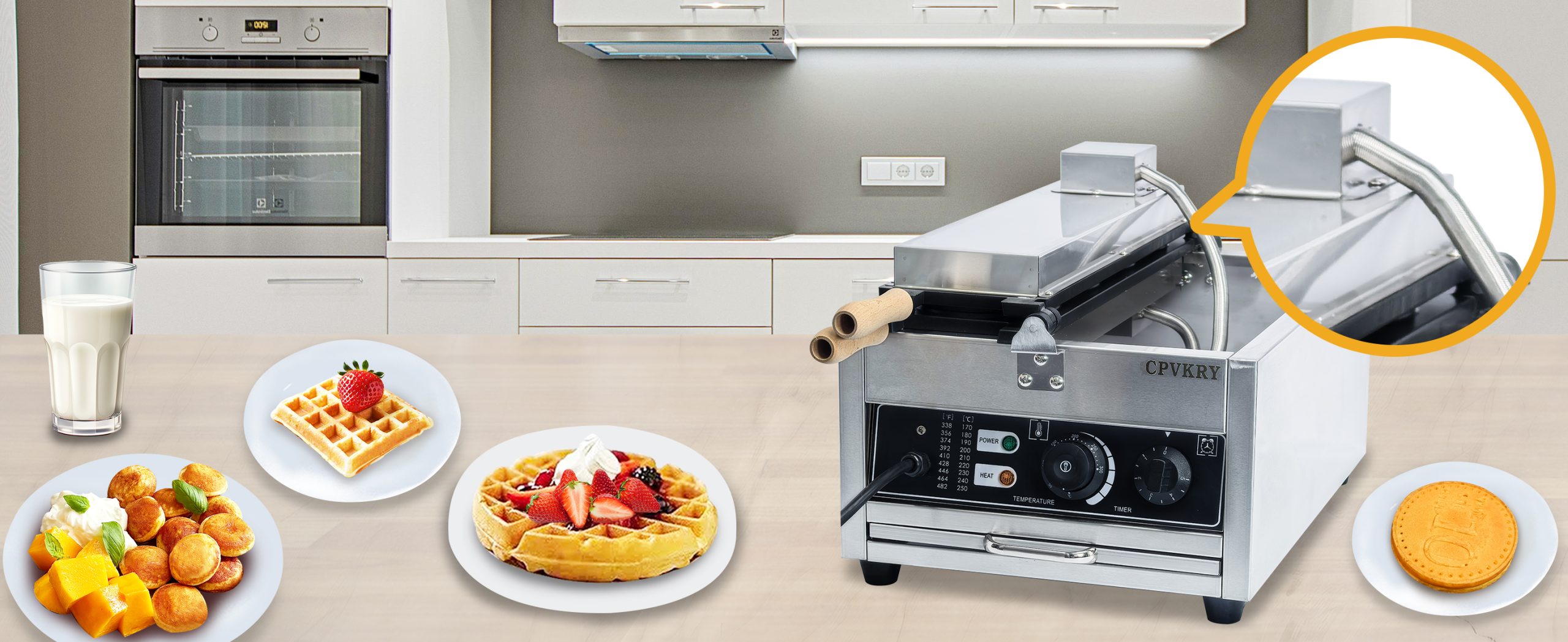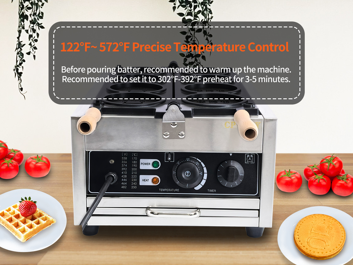 Smooth knobs for easy control of waffle maker. Temperature ranges from 50~300℃ with LED light showing heating status. Precise timer for up to 5 minutes’ period. Clear and melodious alarm when waffle is ready.