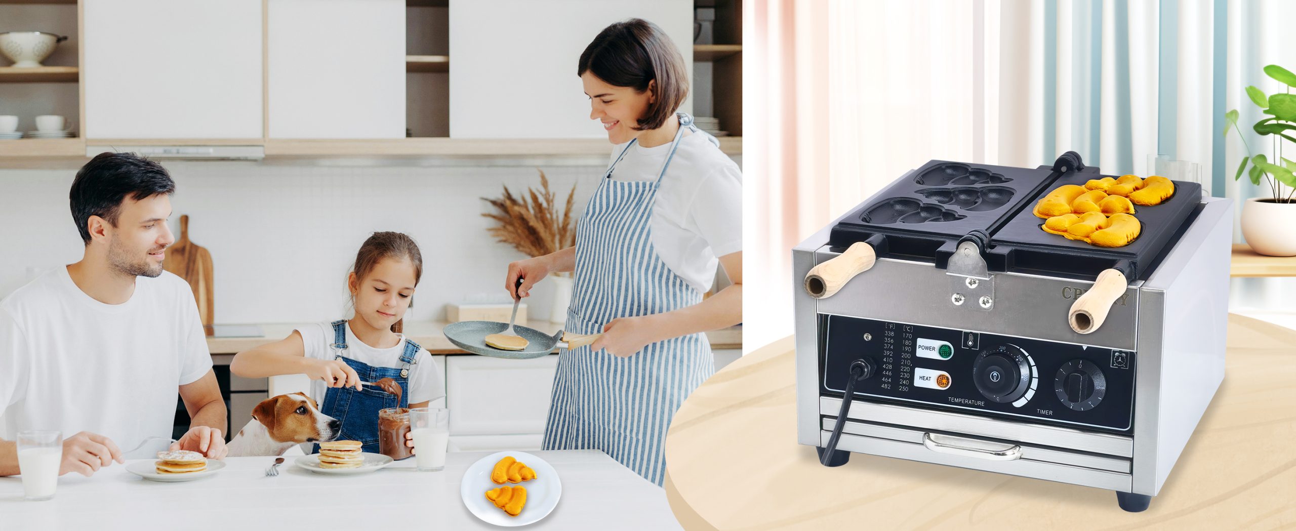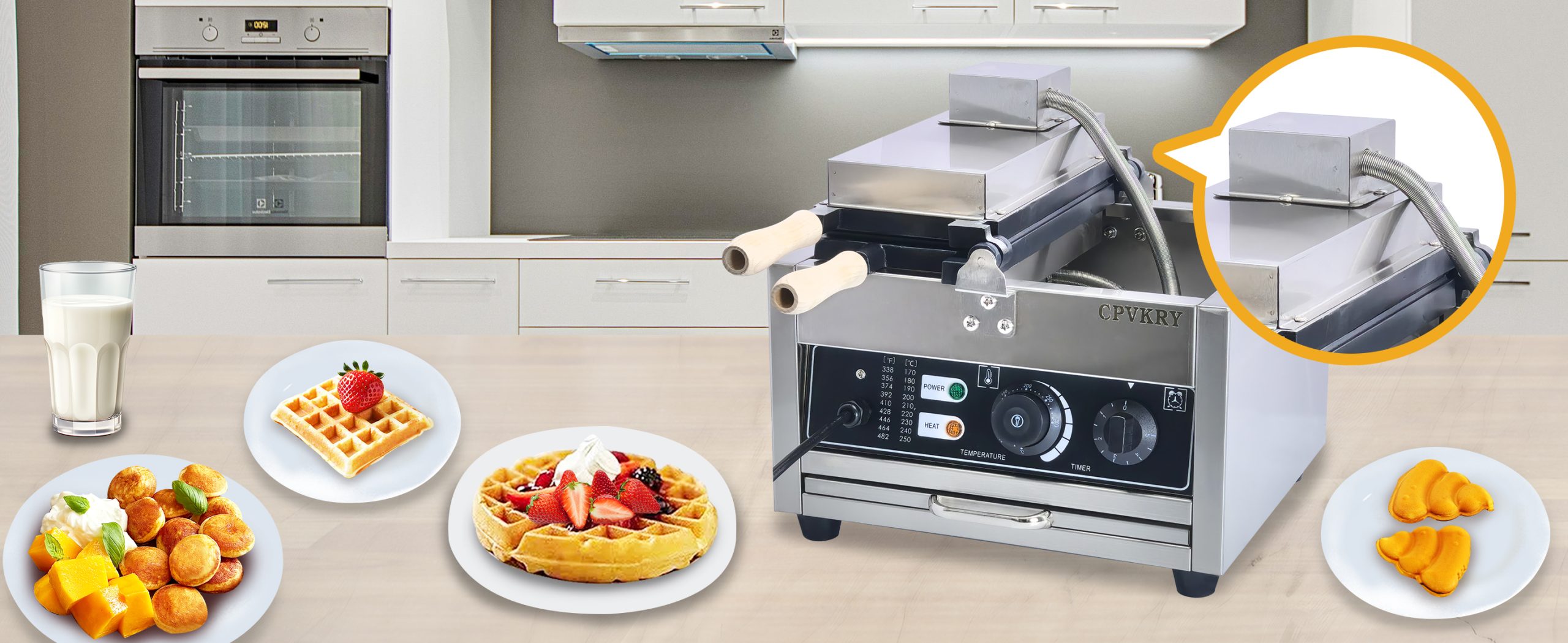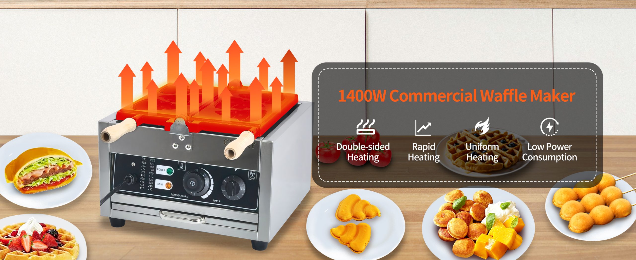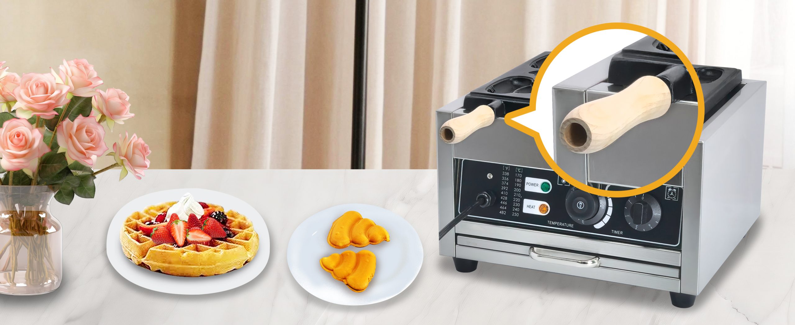 Smooth knobs for easy control of waffle maker. Temperature ranges from 50~300℃ with LED light showing heating status. Precise timer for up to 5 minutes’ period. Clear and melodious alarm when waffle is ready.