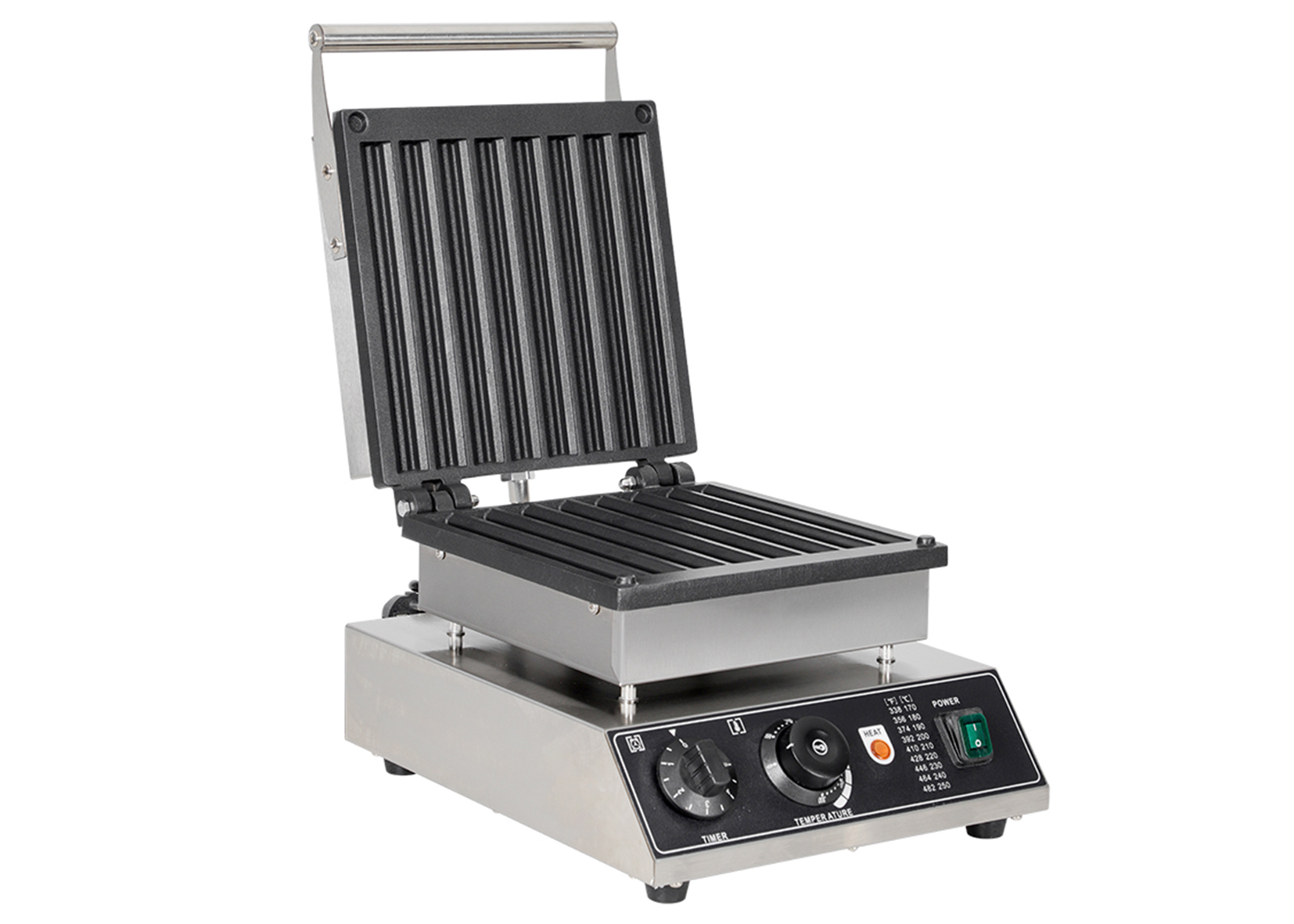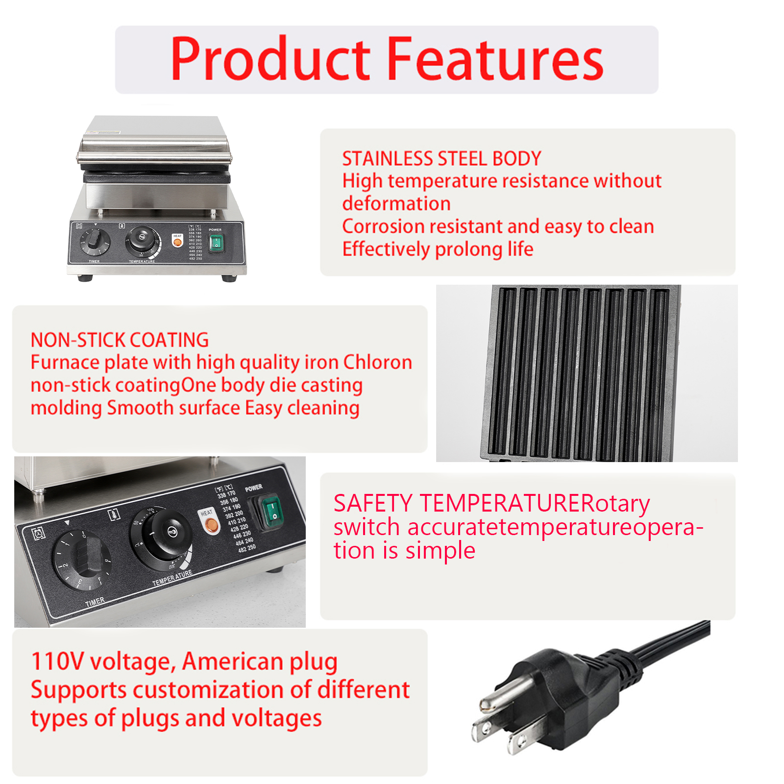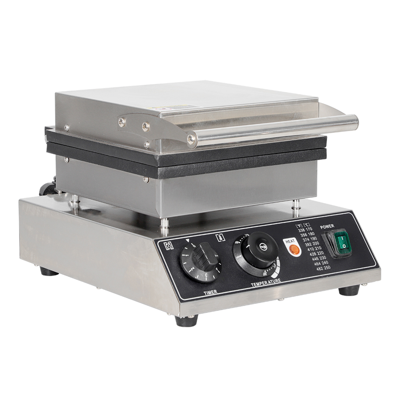 Smooth knobs for easy control of waffle maker. Temperature ranges from 50~300℃ with LED light showing heating status. Precise timer for up to 5 minutes’ period. Clear and melodious alarm when waffle is ready.