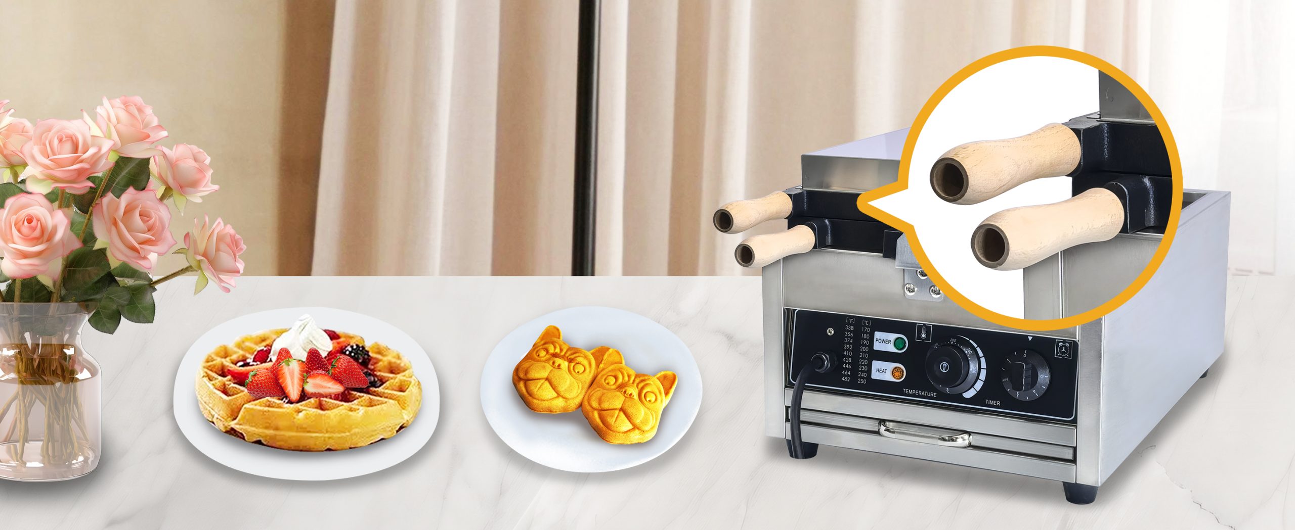 Smooth knobs for easy control of waffle maker. Temperature ranges from 50~300℃ with LED light showing heating status. Precise timer for up to 5 minutes’ period. Clear and melodious alarm when waffle is ready.