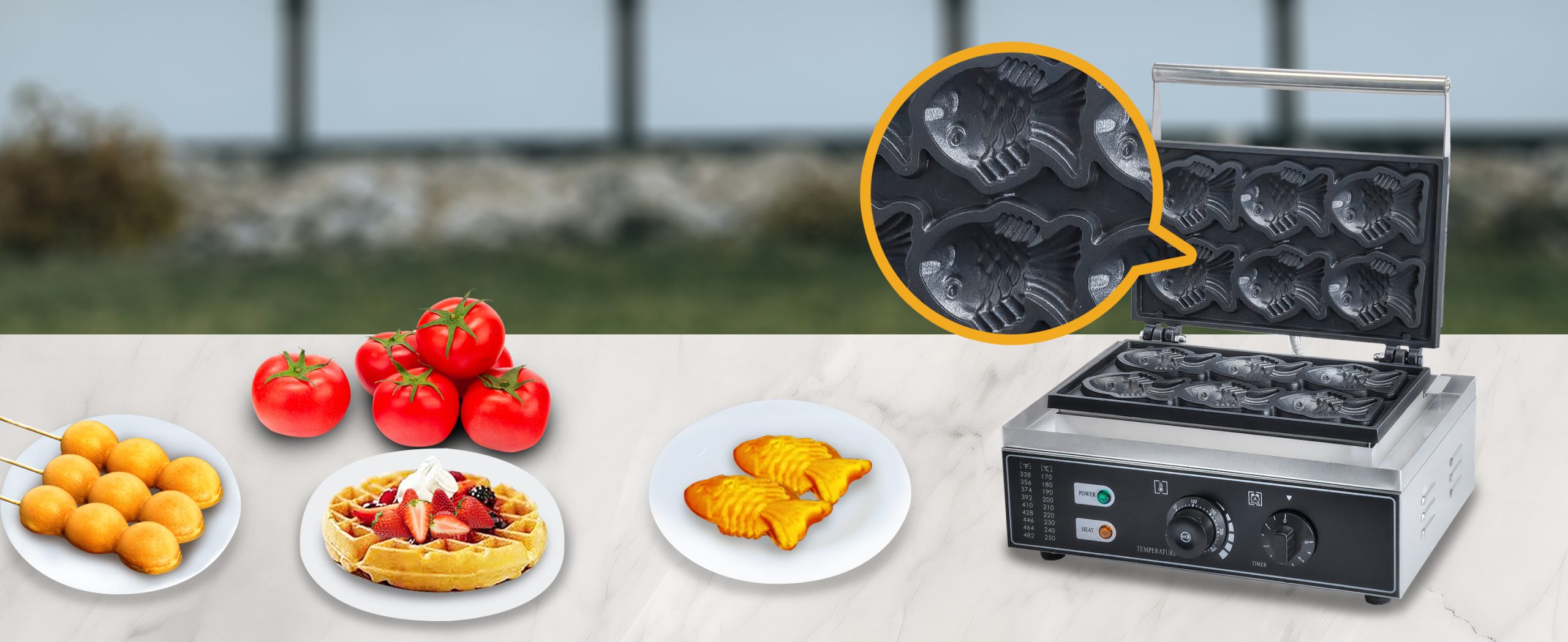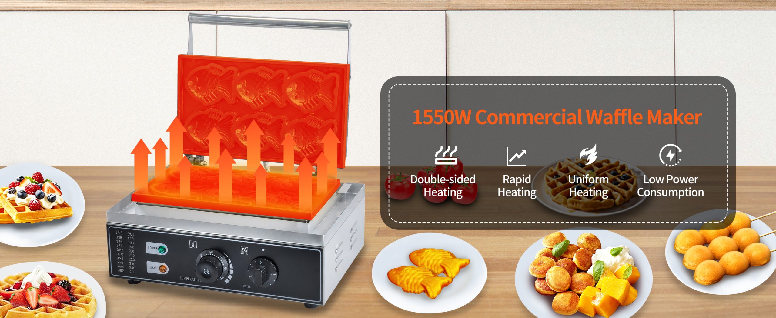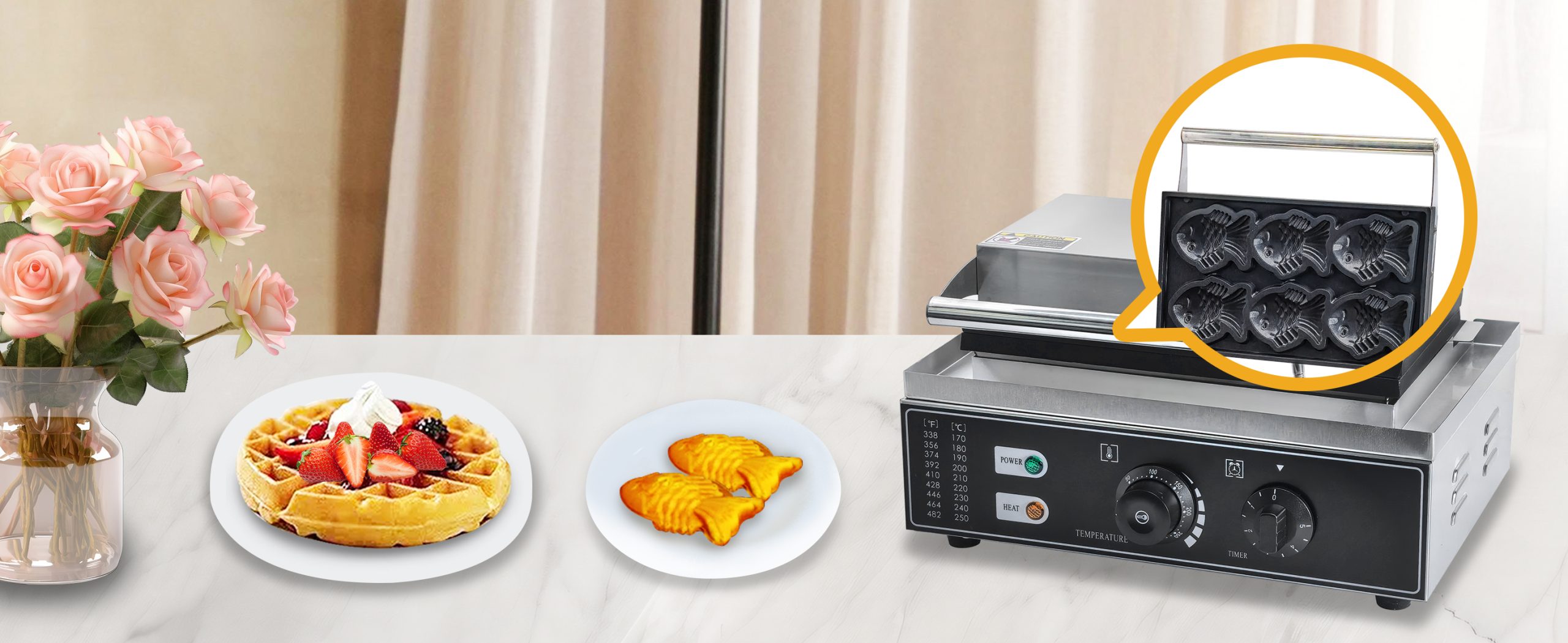 Baking delicious Fish-Shaped Waffle waffles. This commercial grade waffle machine is getting extremely popular all over the world because of its high efficiency and excellent results. Baking tasty jam or ice cream waffles with independent heat control extremely easy.