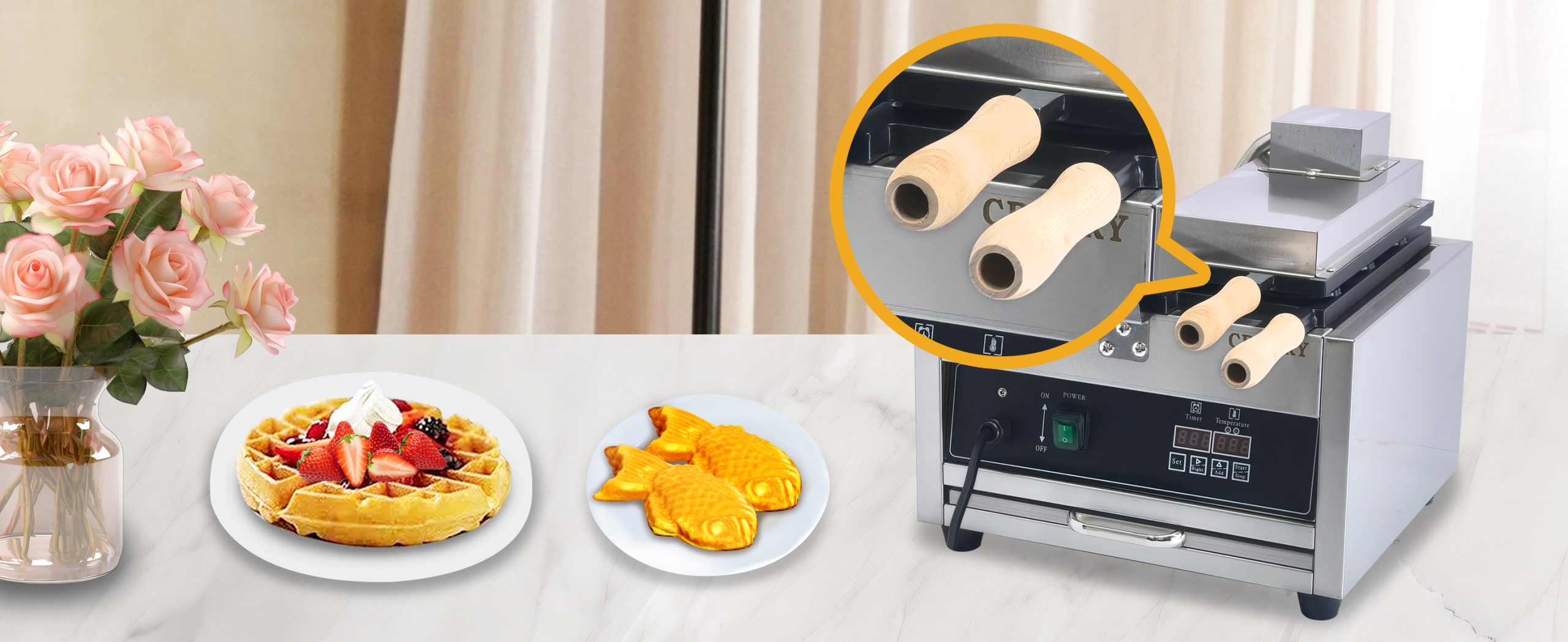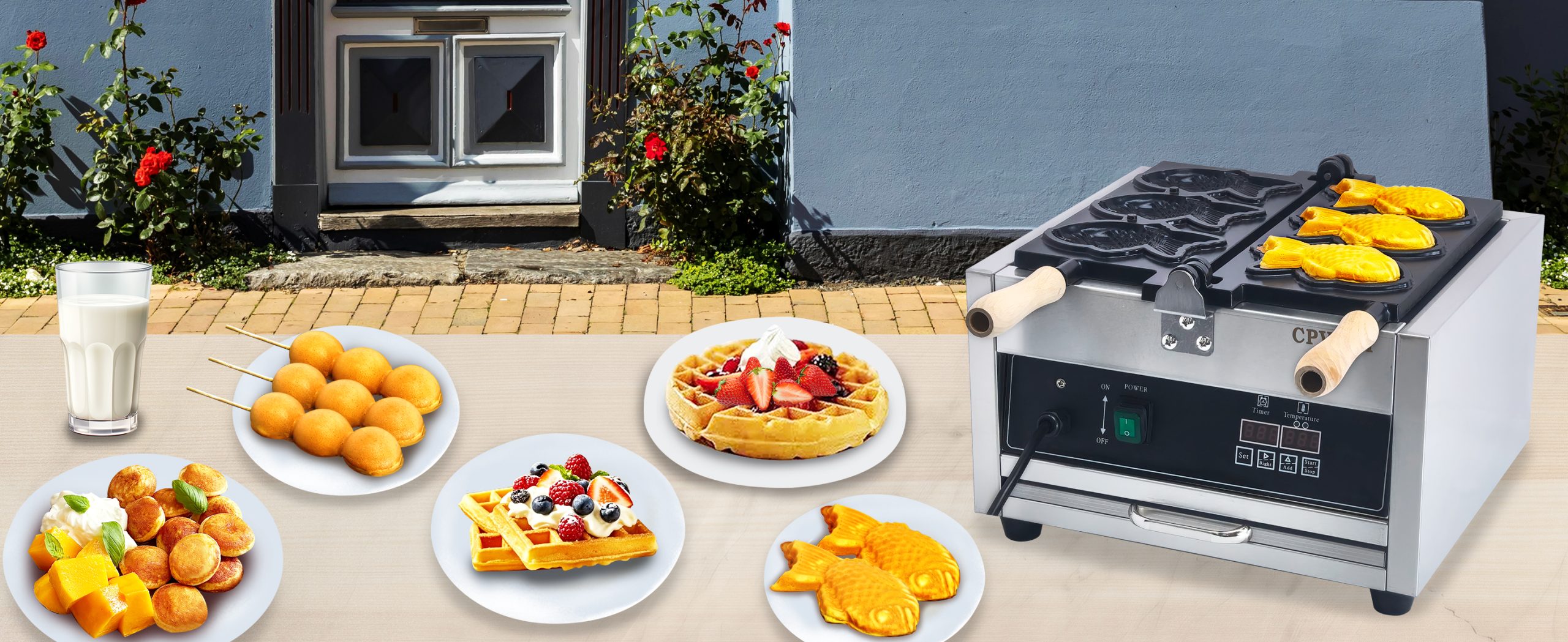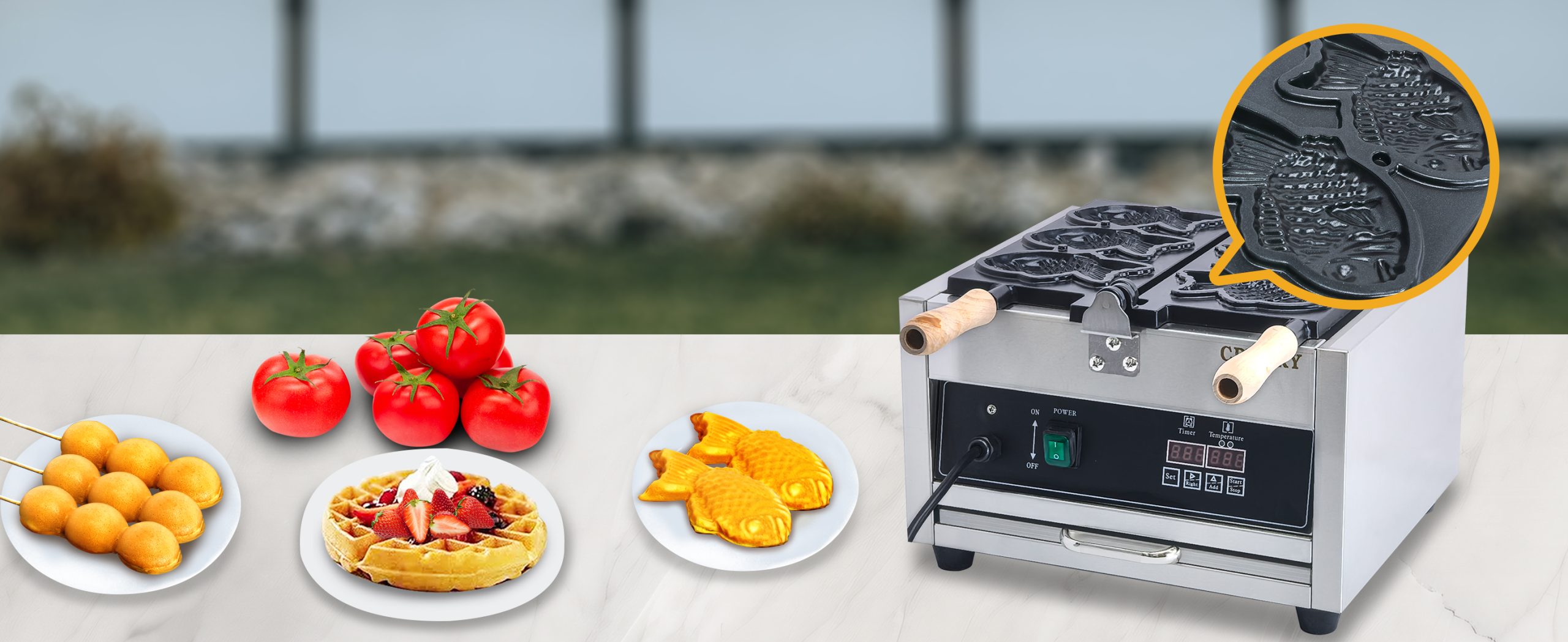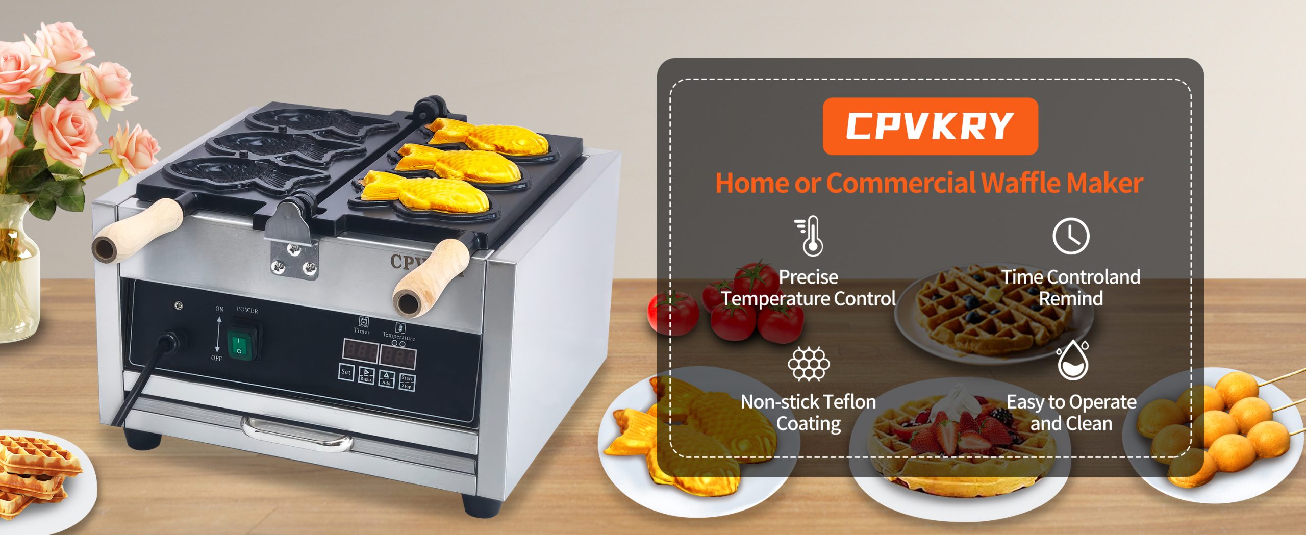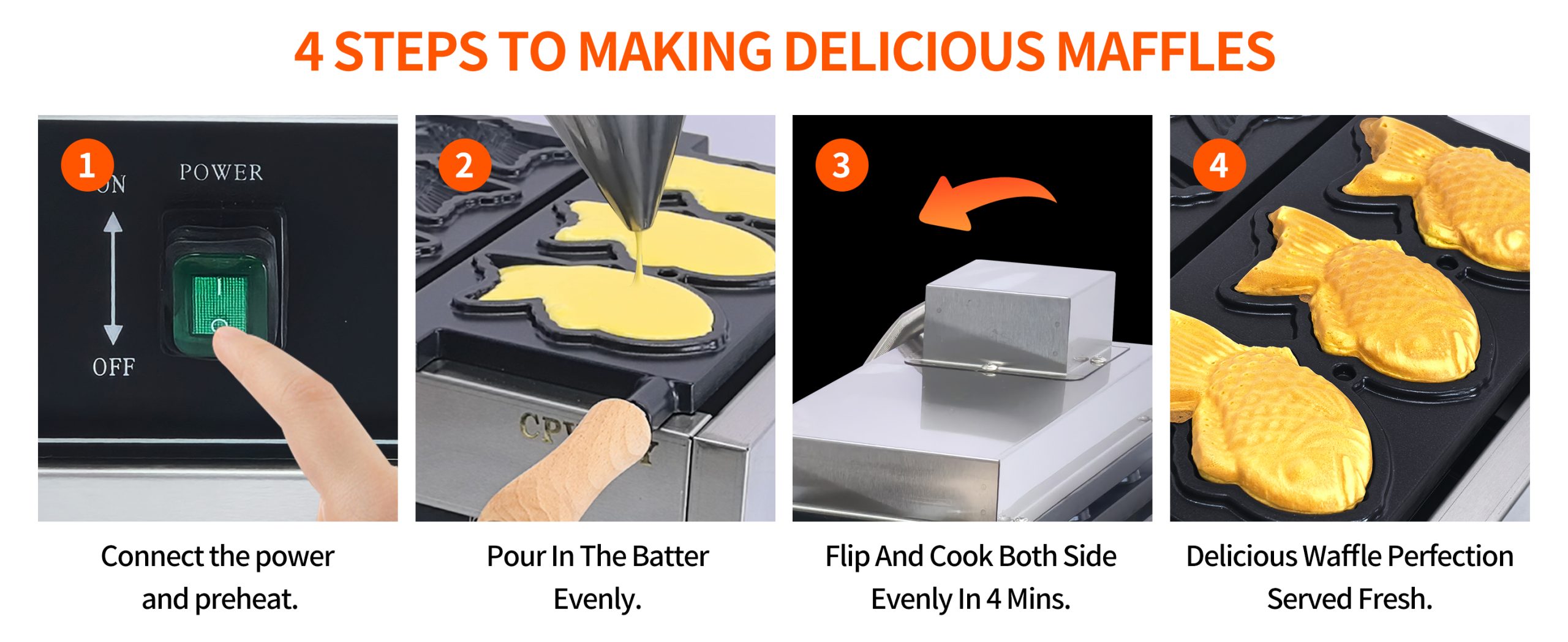 Baking delicious Fish-Shaped Waffle waffles. This commercial grade waffle machine is getting extremely popular all over the world because of its high efficiency and excellent results. Baking tasty jam or ice cream waffles with independent heat control extremely easy.