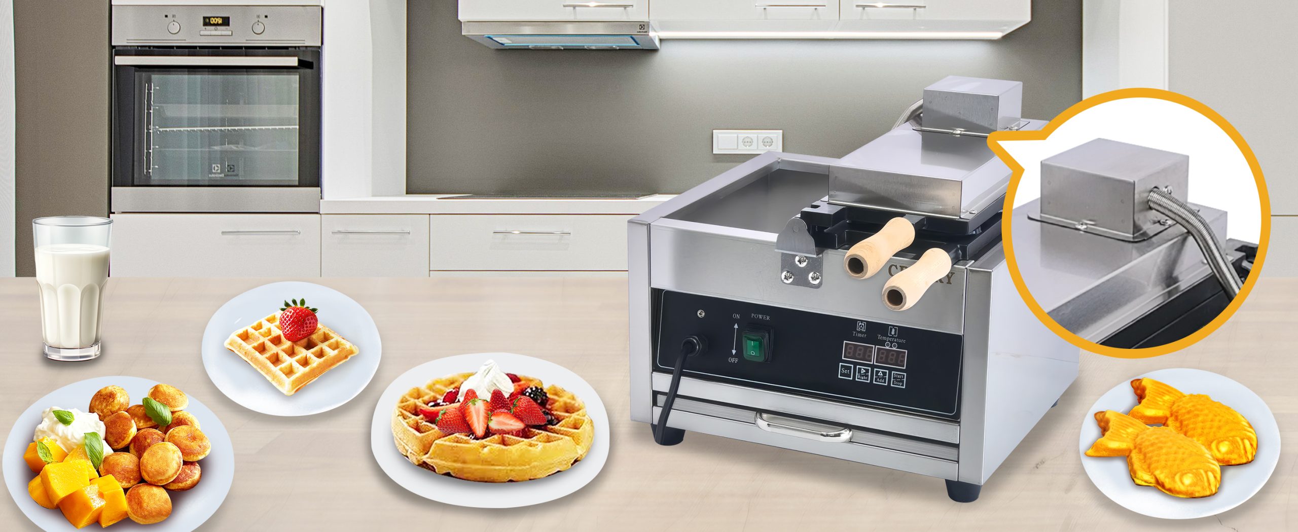 Smooth knobs for easy control of waffle maker. Temperature ranges from 50~300℃ with LED light showing heating status. Precise timer for up to 5 minutes’ period. Clear and melodious alarm when waffle is ready.