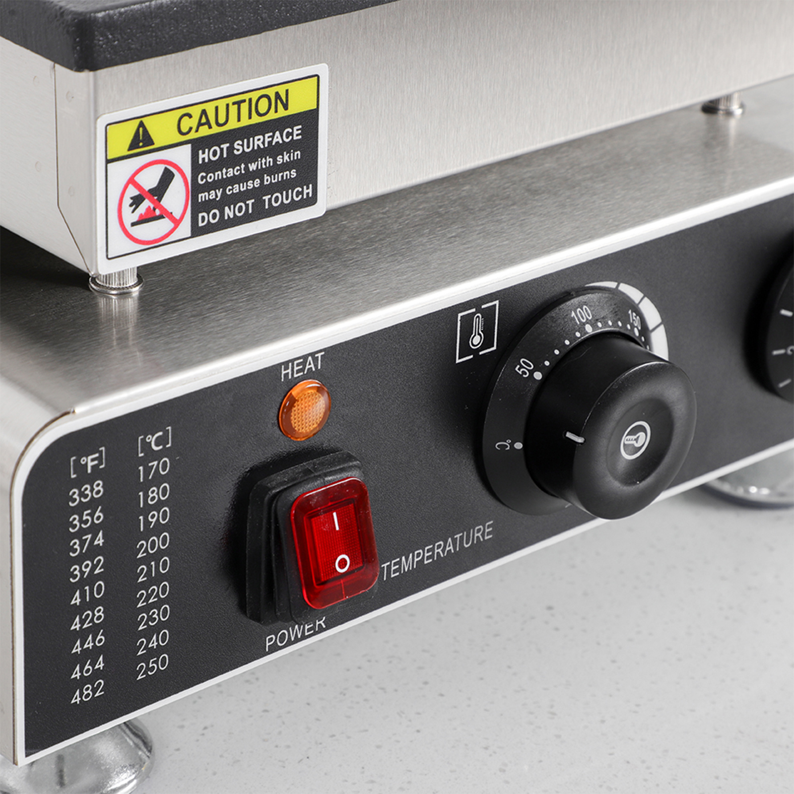 Smooth knobs for easy control of waffle maker. Temperature ranges from 50~300℃ with LED light showing heating status. Precise timer for up to 5 minutes’ period. Clear and melodious alarm when waffle is ready.