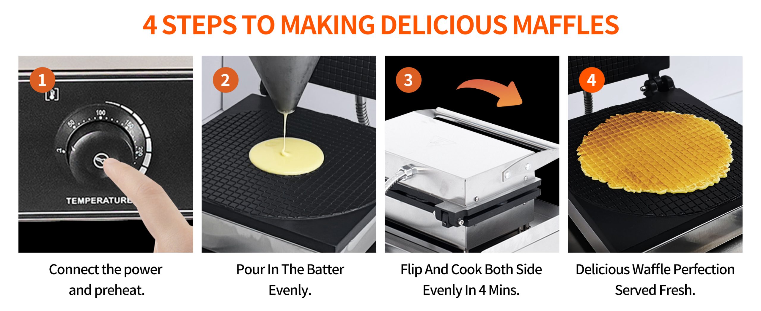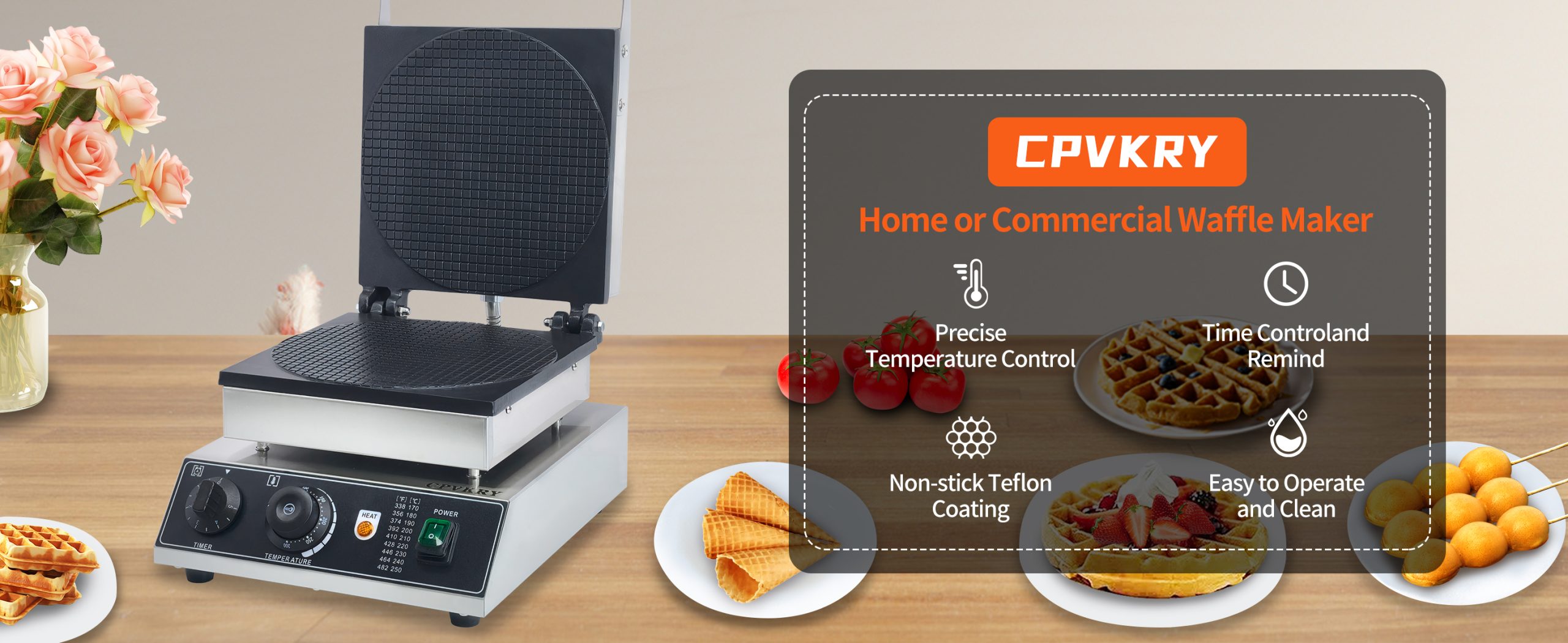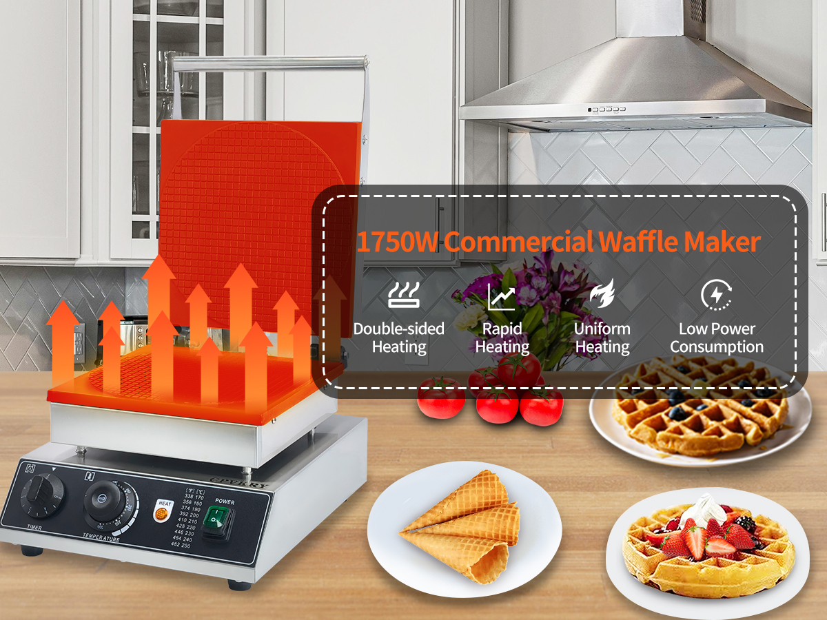 Smooth knobs for easy control of waffle maker. Temperature ranges from 50~300℃ with LED light showing heating status. Precise timer for up to 5 minutes’ period. Clear and melodious alarm when waffle is ready.