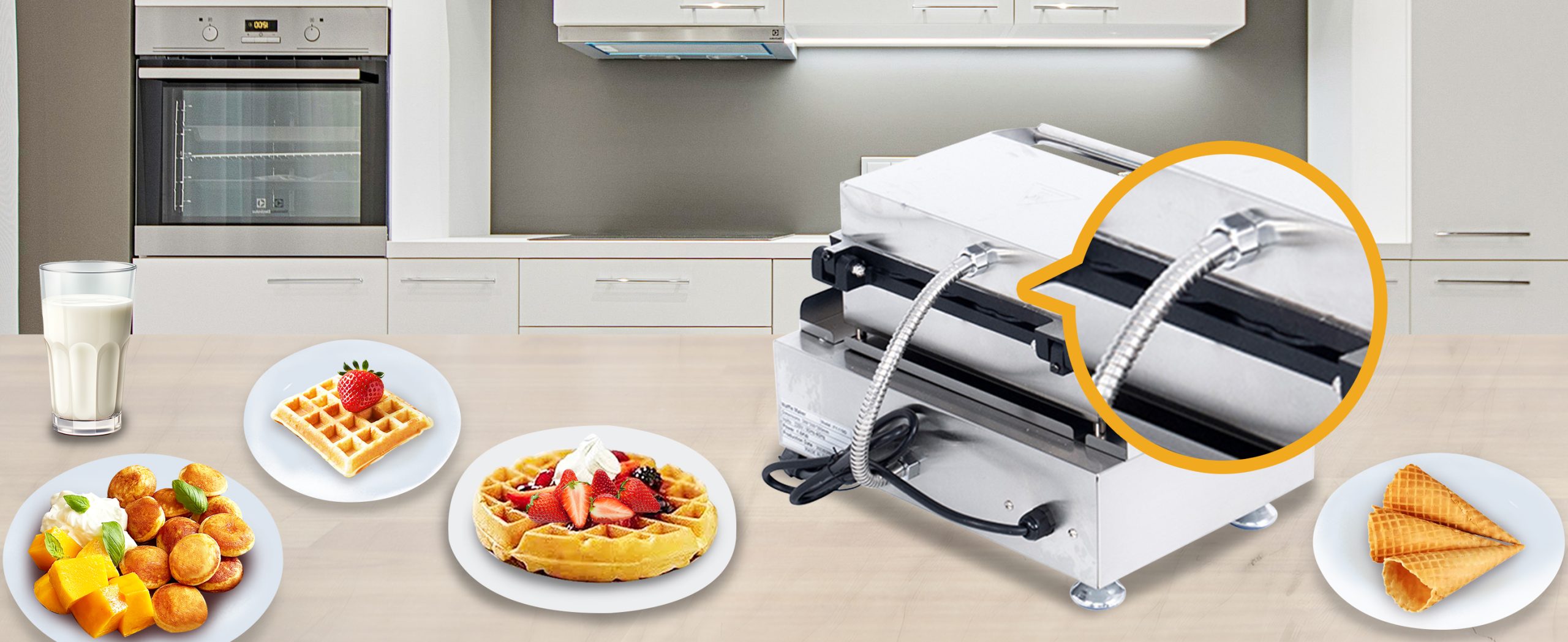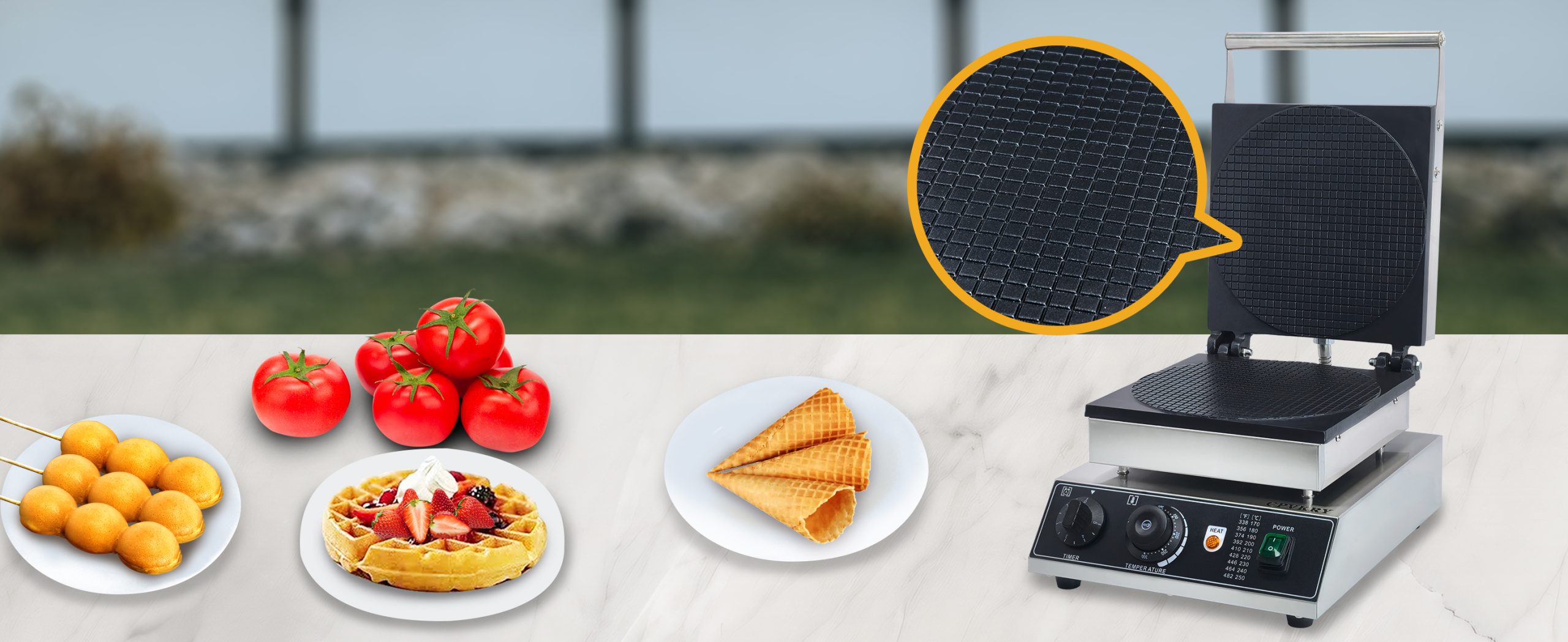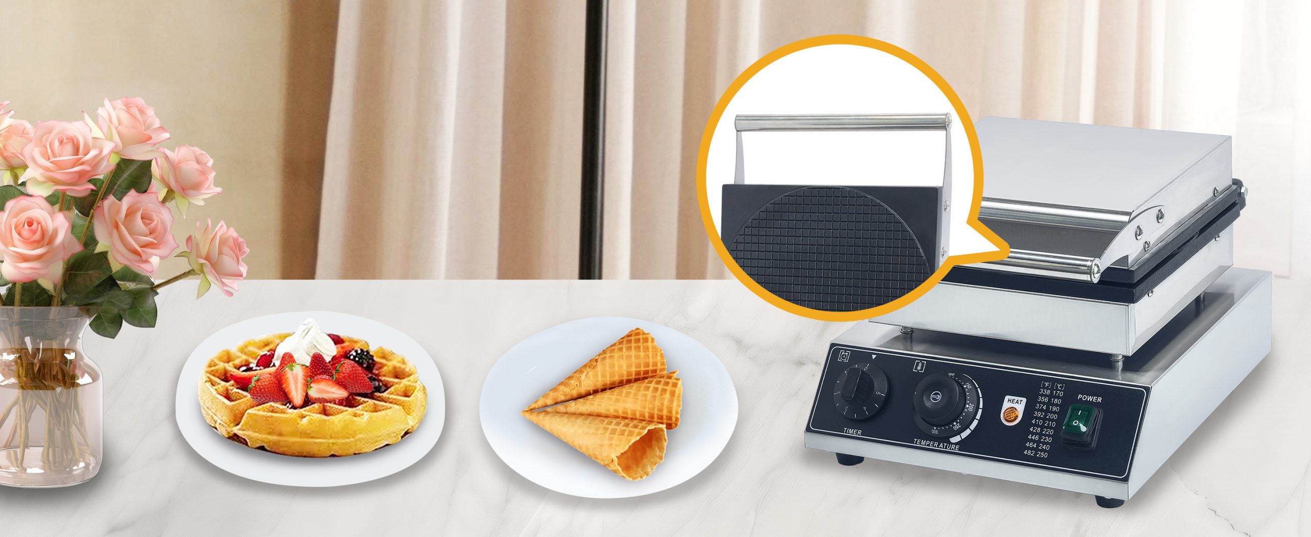 Smooth knobs for easy control of waffle maker. Temperature ranges from 50~300℃ with LED light showing heating status. Precise timer for up to 5 minutes’ period. Clear and melodious alarm when waffle is ready.