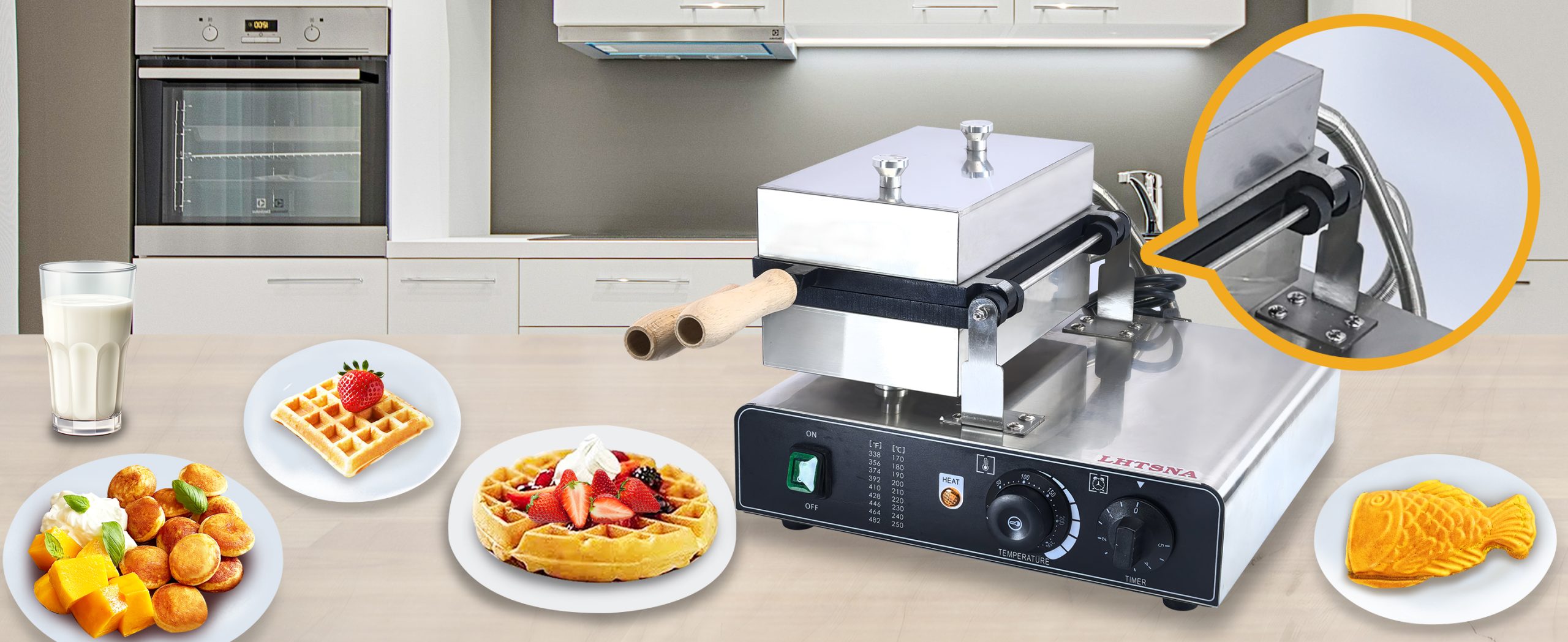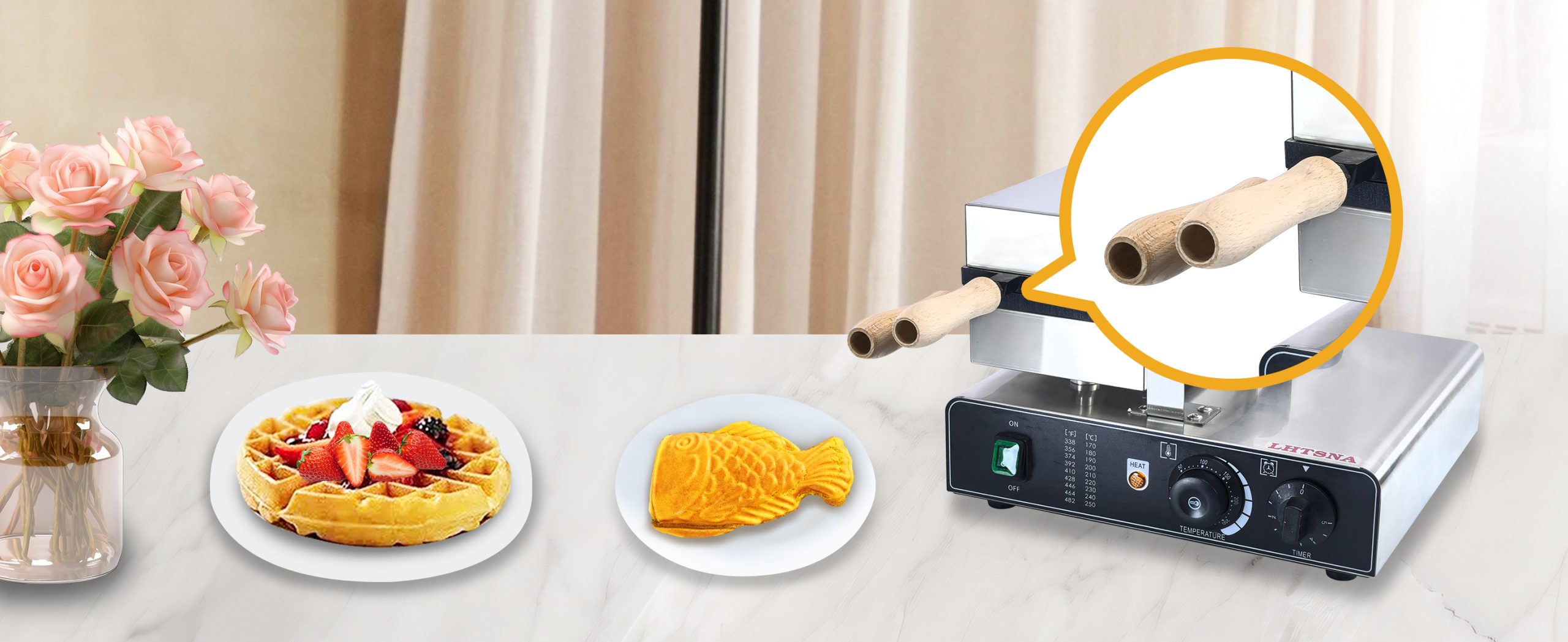 Smooth knobs for easy control of waffle maker. Temperature ranges from 50~300℃ with LED light showing heating status. Precise timer for up to 5 minutes’ period. Clear and melodious alarm when waffle is ready.