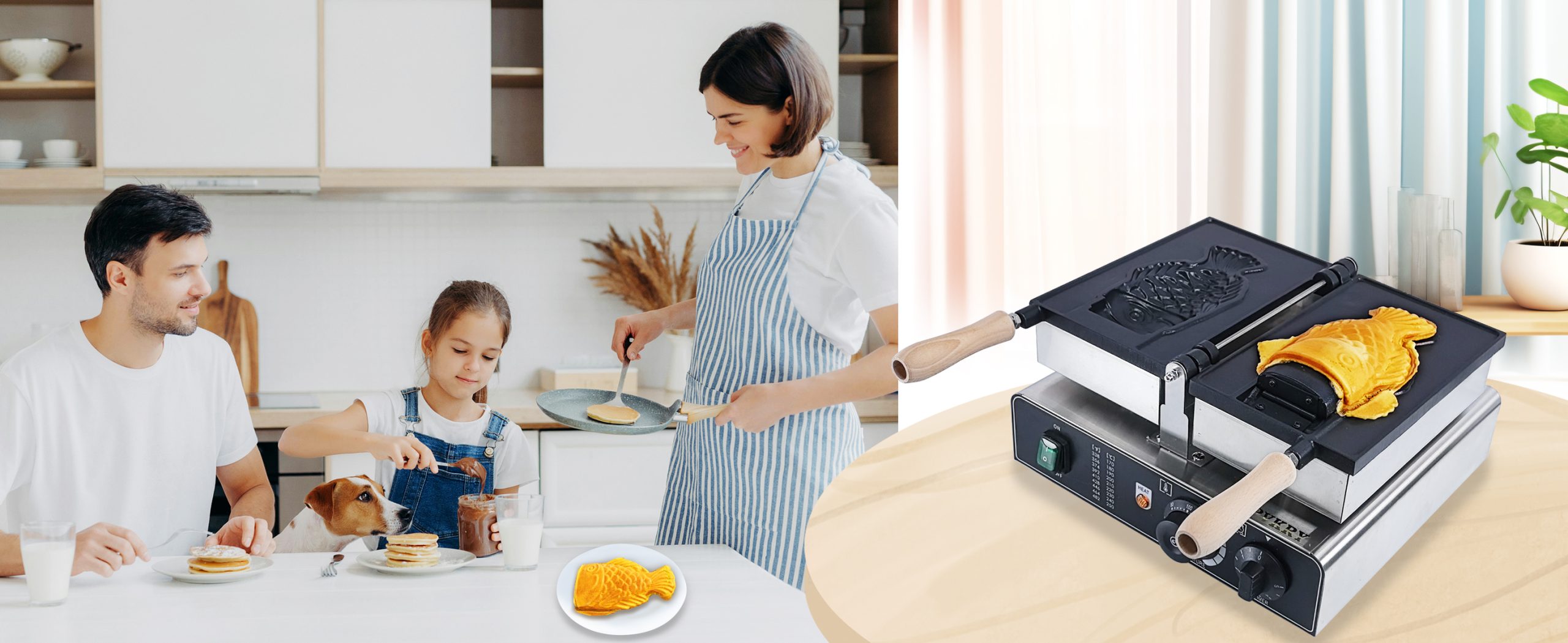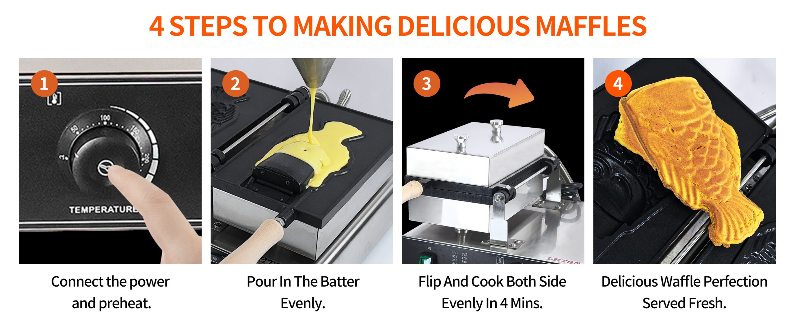 Baking delicious Japanese coin shaped waffles. This commercial grade waffle machine is getting extremely popular all over the world because of its high efficiency and excellent results. Baking tasty jam or ice cream waffles with independent heat control extremely easy.